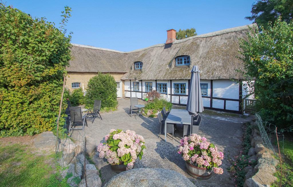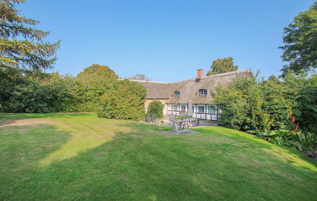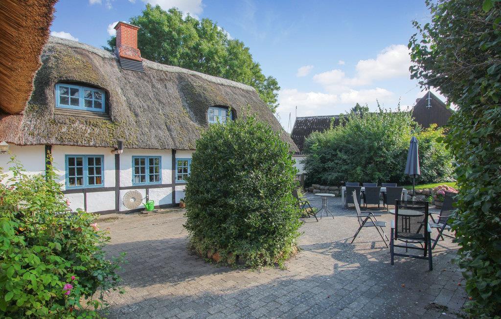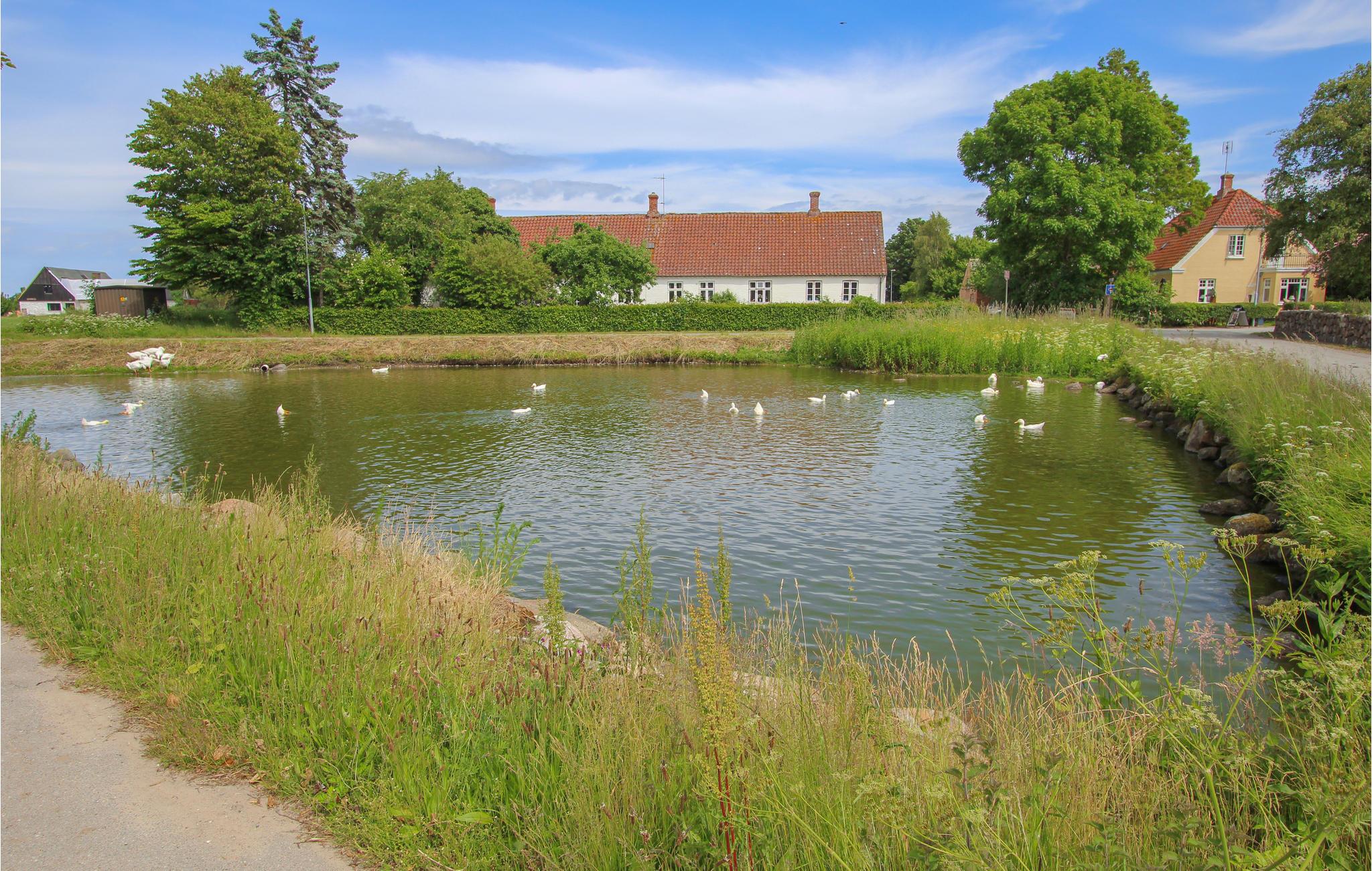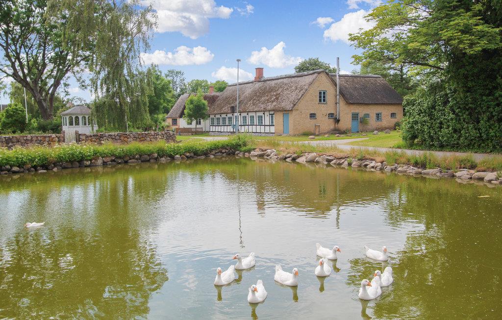 Det indbydende sommerhus med stråtag byder jer velkommen på en smuk beliggenhed ved landsbyens dam. Husets er indrettet med smagfuldt design, hvor moderne og traditionelle elementer indgår i en vellykket blanding. En familie med børn vil føle sig hjemme her, og jeres firbenede ven kan også komme med på ferie. Nyd måltiderne sammen og de dejlige aftener med de knitrende flammer i brændeovnen.