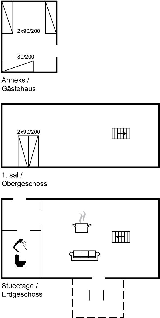Der er i alt 2 soveværelser. Sovepladserne fordeler sig på: 2 sovepladser i dobbeltseng. 3 sovepladser i enkeltsenge. 3 af disse sovepladser befinder sig i anneks.