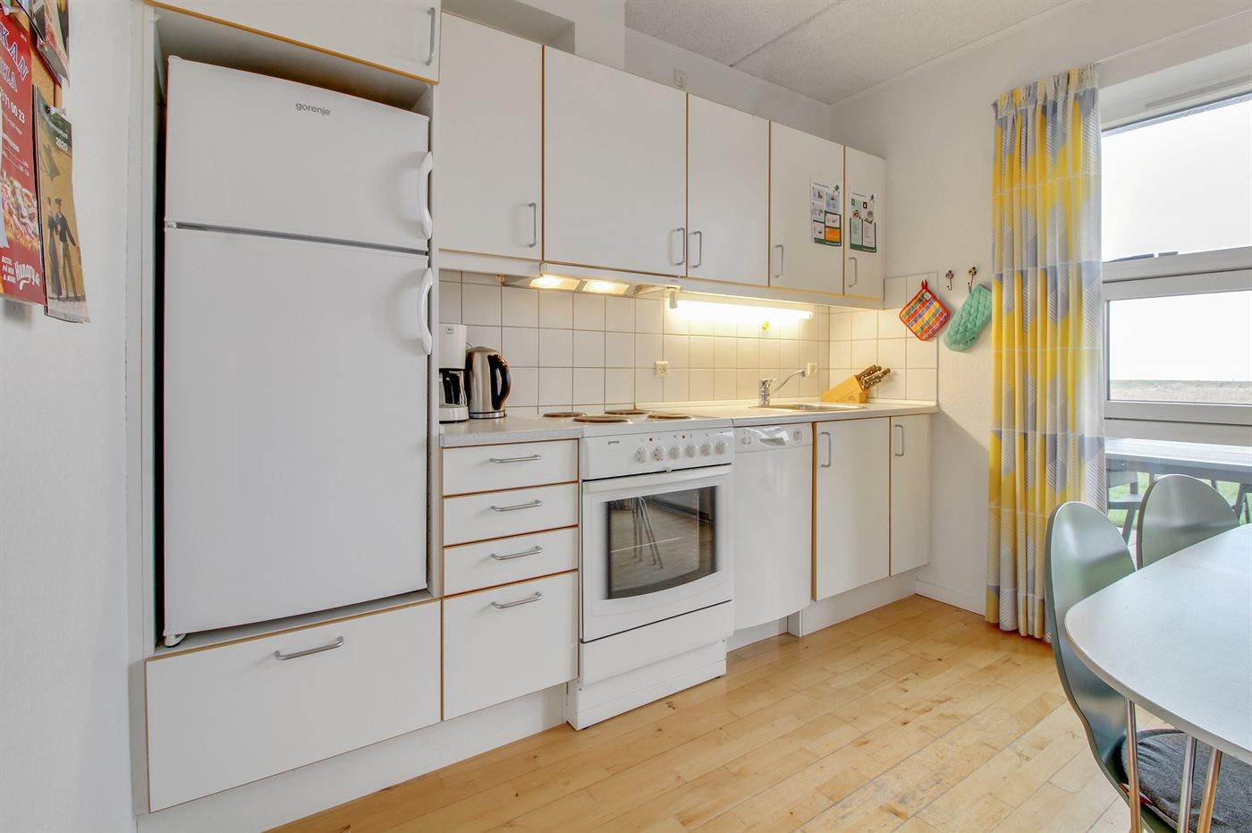 Køkkenet er udstyret med 1 køleskab. Der er 4 elkogeplader, bageovn samt opvaskemaskine.