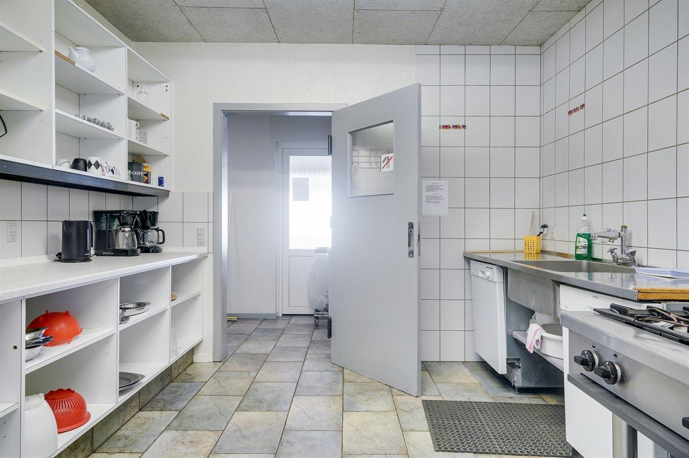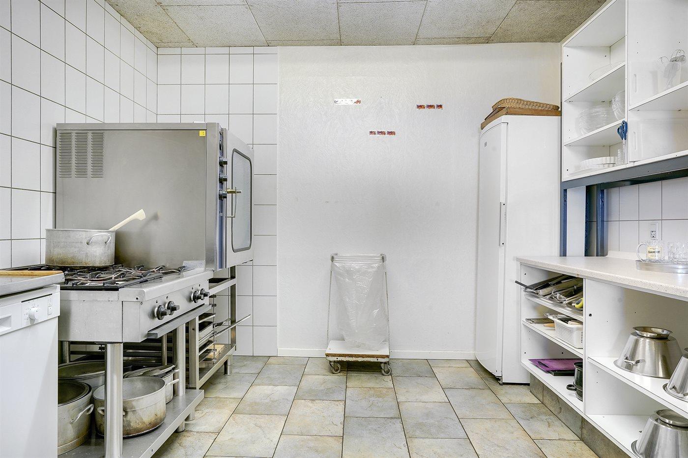 Køkkenet er udstyret med 2 køleskabe. Der er 4 gasblus, varmluftovn samt 2 opvaskemaskiner.