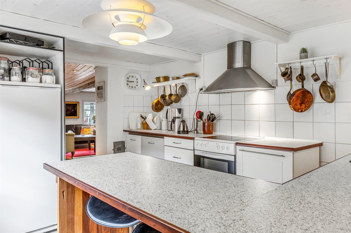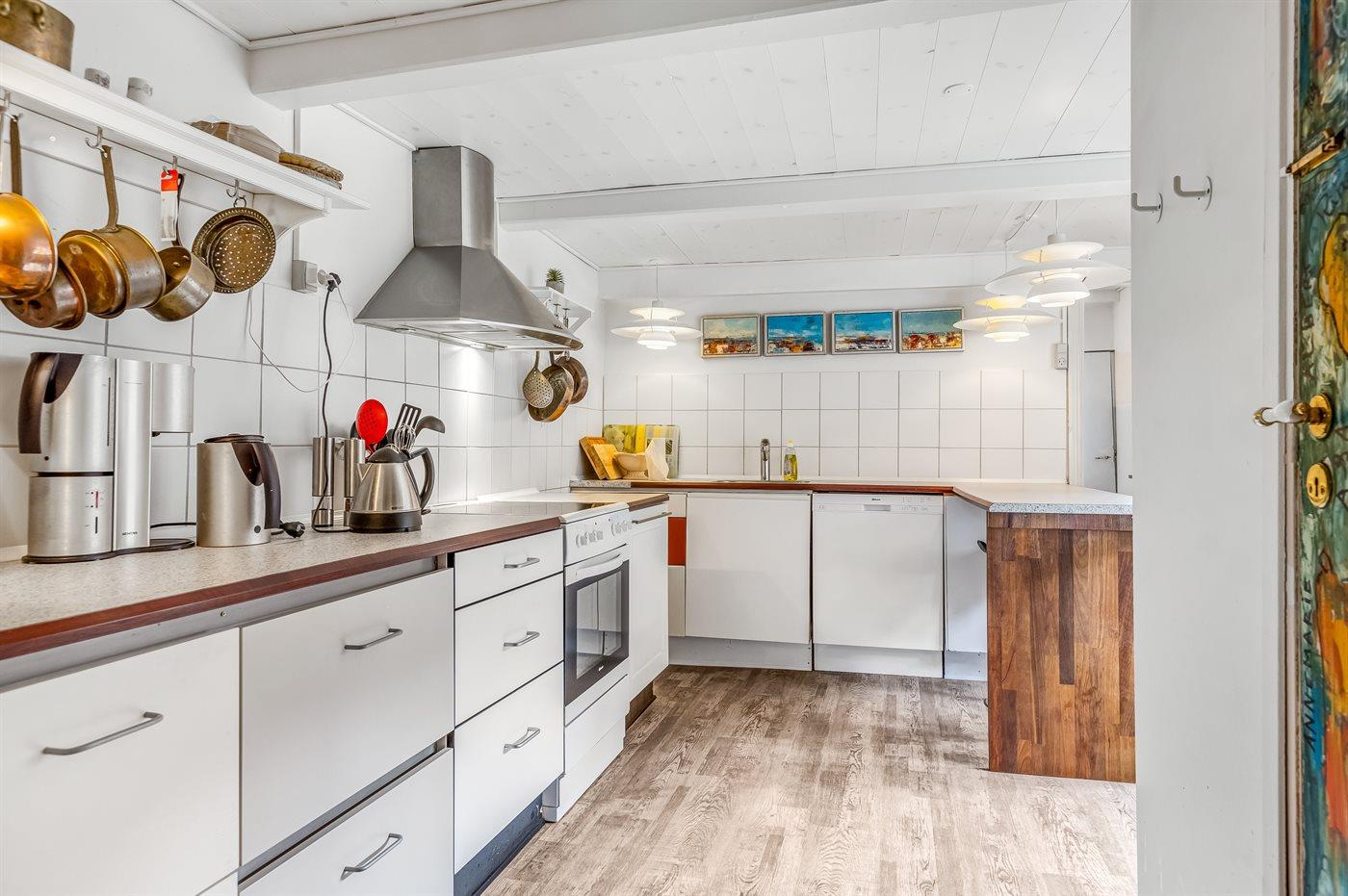 Køkkenet er udstyret med 1 køleskab. Der er 4 keramiske kogeplader, varmluftovn, mikrobølgeovn samt opvaskemaskine.