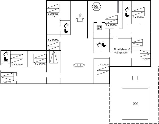 Der er i alt 11 soveværelser. Sovepladserne fordeler sig på: 22 sovepladser i dobbeltsenge. 2 sovepladser i køjeseng.