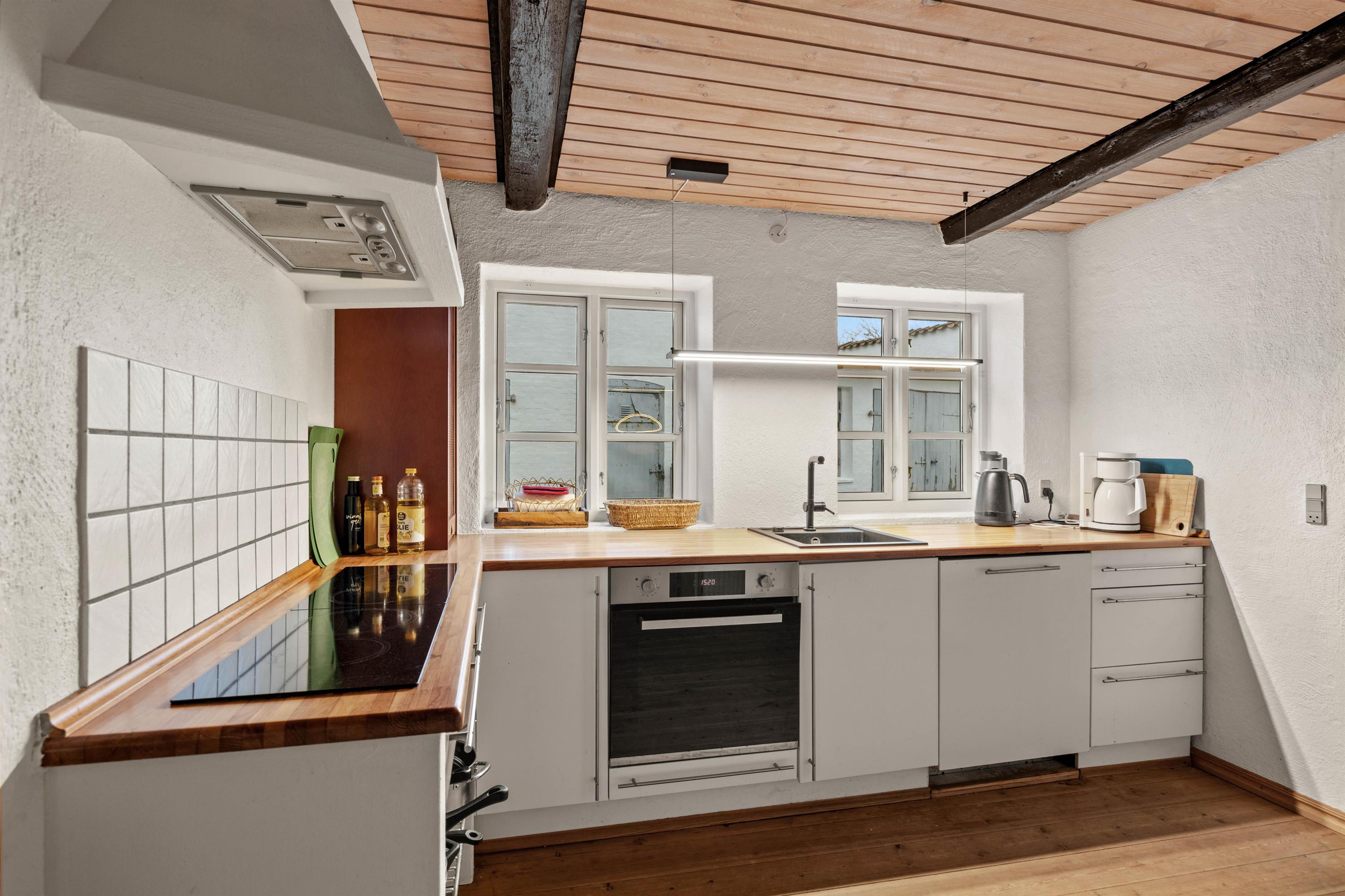 Sommerhuset er udstyret med moderne faciliteter, der gør opholdet både nemt og behageligt. Det veludstyrede køkken indbyder til fælles madlavning, og både opvaskemaskine samt vaskemaskine og tørretumbler gør hverdagen mere bekvem. Med 2 badeværelser er sommerhuset særligt velegnet til større selskaber. I stuen skaber brændeovnen en varm og hyggelig atmosfære på køligere dage – perfekt til afslapning efter en oplevelsesrig dag.