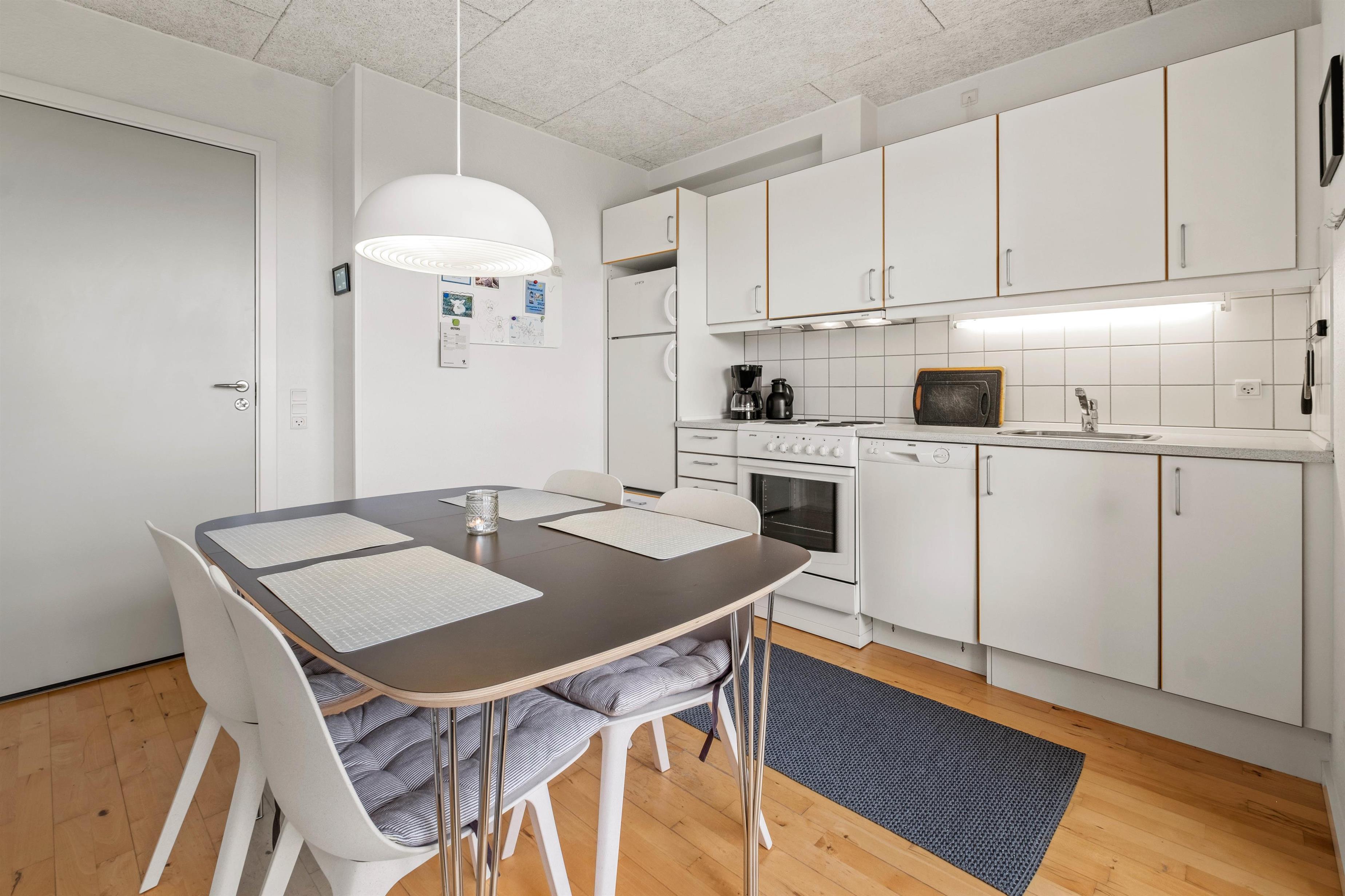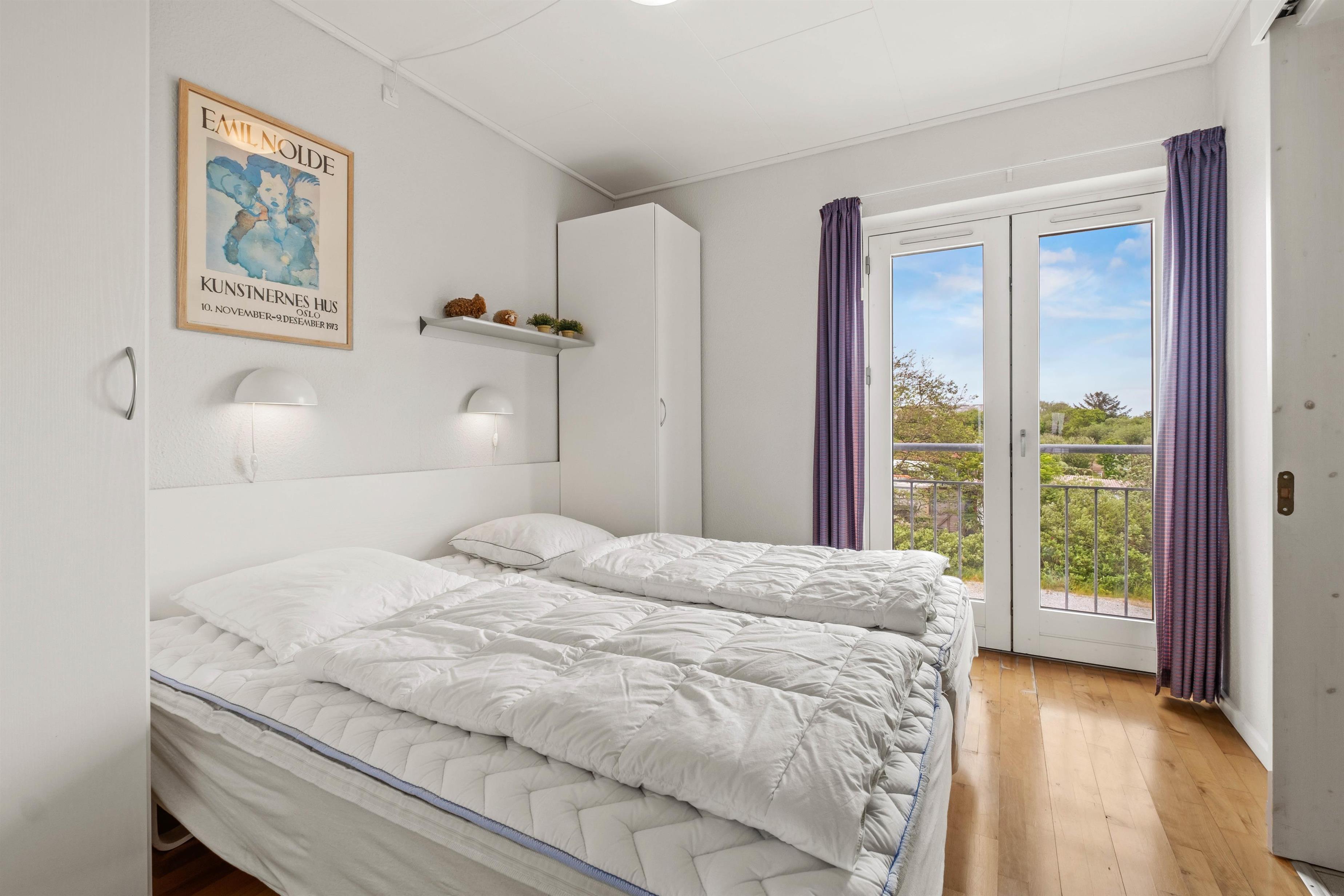 I stueetagen af lejligheden finder du et lyst køkken med blandt andet opvaskemaskine og fryser samt spiseplads. Herfra kan du gå ud på den overdækkede terrasse. Den hyggelige stue ligger på første sal, og herfra samt fra altanen har du en betagende udsigt over Vadehavet. På første sal er der et soveværelse med en komfortabel dobbeltseng. I stueetagen er der et hyggeligt soveværelse med en dobbelt sovesofa, som kan bruges som opholdsrum af de mindre rejsende i løbet af dagen. Der er plads til i alt 4 personer.