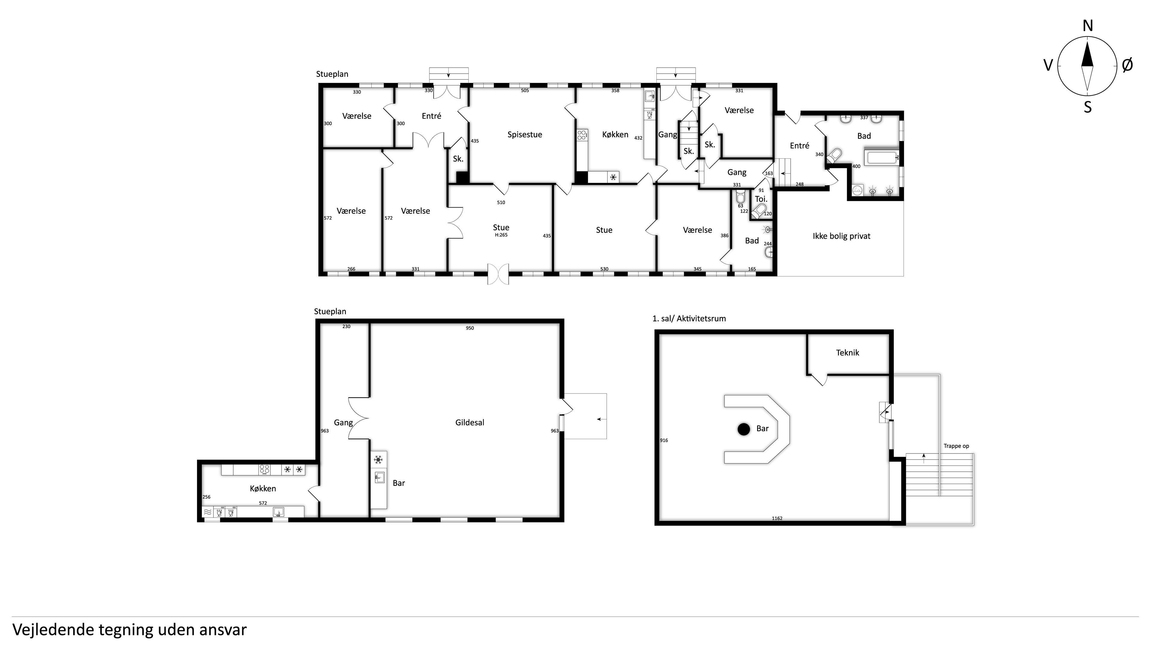 230 m2 stuehus ? 120 m2 aftægtsbolig ? 100 m2 aktivitetsrum ? 175 m2 gildesal/multirum med køkken og 2 badeværelser ? 4.700 m2. have med 2,25 meters vildmarksbad, 3,5 meters tøndesauna og 12-personeres grillhytte ? 30 kw DC hurtiglader til elbil