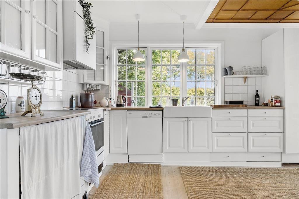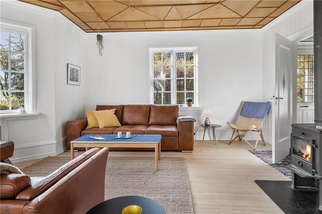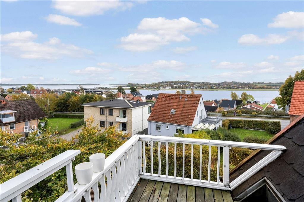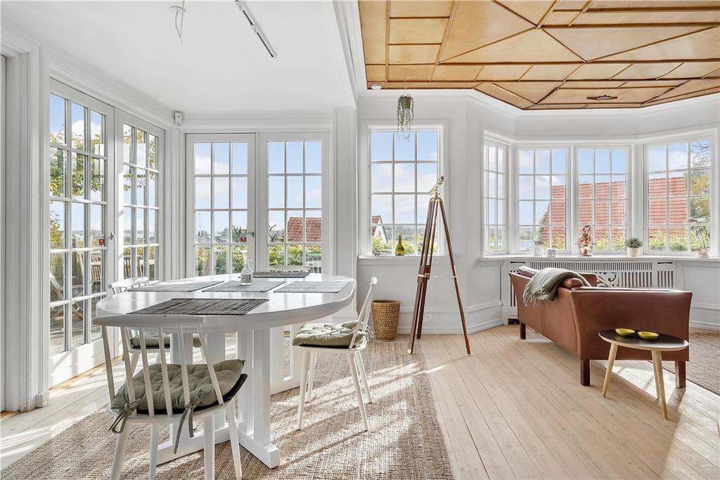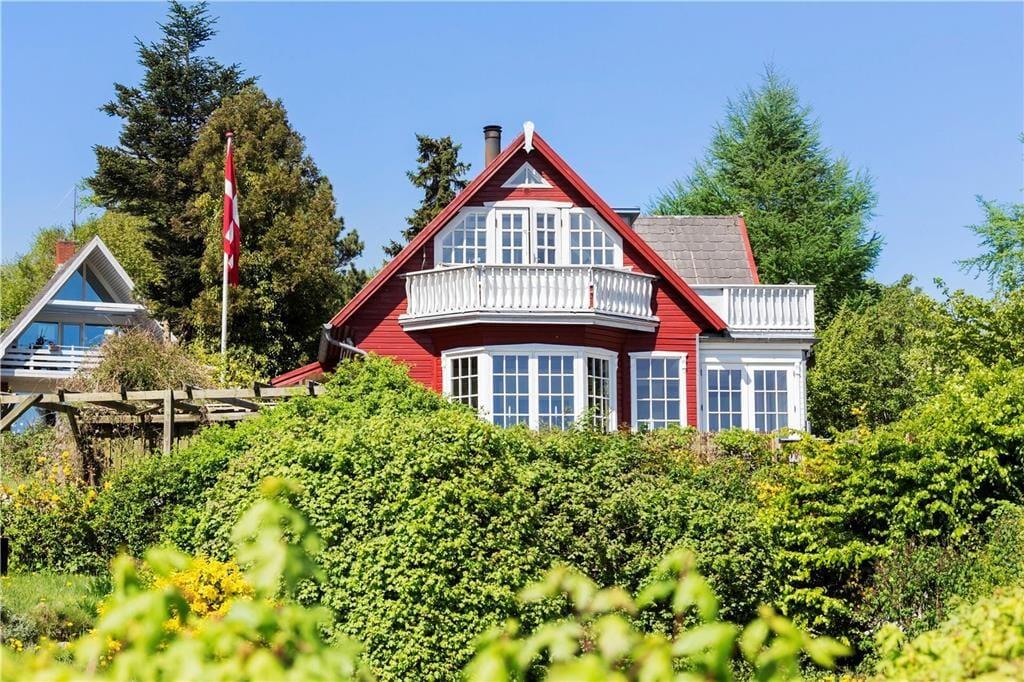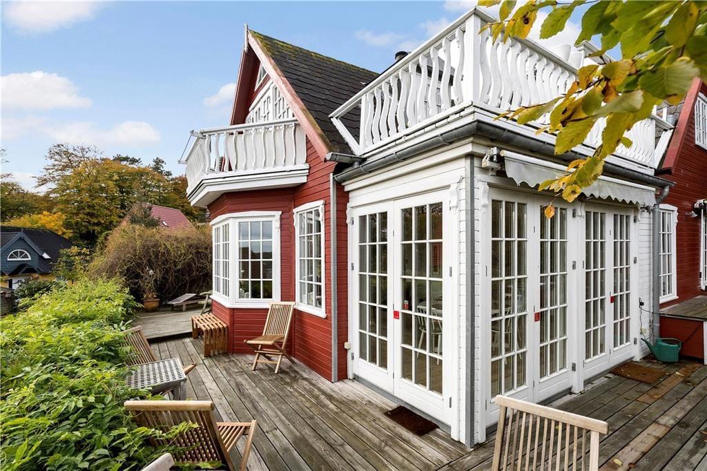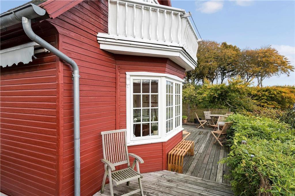 Huset ligger højt i landskabet på en fredelig vej og emmer af charme med sin rødmalede træfacade, hvide sprossevinduer, gavlkviste og træornamentik. Her mærker man med det samme, at der er tale om et hus med en helt særlig sjæl. Indenfor er der utroligt lyst, og udsigten gennem de mange vinduespartier er betagende. Det mærker man særligt i den smukke opholdsstue med brændeovn, hvorfra der også er direkte udgang til solrig terrasse. Køkkenet lever med sin landlige stil fuldt op til den idylliske stemning, og overalt mærker man, at renoveringen er foretaget med respekt for den oprindelige stil. På førstesalen er der hyggelige skråvægge, og her kan I se frem til en udsigt, der er om muligt endnu mere imponerende.