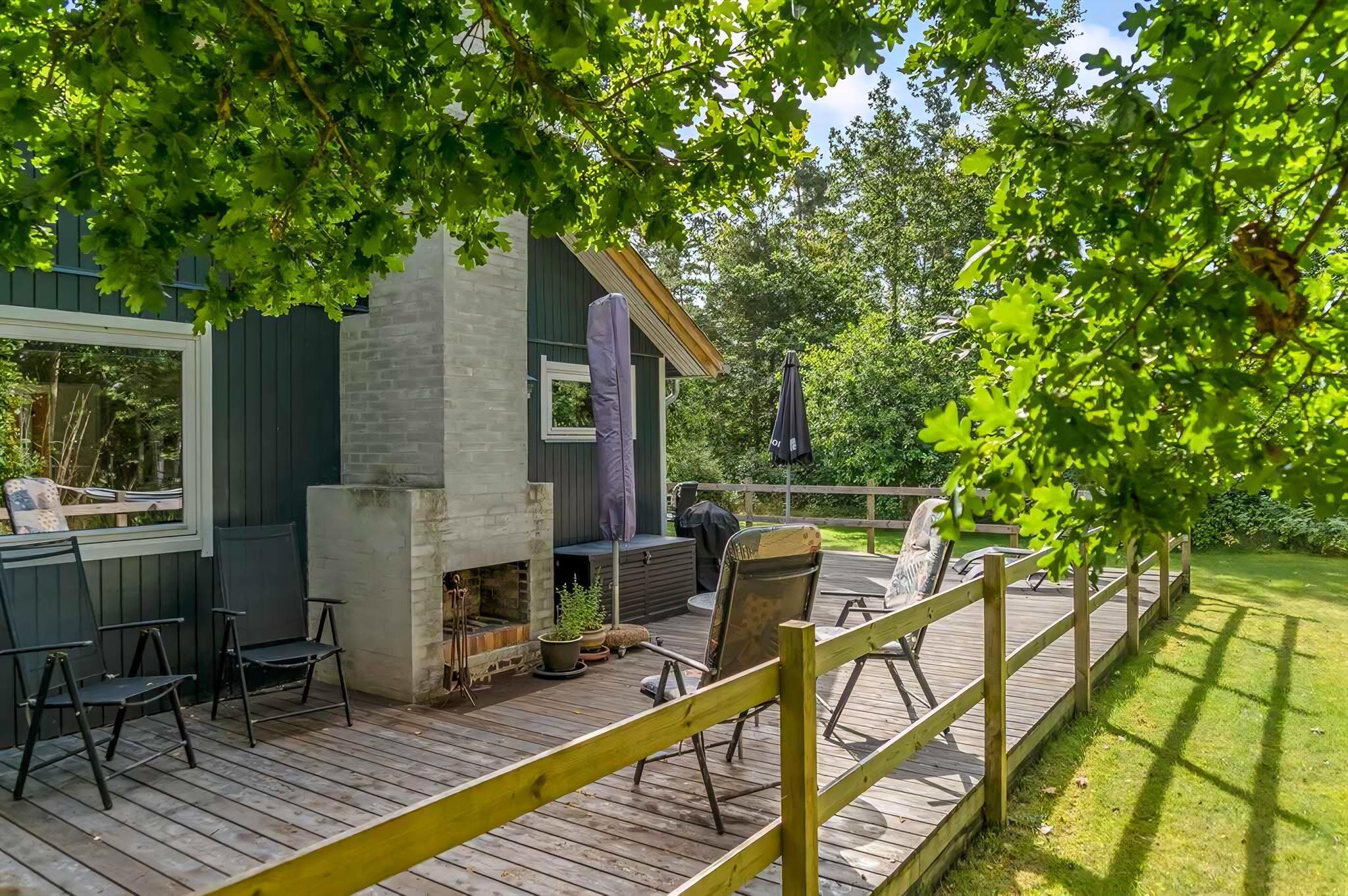 Hyggeligt feriehus i skoven nær hav og fjord med stor terrasse og moderne faciliteter.