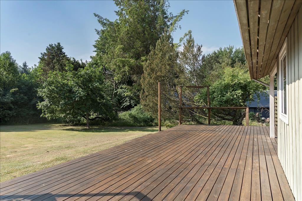 Den store naturgrund byder på en grøn græsplæne, perfekt til havespil og afslapning under åben himmel. Hovedhuset har en stor træterrasse, hvor du kan nyde måltider i det fri eller lade dagens sidste solstråler varme dig. Ved annekset findes en hyggelig, overdækket terrasse, hvor du kan trække dig tilbage med en kop kaffe, selv når vejret er lidt køligere. Til bilen er der en praktisk carport, så du altid kan parkere i skyggen på varme sommerdage.