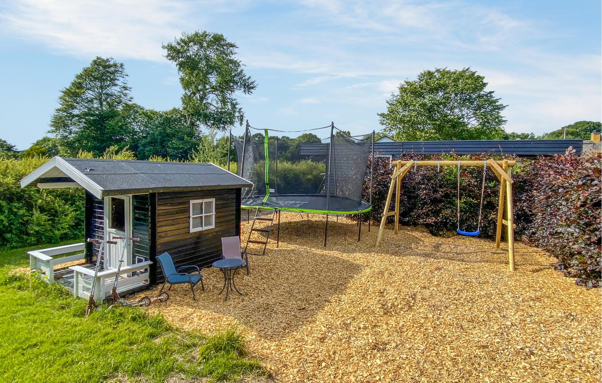 I haven er der også flere dejlige steder at slappe af. Nyd de grønne omgivelser, hyg jer med boldspil på græsplænen og fyld lungerne med den friske luft. En gynge, trampolin, petanquebane og bålplads giver jer masser af muligheder for at lave aktiviteter sammen. Skulle vejret svigte, kan I snuppe et spil bordfodbold indendørs.