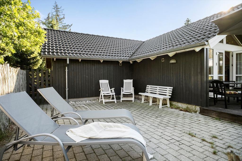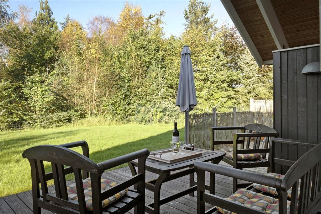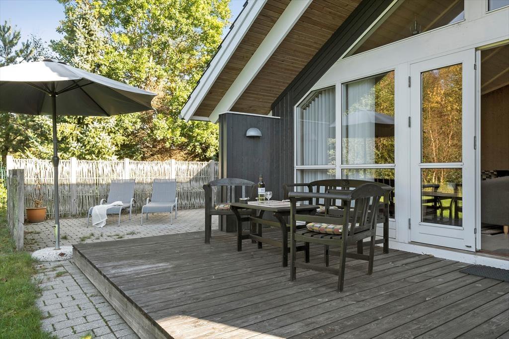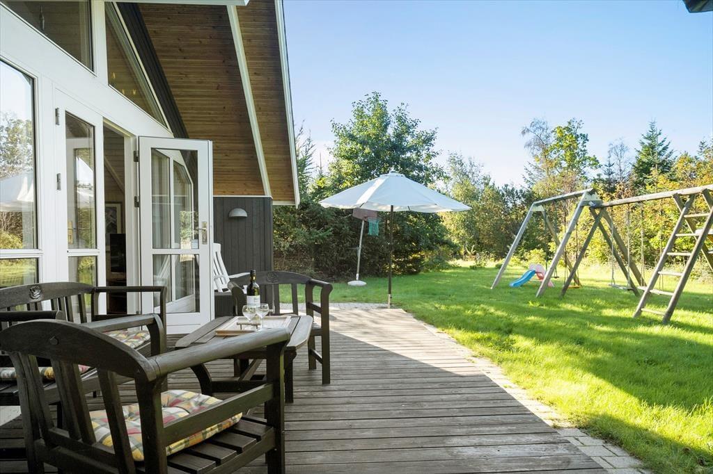 Fra stuen har I direkte adgang til en delvist overdækket træterrasse, der er orienteret mod sydvest og derfor godt i forhold til dagens sene solstråler. Derudover breder et fliseareal sig stort set hele vejen rundt om sommerhuset, sådet er nemt at finde enugeneret solkrog uanset solens placering på himlen. Der er for øvrigt god plads til at slænge sig og lege på græsplænen påden 1250 m2 store og helt aflukkede grund.