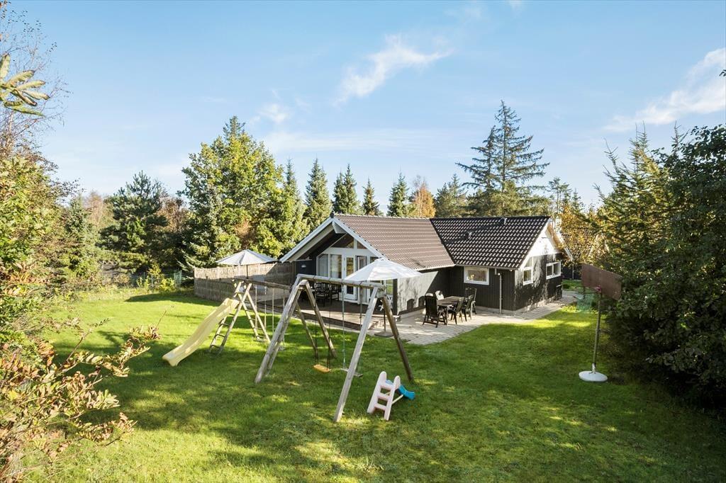 Velkommen til dette lyse, velholdte og særdeles indbydende sommerhus, der ligger i et lukket feriehusområde fåhundrede meter fra Bisnap Strand.