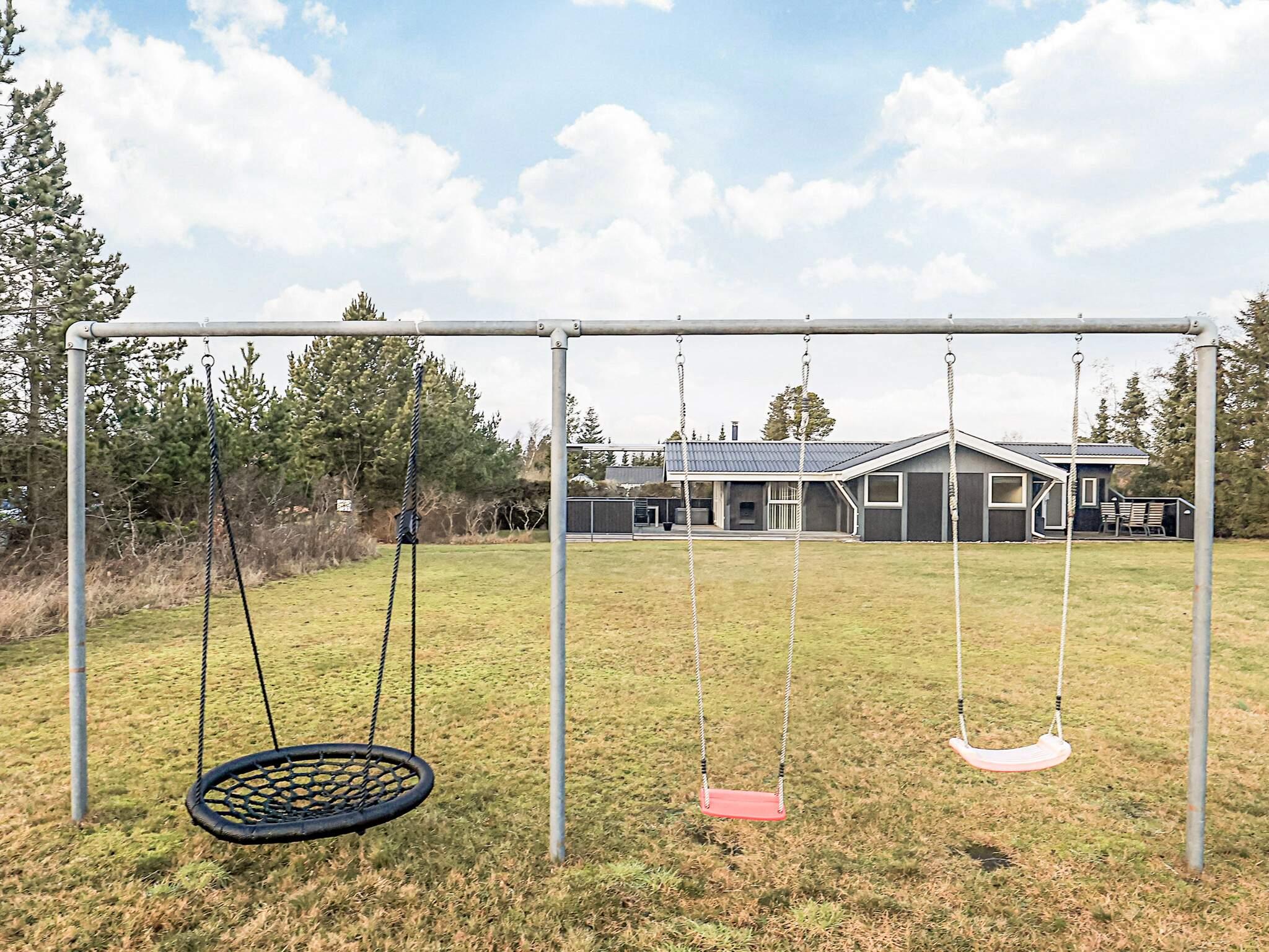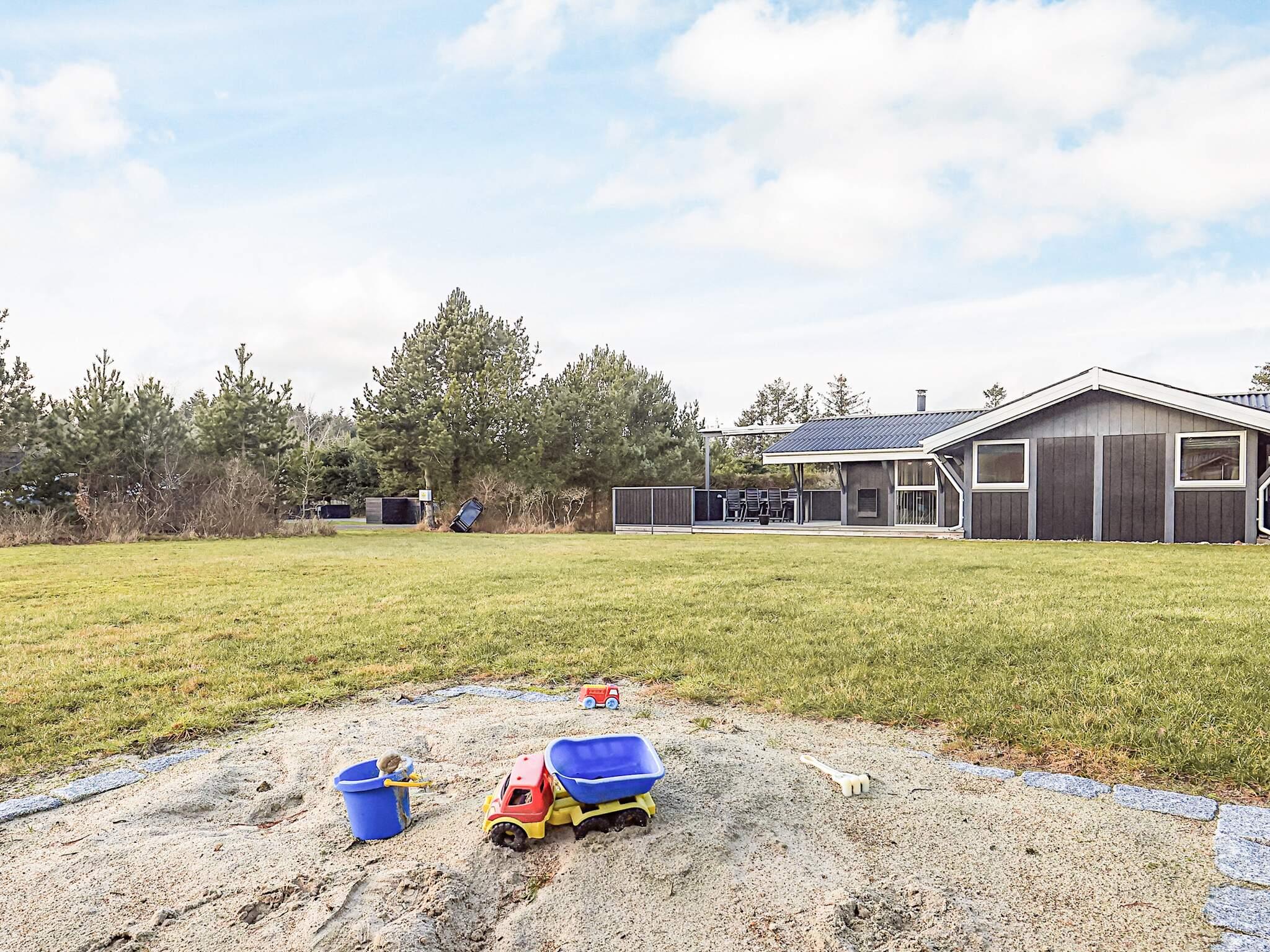 Sommerhus beliggende i roligt område. 5 m² stor sandkasse med lidt tilhørende legeredskaber. På den sydvendte terrasse er der 2 markiser, der kan rulles ud for at gøre den 10 m² overdækkede terrasse til 60 m² overdækket i stedet. Et hus, hvor der er fokus på kvalitet og komfort. Huset ligger ca. 500 meter fra områdets 18-hullers golfbane. Udlejes ikke til ungdomsgrupper.
