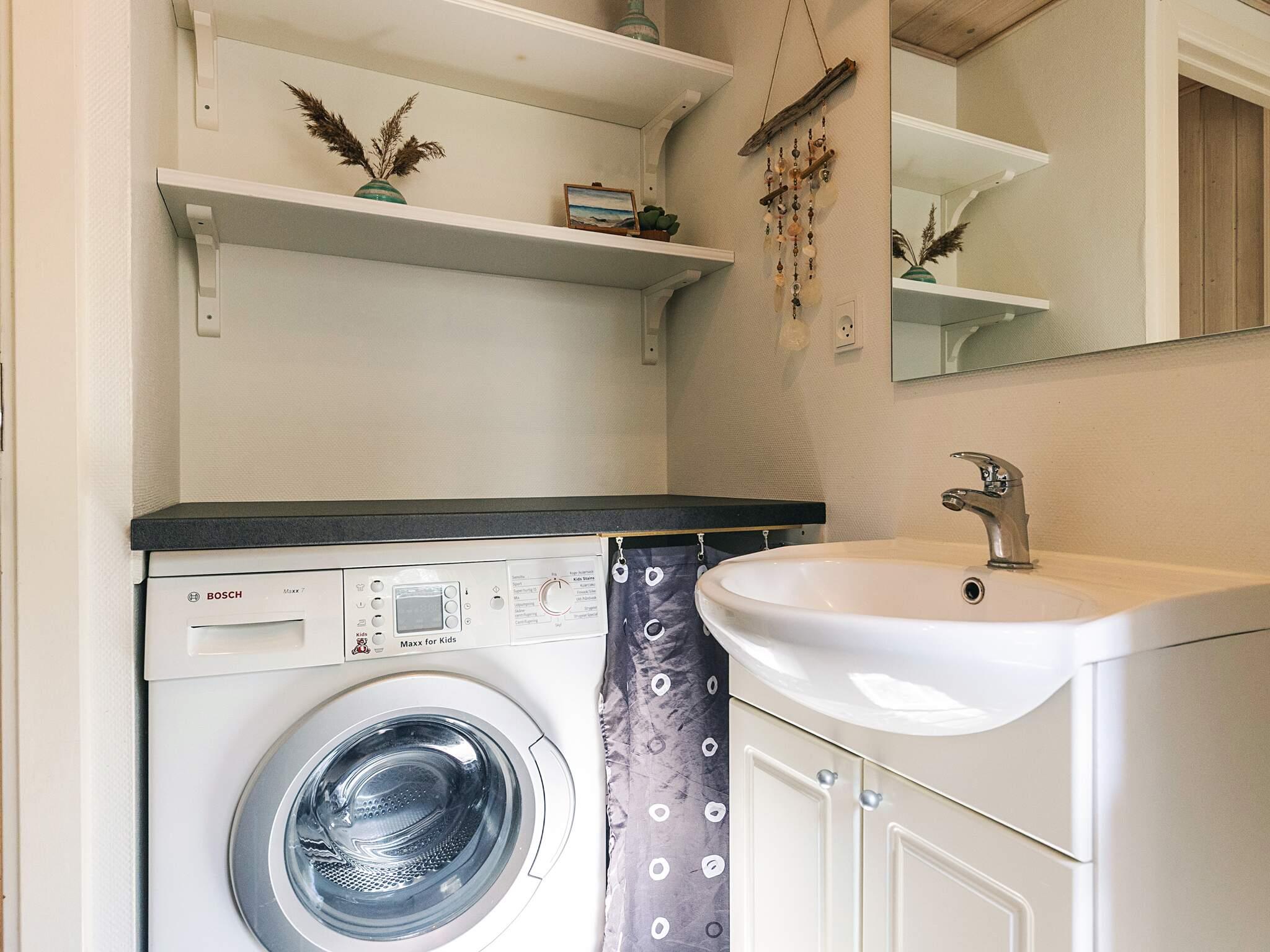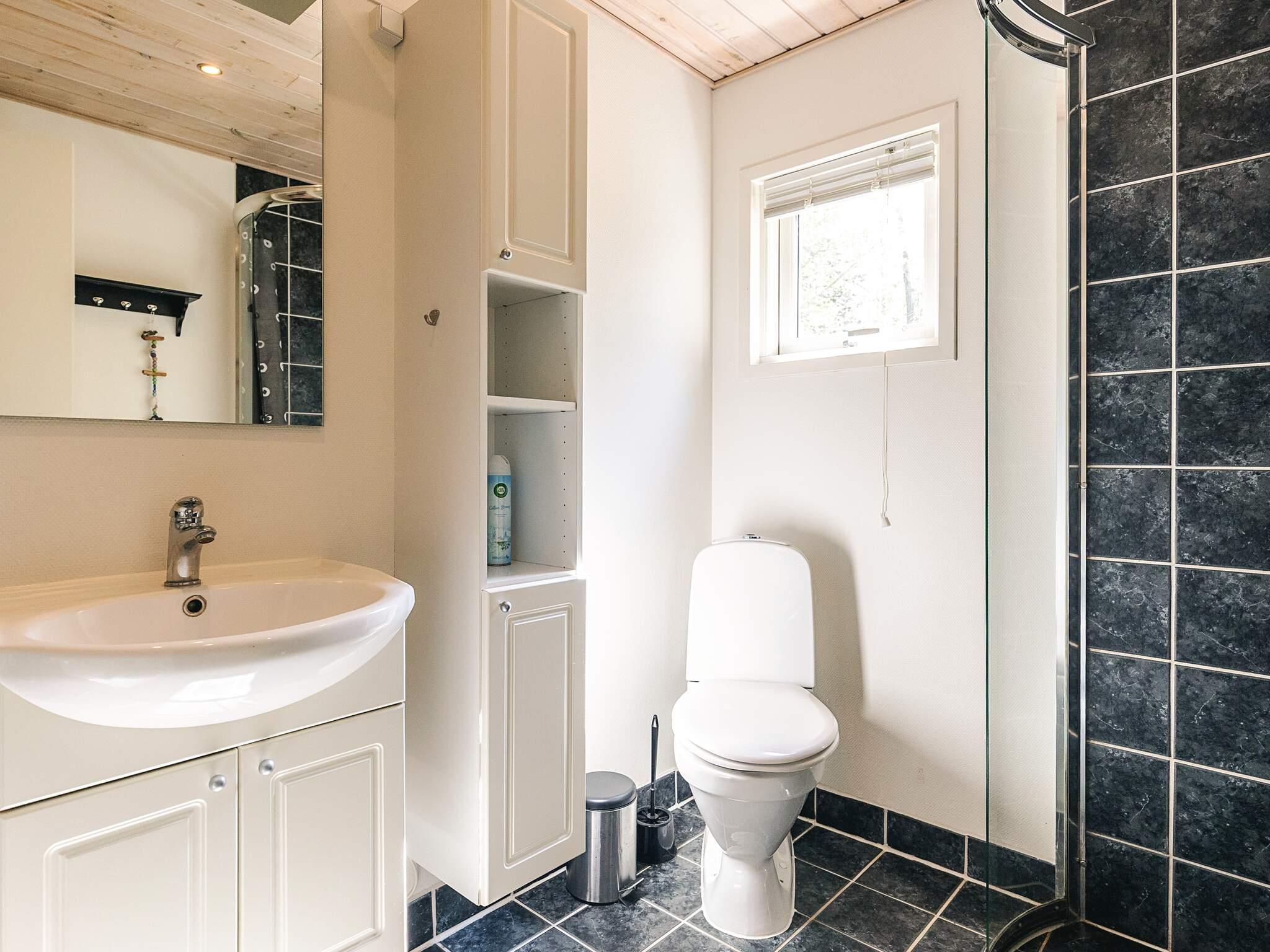 Badeværelset er lyst og funktionelt med toilet, håndvask, bruseniche og vaskemaskine. Udenfor finder I en dejlig terrasse med havemøbler, hvor I kan nyde solen eller grille på varme sommeraftener. Til børnene er der et sjovt legetårn med gynge, og de voksne kan slappe af i det skønne vildmarksbad.