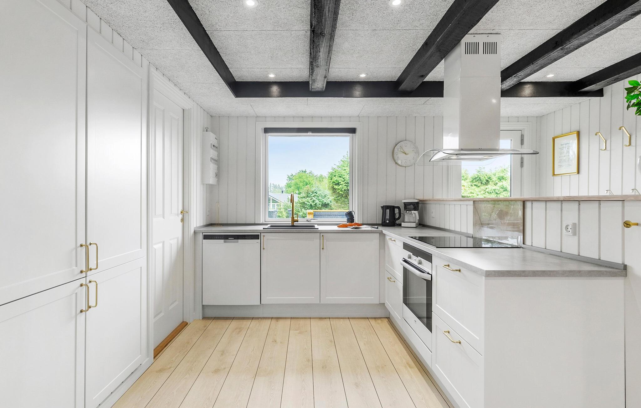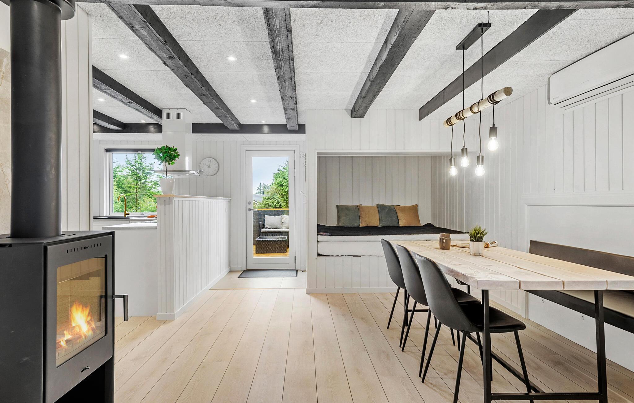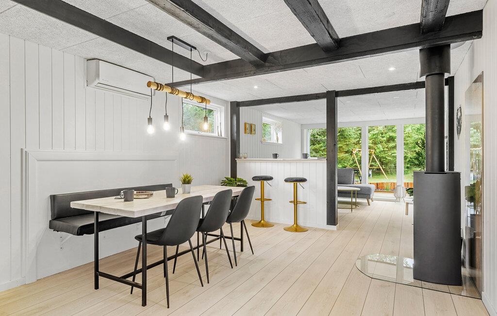 Beliggende i en velholdt have byder denne komfortable oase jer velkommen, hvor hele familien kan nyde en lys og venlig atmosfære. Dæk det stilfuldt oplyste spisebord, mens børnene læser en bog for hinanden i den hyggelige alkove. Lyt til den knitrende brændeovn under hyggelige måltider, og brug det indbydende sofaområde til sjove spilleaftener.