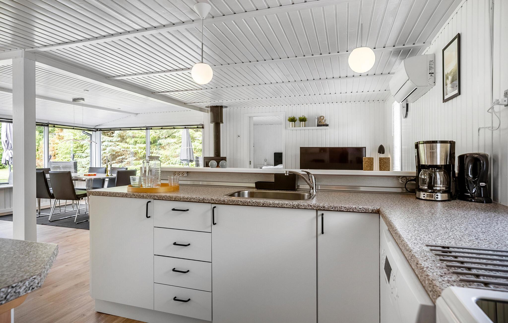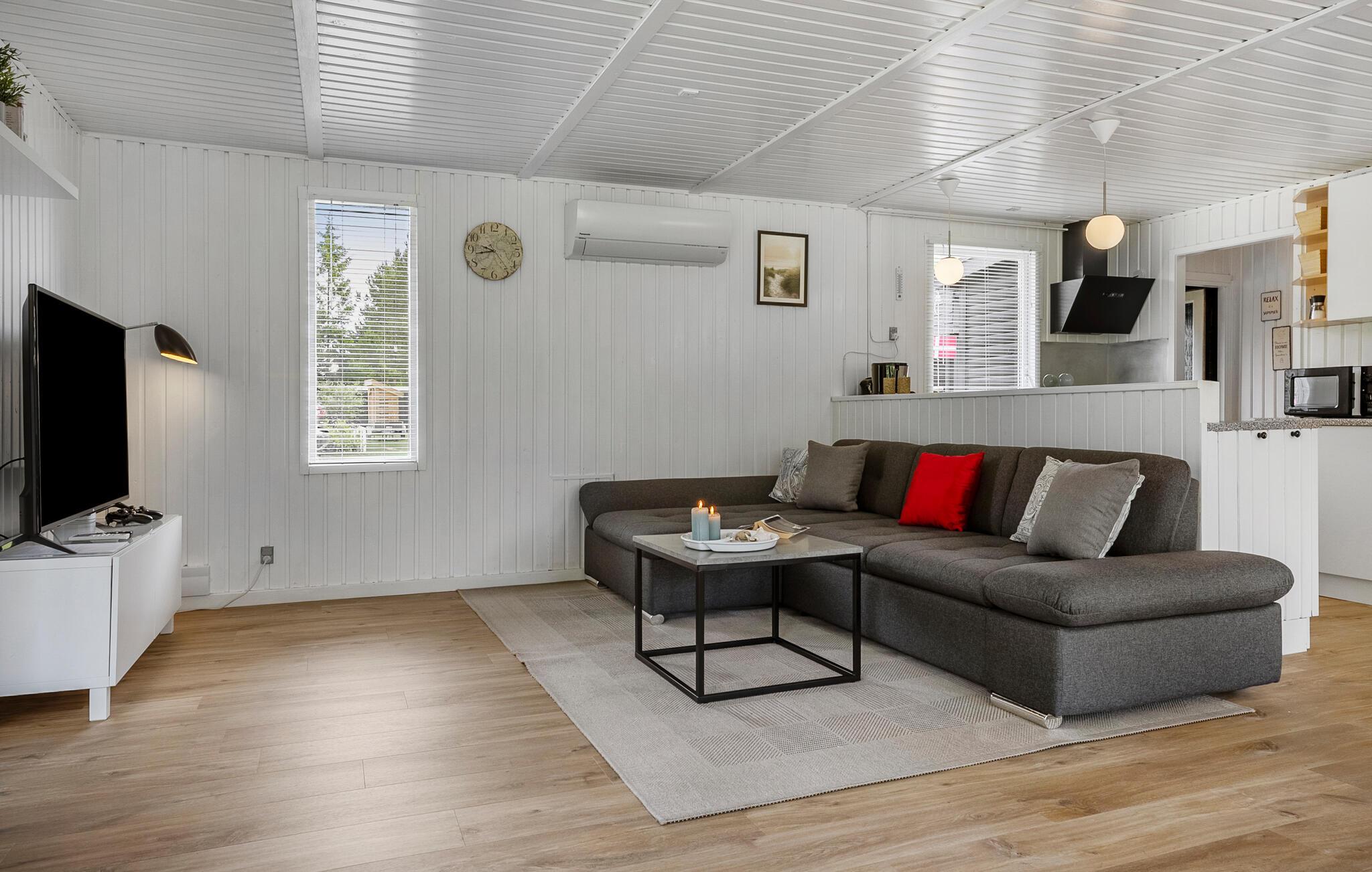 Dette komfortable feriehus i grønne omgivelser vil begejstre hele familien, for det byder både indendørs og udendørs på mange fine detaljer. Nyd jeres måltider med udsigt til haven, mens I lytter til det sagte knitren fra brændeovnen, spil PlayStation, eller stream en film, mens I hygger jer sammen i sofaen.