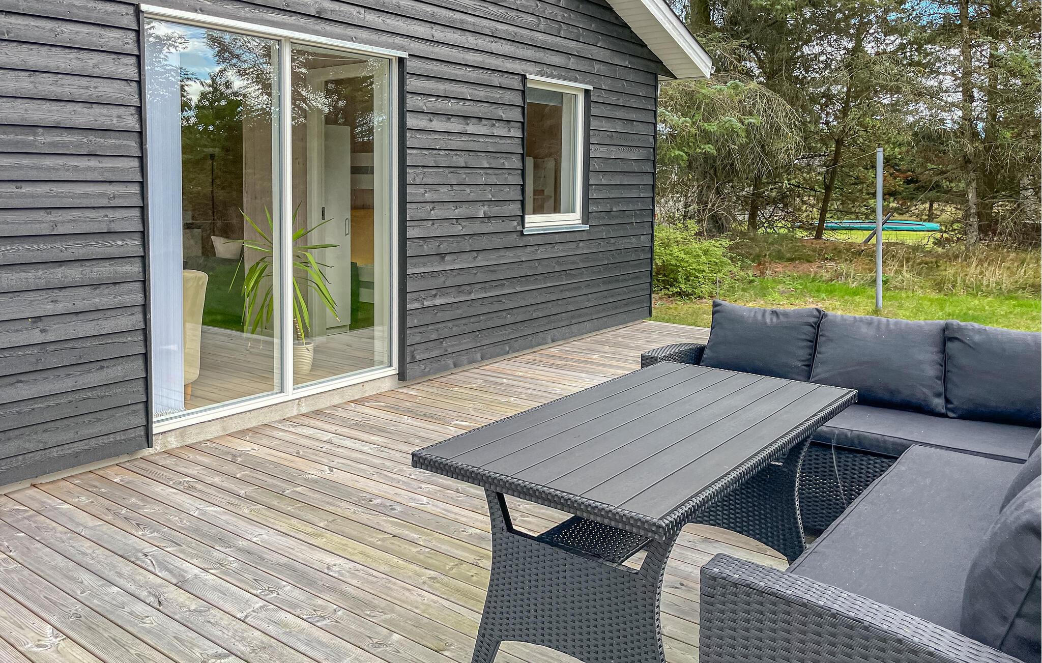 Udenfor venter en stor træterrasse med forskellige siddeområder. Nyd morgenmaden i morgensolen, slap af på liggestolene eller afslut dagen med en grill. Den store, velholdte græsplæne giver børnene plads til at lege og løbe rundt, mens voksne kan slappe af på loungesættet.