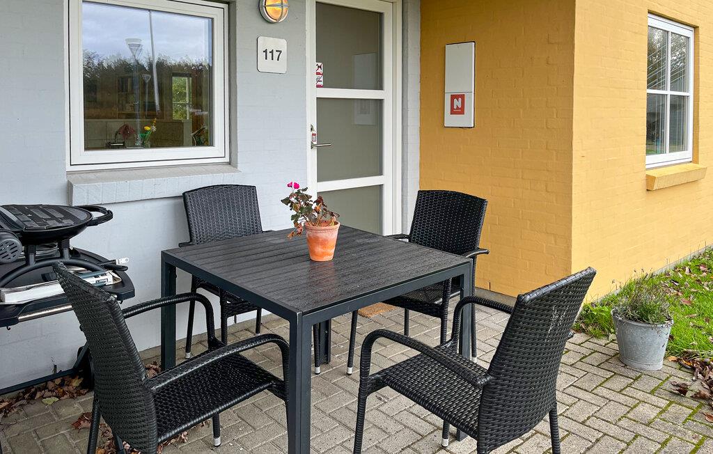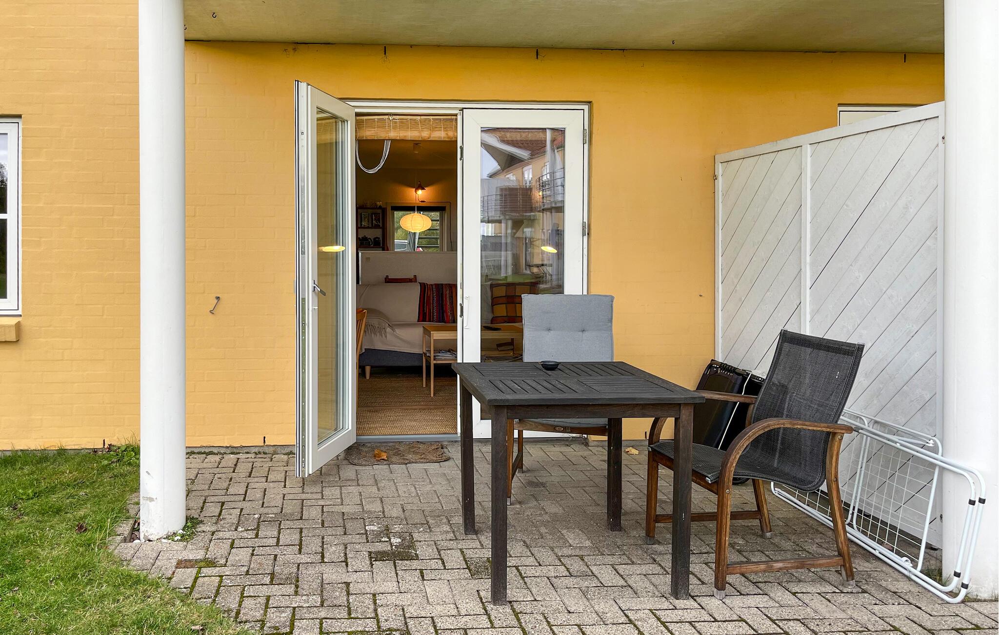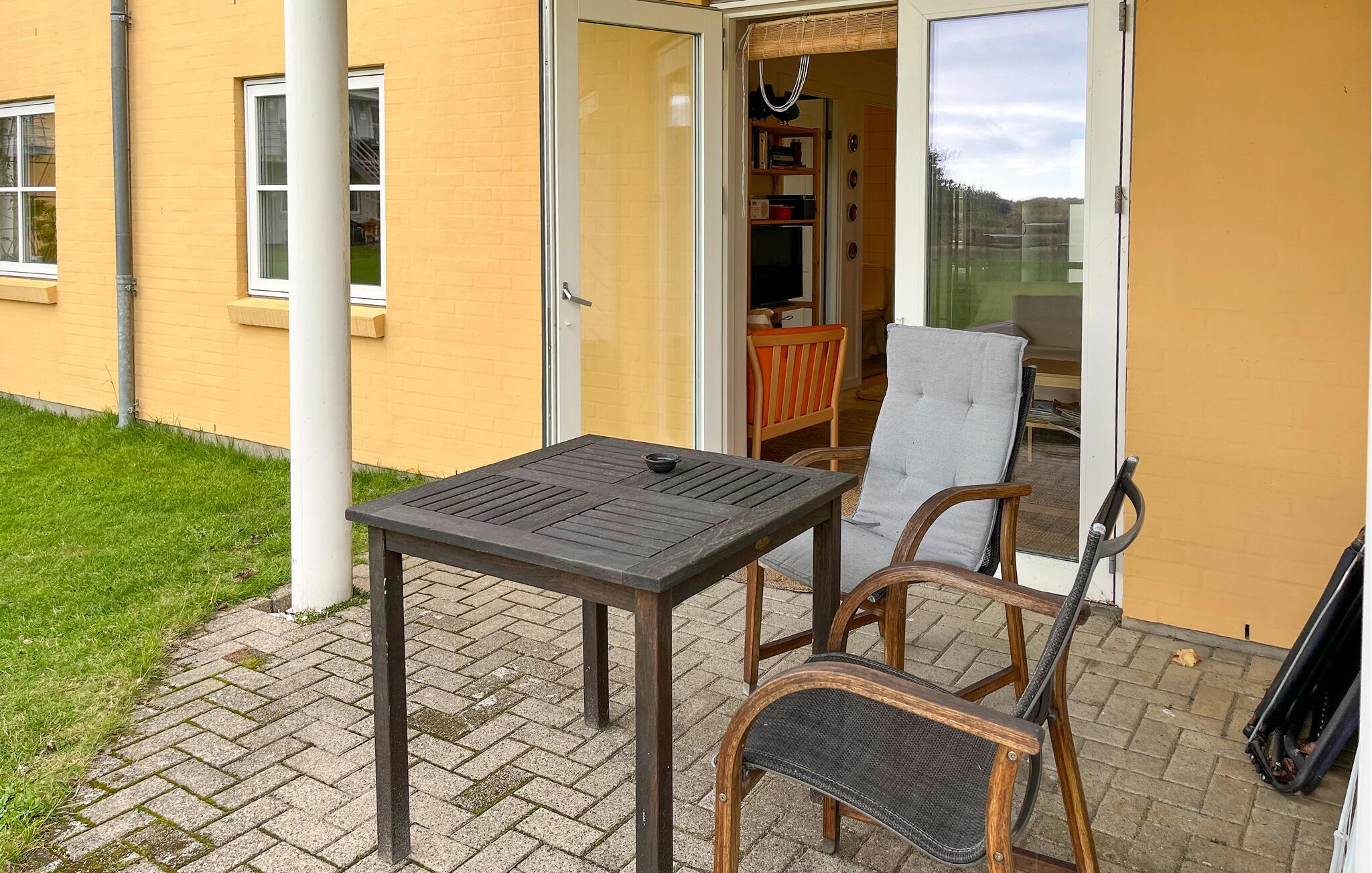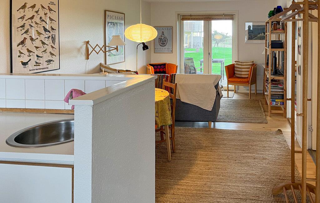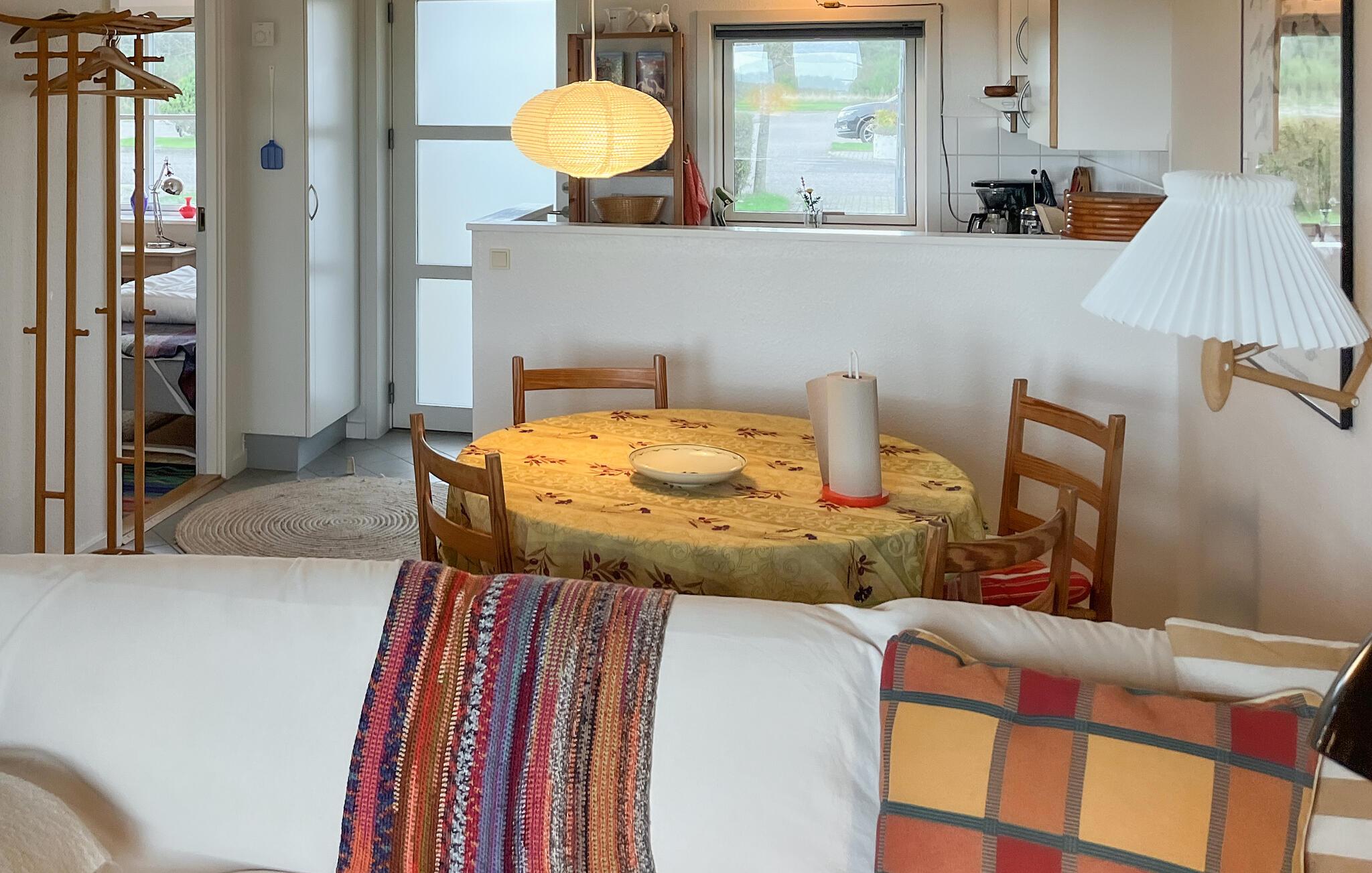 Indretningen i jeres ferielejlighed er venlig og hjemlig. Sæt jer godt til rette i stuen på sofaen, læs en god bog, eller nyd udsigten til det grønne gennem den store terrassedør. Farverige detaljer og personlige indslag skaber en varm atmosfære. Tilbered jeres måltider i det funktionelle køkken, og nyd dem ved spisebordet lige ved siden af. Om aftenen sørger den bløde belysning for en afslappet stemning, mens fjernsynet giver mulighed for lidt underholdning.