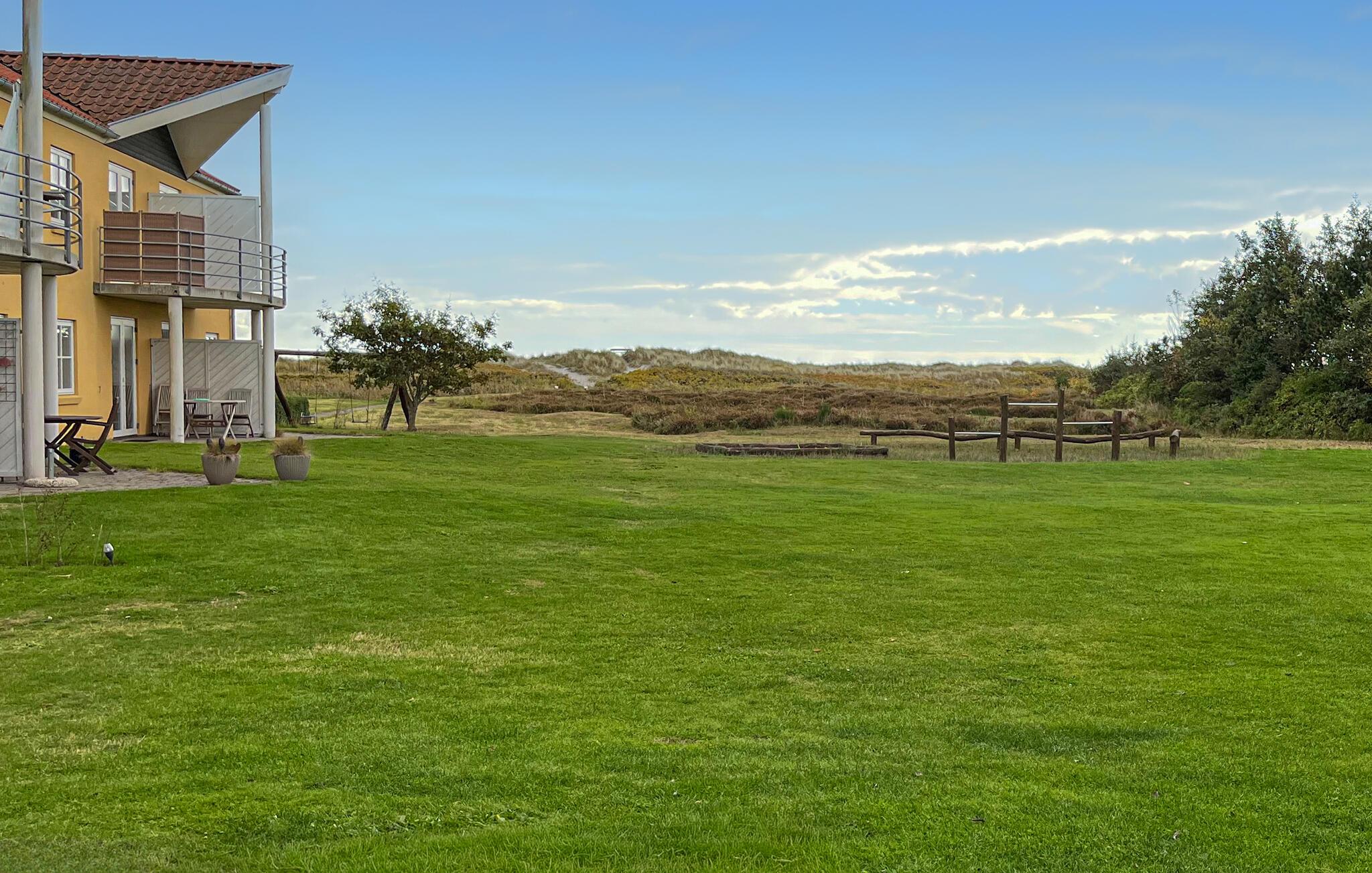 Åbn terrassedøren, og træd ud i den friske luft. På en af de møblerede terrasser, enten foran eller bag huset, kan I spise morgenmad i fred og ro eller afslutte dagen med et glas vin. Der er grill til rådighed, og den store græsplæne indbyder både til små lege og til afslapning. Udsigten over det åbne landskab giver en dejlig følelse af ro og frihed.