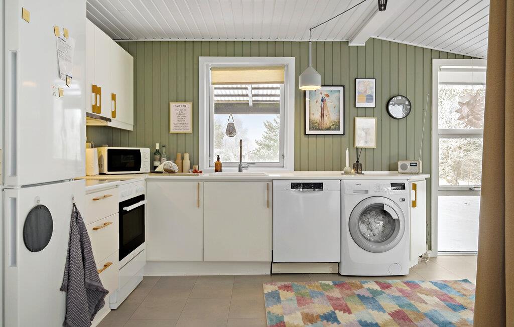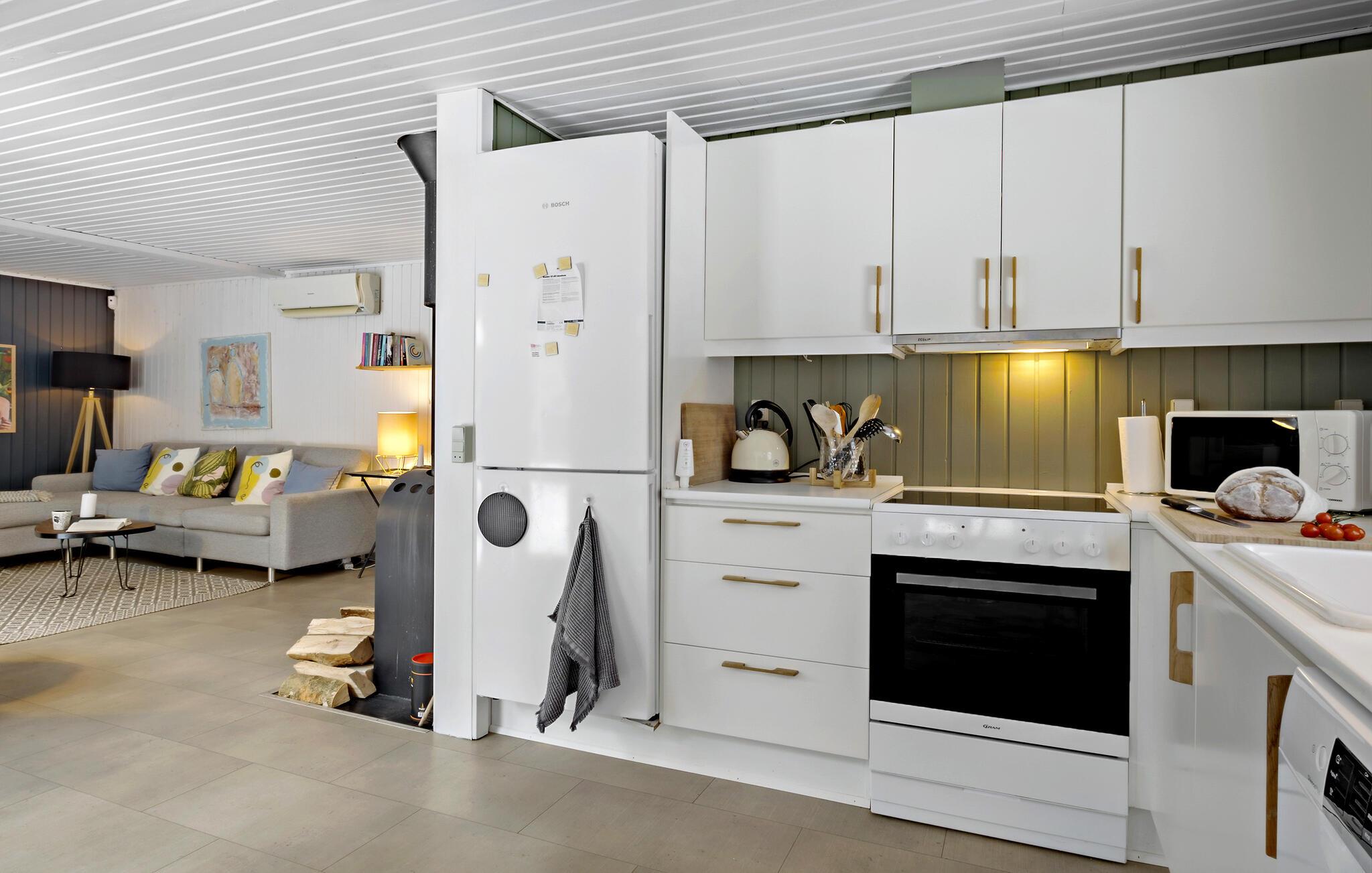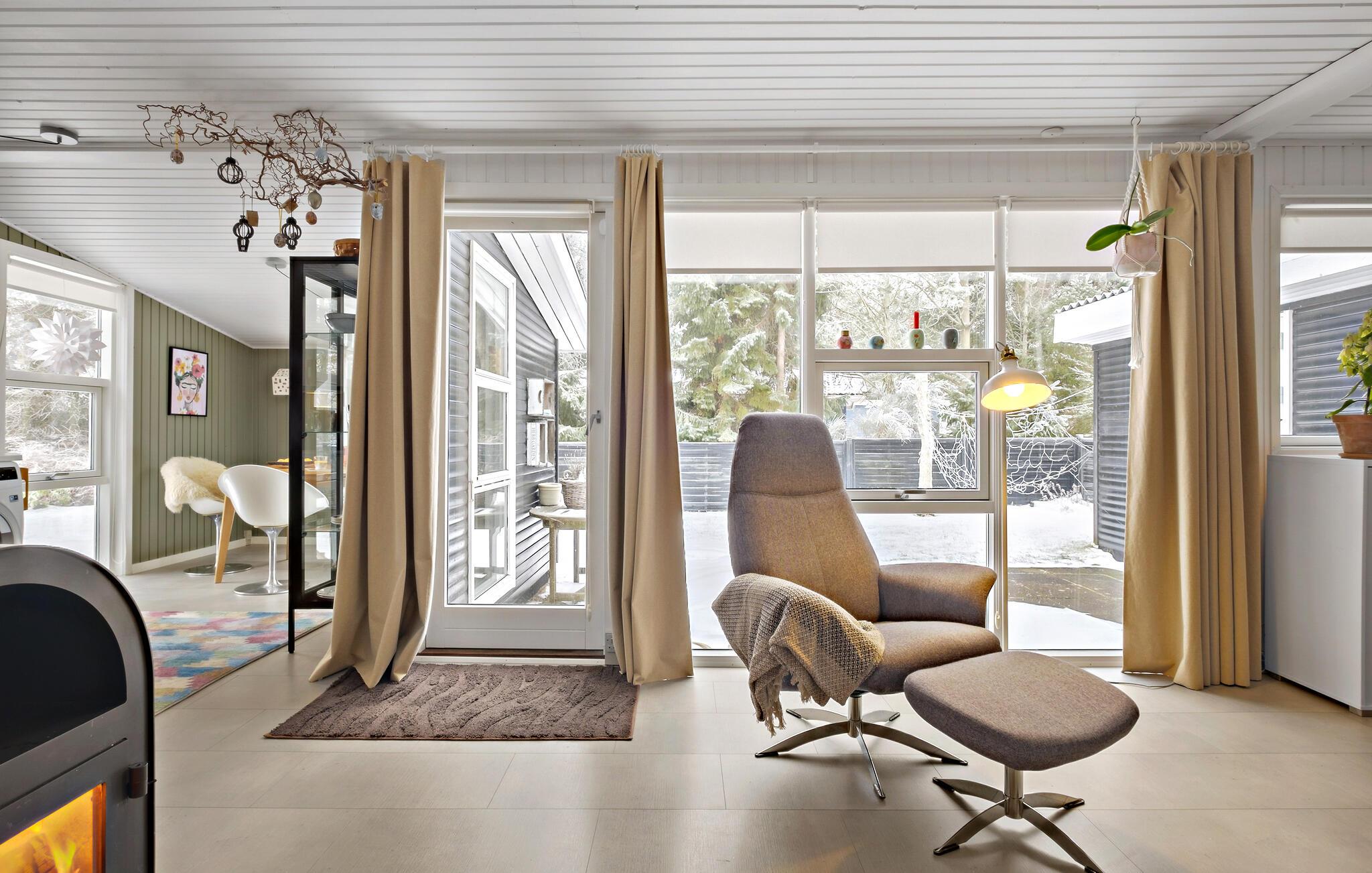 I vil straks føle jer hjemme her; Huset er kærligt og nænsomt indrettet i varme, behagelige farver og med gode møbler. De mange gulv-til-loft-vinduer giver et skønt, naturligt lysindfald, og brændeovnen er prikken over i'et, ved hvis gnitren I kan nyde mange hyggelige aftener. Med den åbne indretning kan nogen svinge skeerne i køkkenet, mens andre hygger sig med puslespil ved spisebordet eller slapper af med en god bog i sofaen.