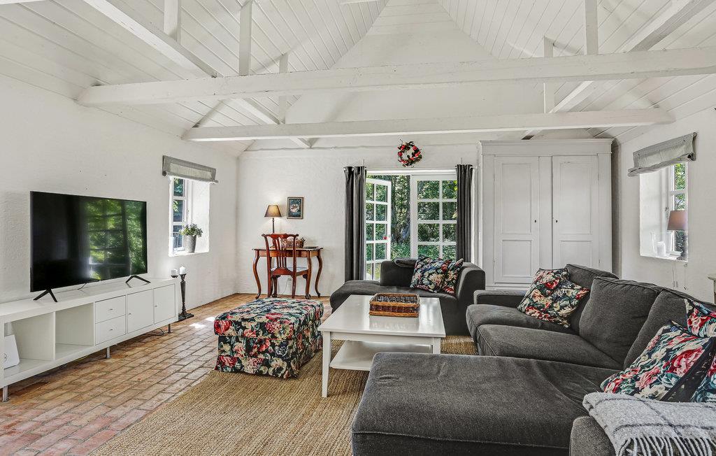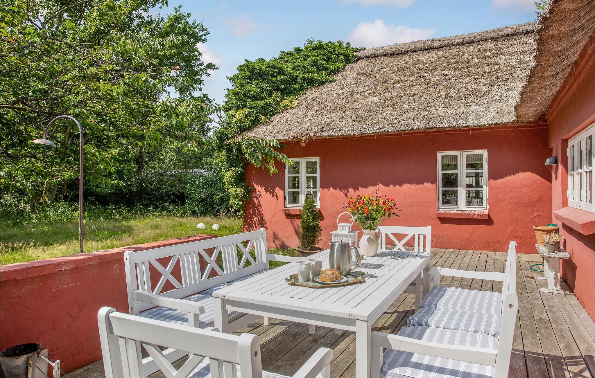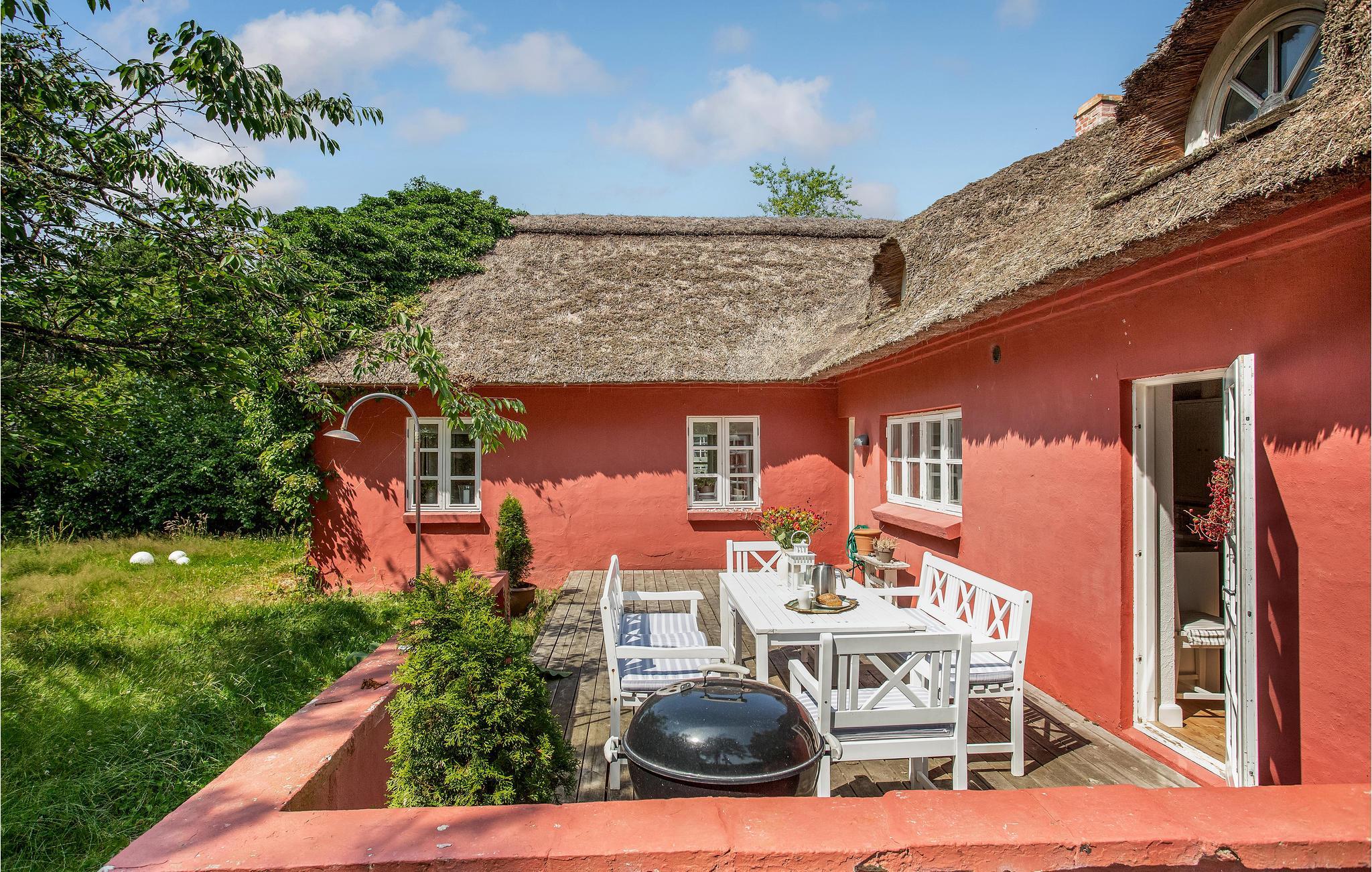 Smukt stråtækt feriehus i Hals med flere opholdsrum og kort afstand til stranden.