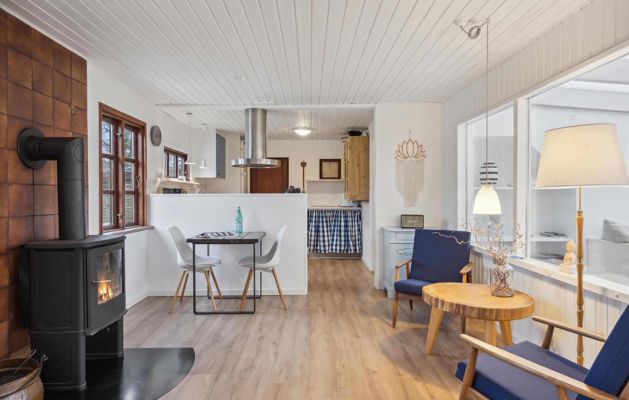 Velkommen til dette charmerende feriehus på en lukket sti i det idylliske klitområde i badeområdet Hou. Den hyggelige feriebolig består af et hovedhus og et anneks, hvor I finder soveværelser og fællesområder. I det lyse hovedhus bliver stuen det naturlige samlingspunkt for hele familien. Her kan I varme jer foran brændeovnen med timevis af brætspil på de køligere aftener.