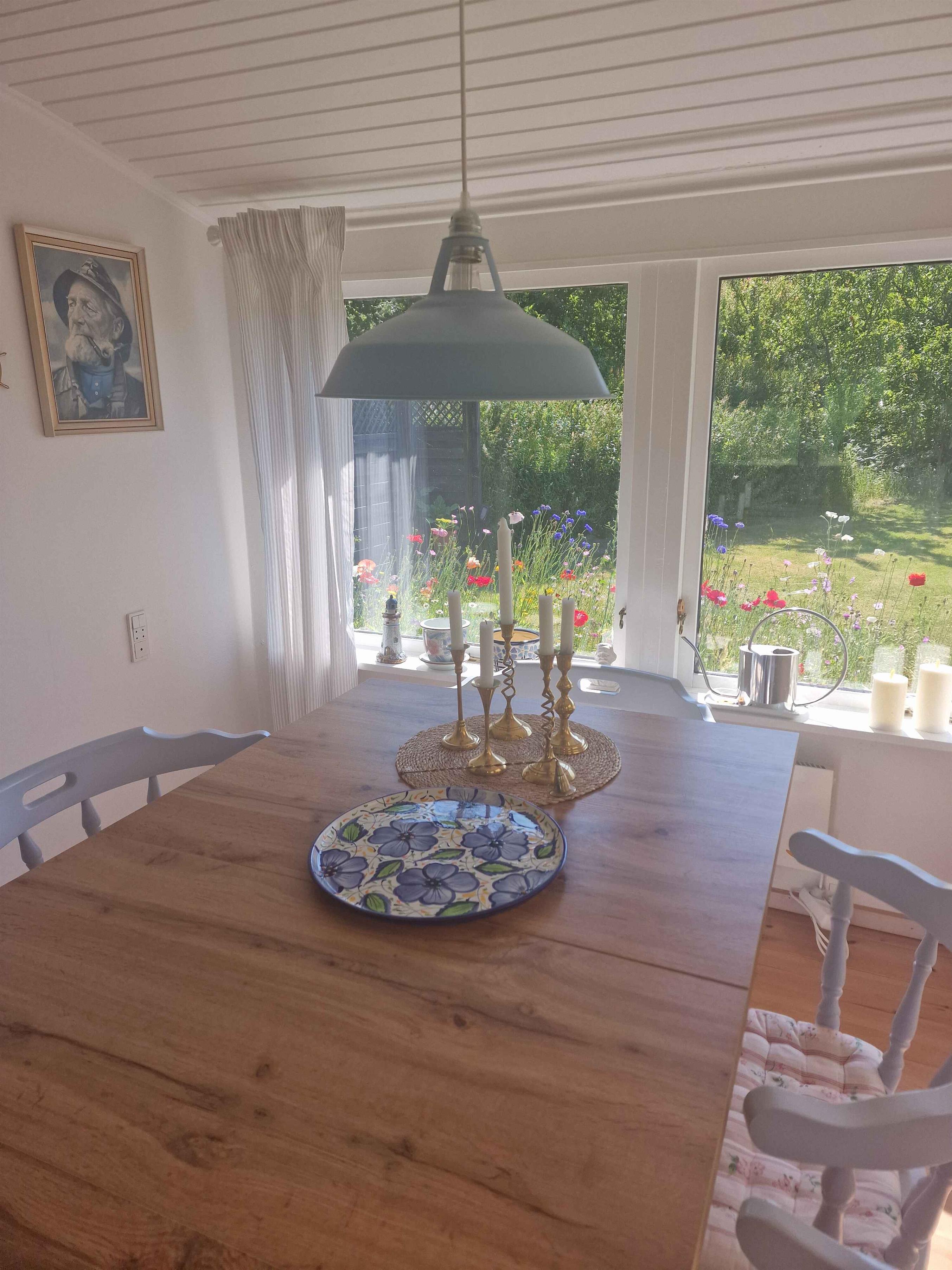 ? Boligens highlights Stor, lys stue med panoramavinduer, der giver en dejlig åben og afslappende atmosfære Hyggelig spisestue og opholdsrum ideelt til fælles måltider og brætspil Smuk havestue/udestue med rattanmøbler – gæsternes favoritspot til morgenkaffe og aftener med vin og spil Lukket, privat terrasse med direkte adgang fra køkkenet – perfekt til grill og udendørs spisning Stor, fredelig have med god plads til leg, boldspil og solbadning Stemningsfuld udendørs belysning, der skaber hyggelig ferieatmosfære om aftenen ?? Sovepladser til 4–5 personer Soveværelse med dobbeltseng Værelse med trekvartseng Sovesofa i stuen Ideelt til både par, familier og små vennegrupper. ??? Moderne og fuldt udstyret køkken Nyt køkken med bardisk og direkte udgang til terrassen Induktion, varmluftovn, mikroovn, opvaskemaskine, stort kølefryseskab Hurtigt WiFi + TV med Chromecast – perfekt til film- og streamingaftener ?? Udendørs nydelse Stor grøn græsplæne til spil og afslapning Terrasse og udestue til hyggelige middage og rolige aftenstunder Kun 800 meter til en børnevenlig og fredelig strand – helt perfekt til badning, gåture og solnedgange ?? Fantastisk beliggenhed Sommerhuset ligger i et roligt, naturskønt område mellem Hals og Hou. Her får I fred og privatliv – men stadig kort vej til: Indkøb, restauranter og hyggelige havnemiljøer Lagunen med Put & Take, café, restaurant, bar og kræmmermarked hver lørdag Hals Strand Camping med minigolf og legeplads Aalborg kun 30 min. kørsel derfra – nemt til shopping og byoplevelser