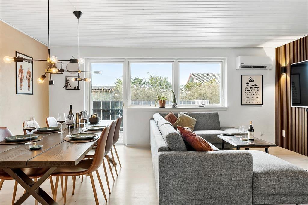 Sommerhuset fremstår lyst og indbydende med moderne indretning og hyggelige detaljer, der straks får dig til at falde ned i ferietempo. Her er en behagelig og afslappet atmosfære – den slags, hvor man kan smide skoene i døren, tænde en kop kaffe og bare nyde stilheden, mens lyset strømmer ind gennem vinduerne. Køkken og stue ligger i åben forbindelse og indbyder til samvær, uanset om du er i gang med aftensmaden eller fordybet i et brætspil ved spisebordet. Om aftenen kan du læne dig tilbage i sofaen og nyde roen, mens du måske planlægger morgendagens udflugt – eller bare nyder, at tiden går lidt langsommere her. Der er plads til fire personer i huset, så det egner sig perfekt til en lille familie, to vennepar eller et par, der gerne vil have god plads omkring sig i ferien.