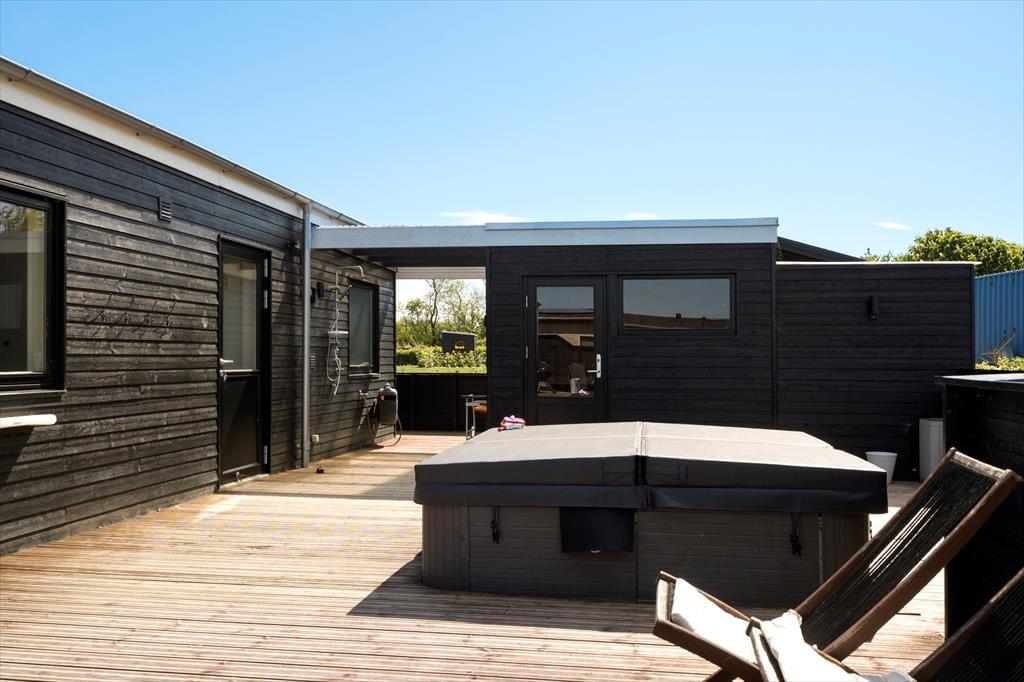 På husets store terrasse folder ferielivet sig ud med alt, hvad hjertet kan begære – og mere til. Her er god plads til at slappe af i solen med en bog, spille kort med børnene eller nyde lange, lune sommeraftener i godt selskab. Det lækre udendørs spabad er et af husets helt store højdepunkter. Forestil dig at sidde her under stjernerne med et glas bobler i hånden, mens vandet bruser blidt omkring dig – ren magi! Haven er rummelig og grøn, og her er rigelig plads til leg, boldspil og løbende hundepoter, for hele tre hunde er hjerteligt velkomne her. Med både åbne og mere afskærmede kroge på terrassen kan du altid finde et sted med læ – og når grillen tændes, spreder duften af sommer sig over hele haven.