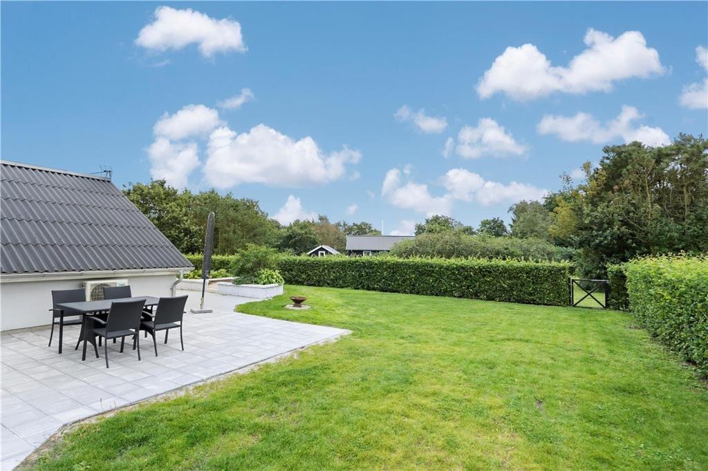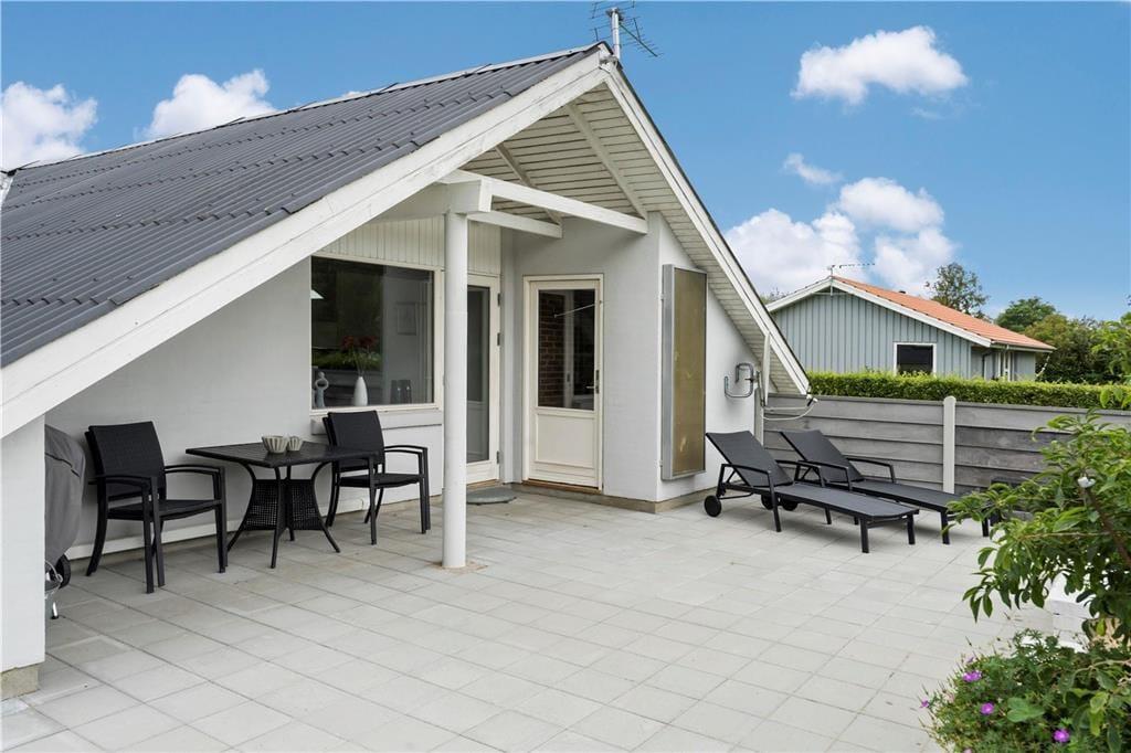 Afslapningsstunderne kan også foregå ude i det fri, for en rolig eftermiddag på sommerhusets store terrasse kan være den helt rette måde at få ladet batterierne op på. Terrassen har et mindre overdækket areal, men er ellers helt åben, og solforholdene er gode. I indkørslen kan der sagtens holde flere biler, og resten af grunden er helt enkelt holdt med græsplæne og randbeplantning.