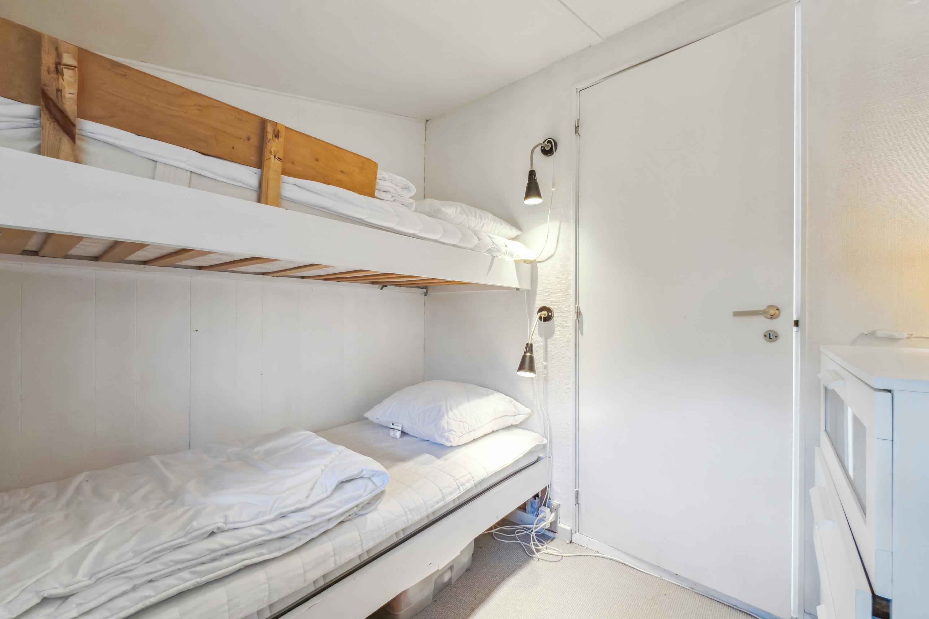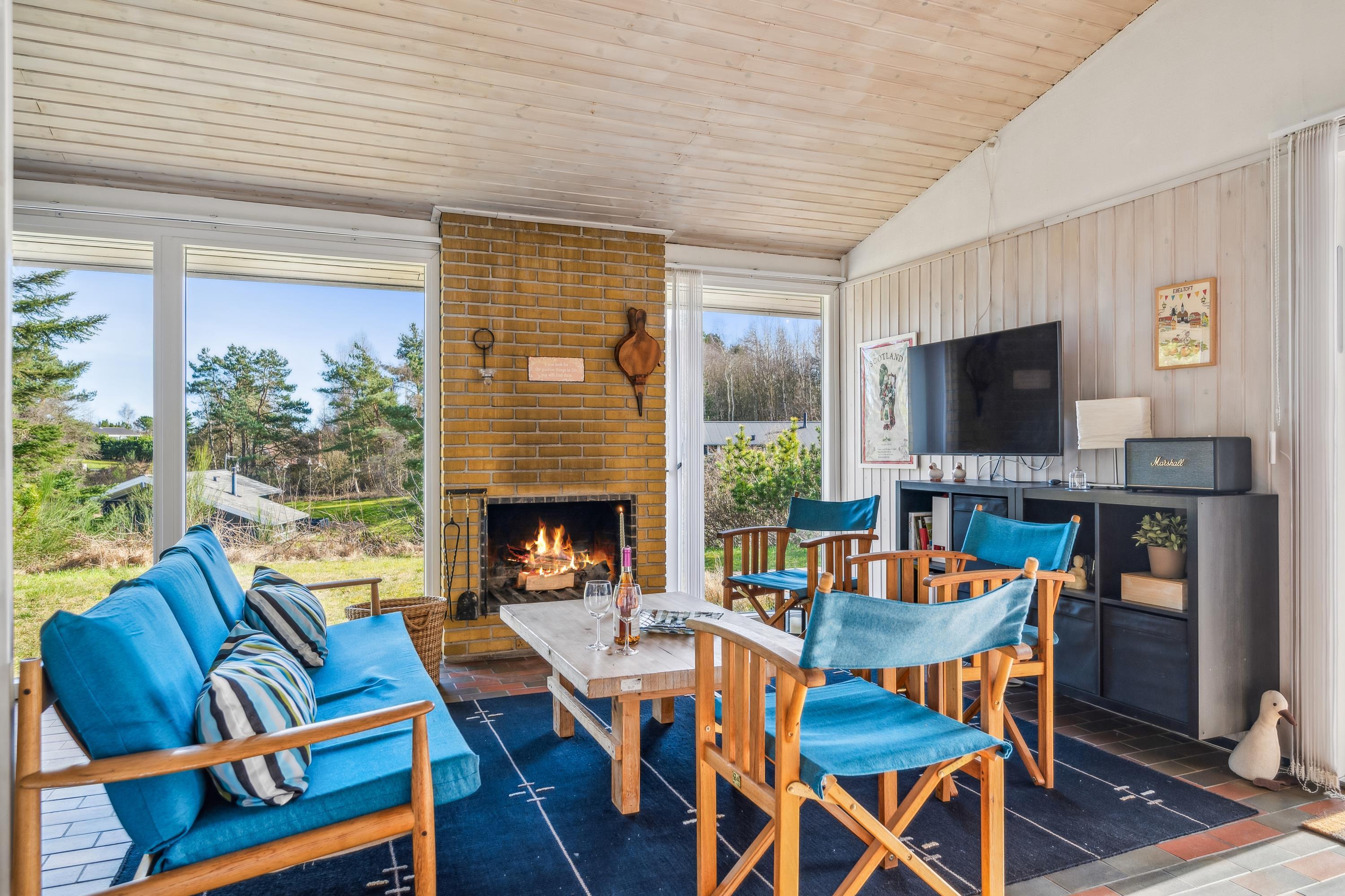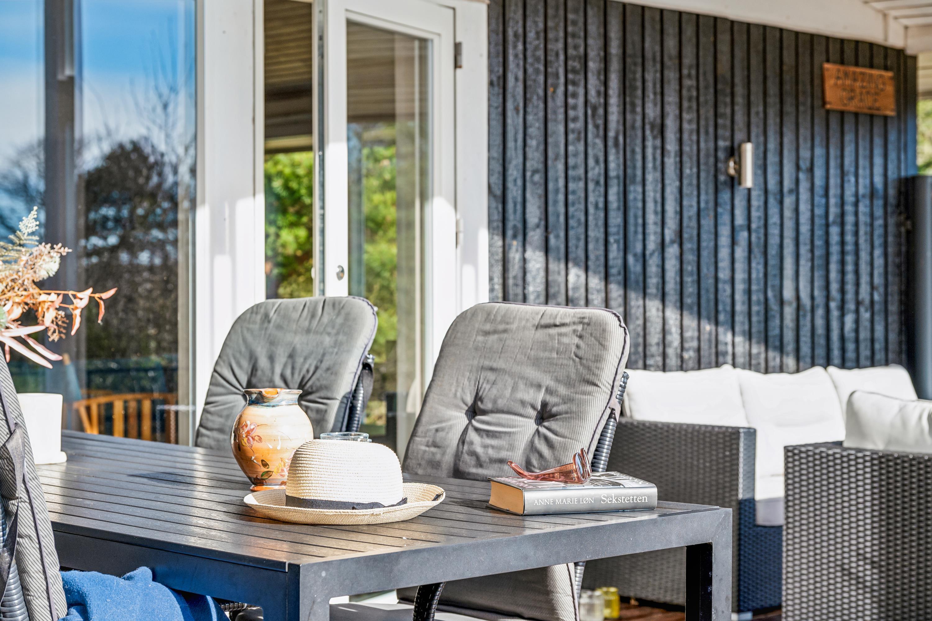 Velkommen til dette "rigtige" sommerhus højt beliggende på en skrående grund med en fantastisk udsigt over området og til vandet. Her finder man en hyggelig og velmøbleret stue med b.la. varmepumpe og en pejs samt udgang til både overdækket og åben terrasse med gode havemøbler. I forbindelse med stuen finder man det veludstyrede køkken med b.la. opvaskemaskine og hvorfra der er udgang til endnu en terrasse med havemøbler. Dejligt badeværelse med bruseniche og gulvvarme. Husets sovepladser finder man i husets 4 soveværelser, heraf to værelser med dobbeltsenge, et værelse med en køjeseng til to personer og et værelse med en mindre køjeseng til et barn. I huset findes både danske, tyske og nordiske tv kanaler. Til den lille feriegæst er der en høj stol til rådighed.