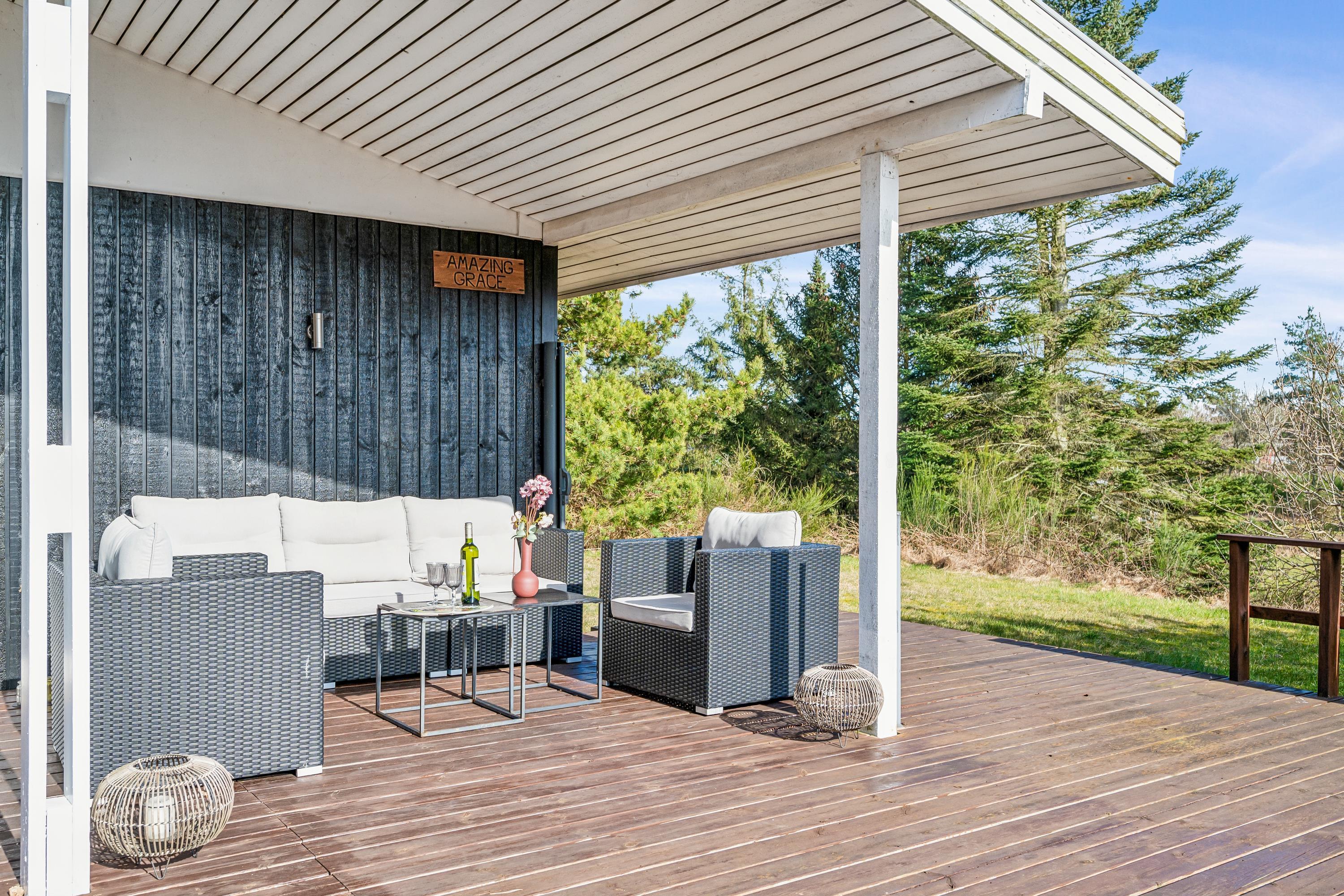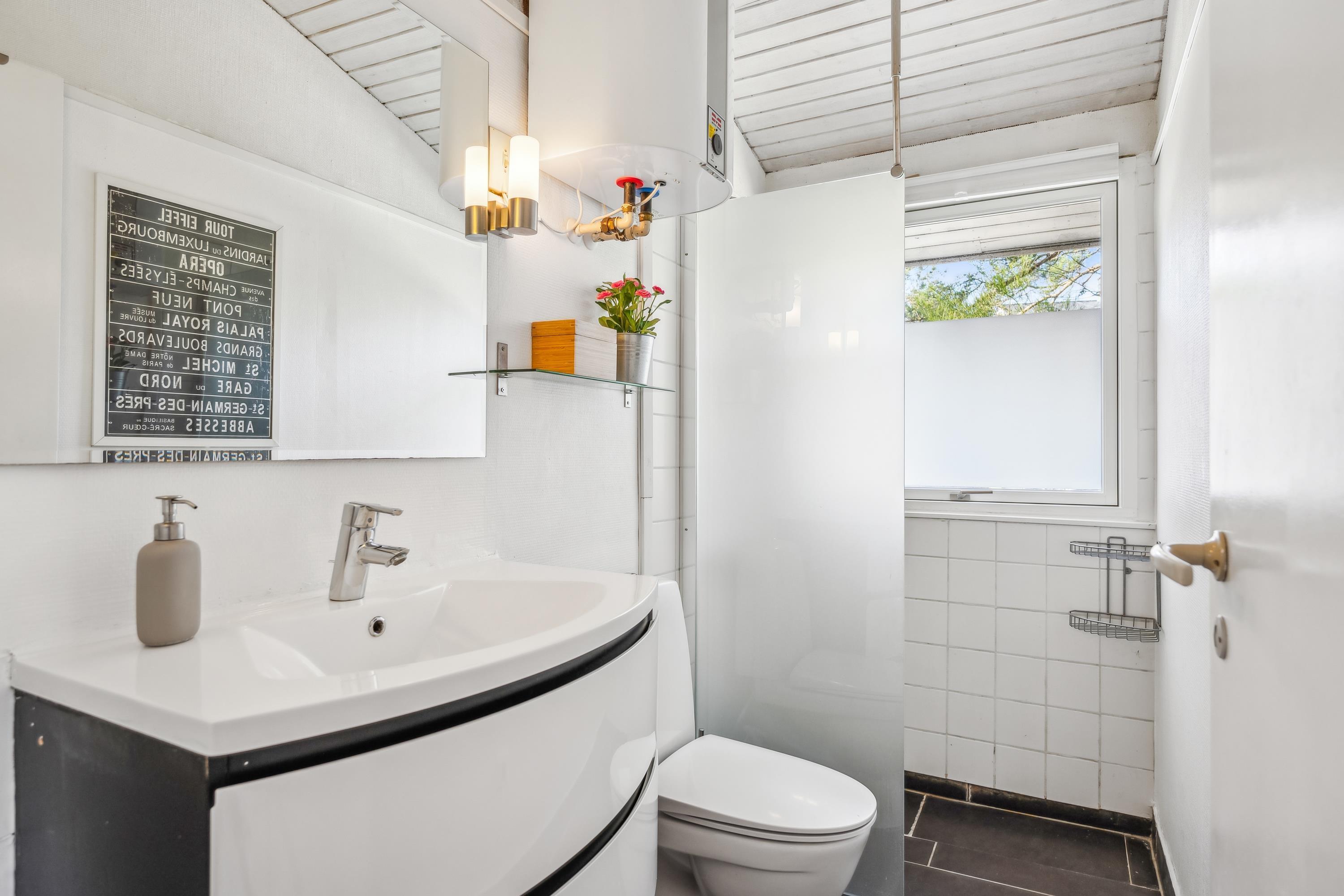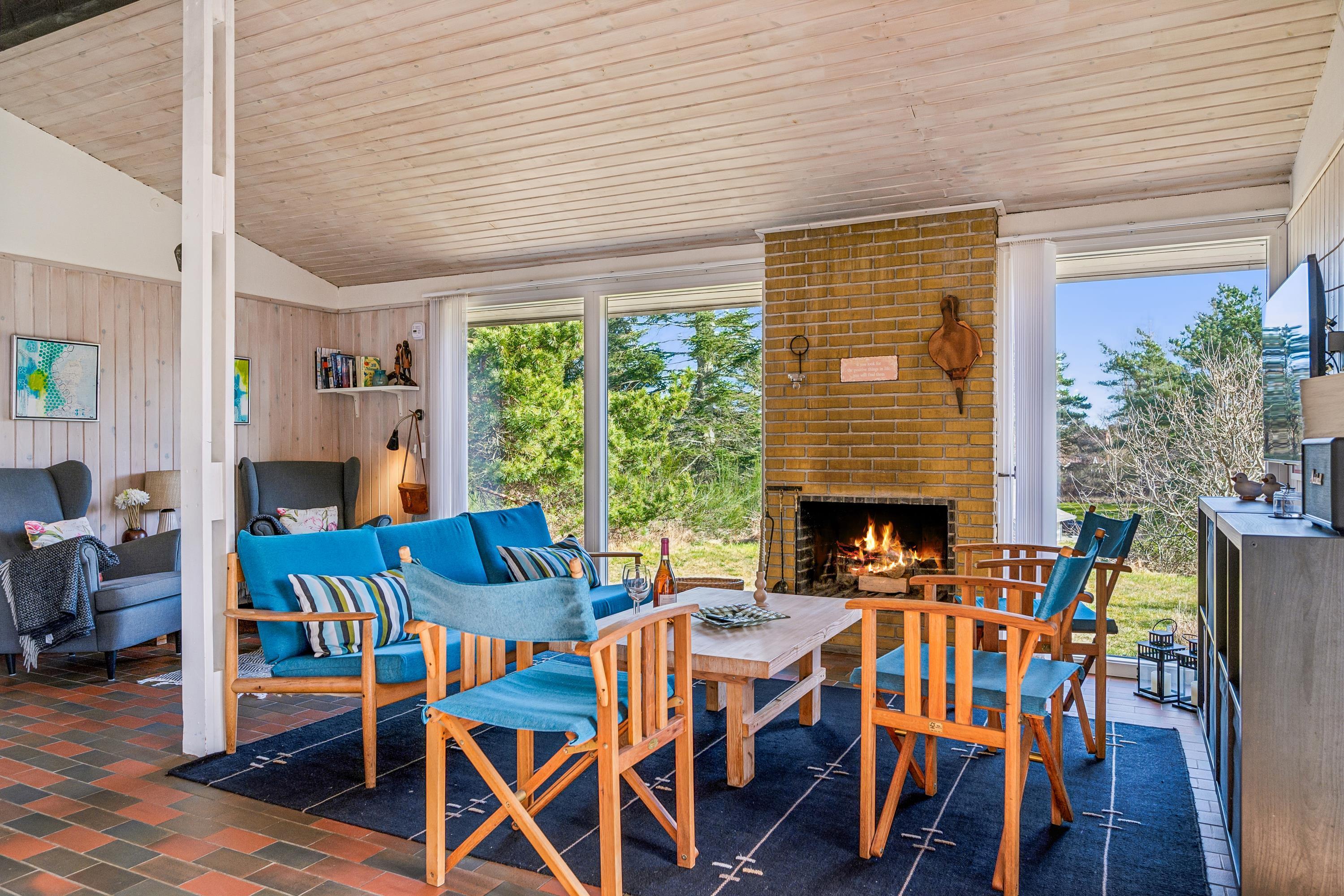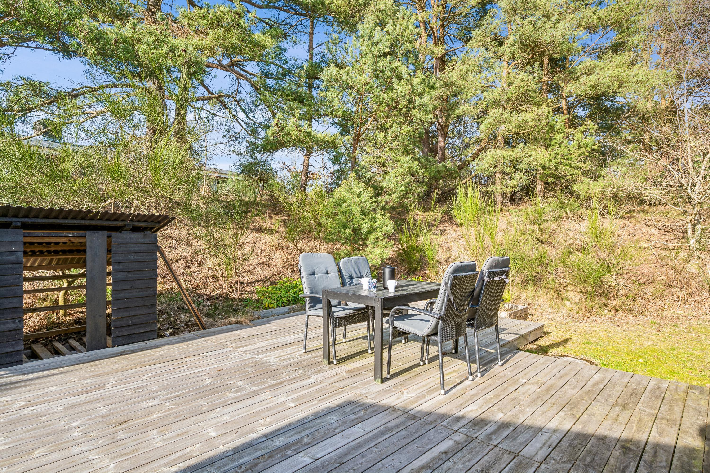 Velkommen til dette "rigtige" sommerhus højt beliggende på en skrående grund med en fantastisk udsigt over området og til vandet. Her finder man en hyggelig og velmøbleret stue med b.la. varmepumpe og en pejs samt udgang til både overdækket og åben terrasse med gode havemøbler. I forbindelse med stuen finder man det veludstyrede køkken med b.la. opvaskemaskine og hvorfra der er udgang til endnu en terrasse med havemøbler. Dejligt badeværelse med bruseniche og gulvvarme. Husets sovepladser finder man i husets 4 soveværelser, heraf to værelser med dobbeltsenge, et værelse med en køjeseng til to personer og et værelse med en mindre køjeseng til et barn. I huset findes både danske, tyske og nordiske tv kanaler. Til den lille feriegæst er der en høj stol til rådighed.