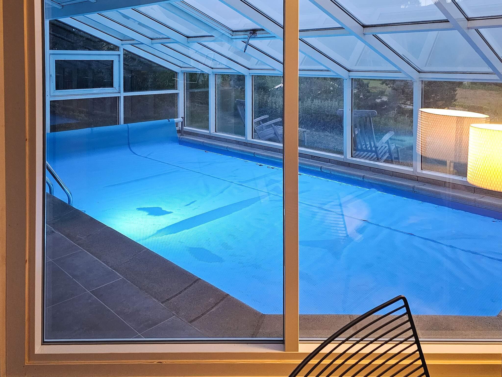 Swimmingpoolen er 18 m² og opvarmet med varmepumpe. Der er badeværelse med sauna i forbindelse med poolrummet. Herfra er der også panoramaudsigt, som kan nydes fra en eventuel luftmadras, så selv i det dårlige vejr kan der leges og slappes af i swimmingpoolen.