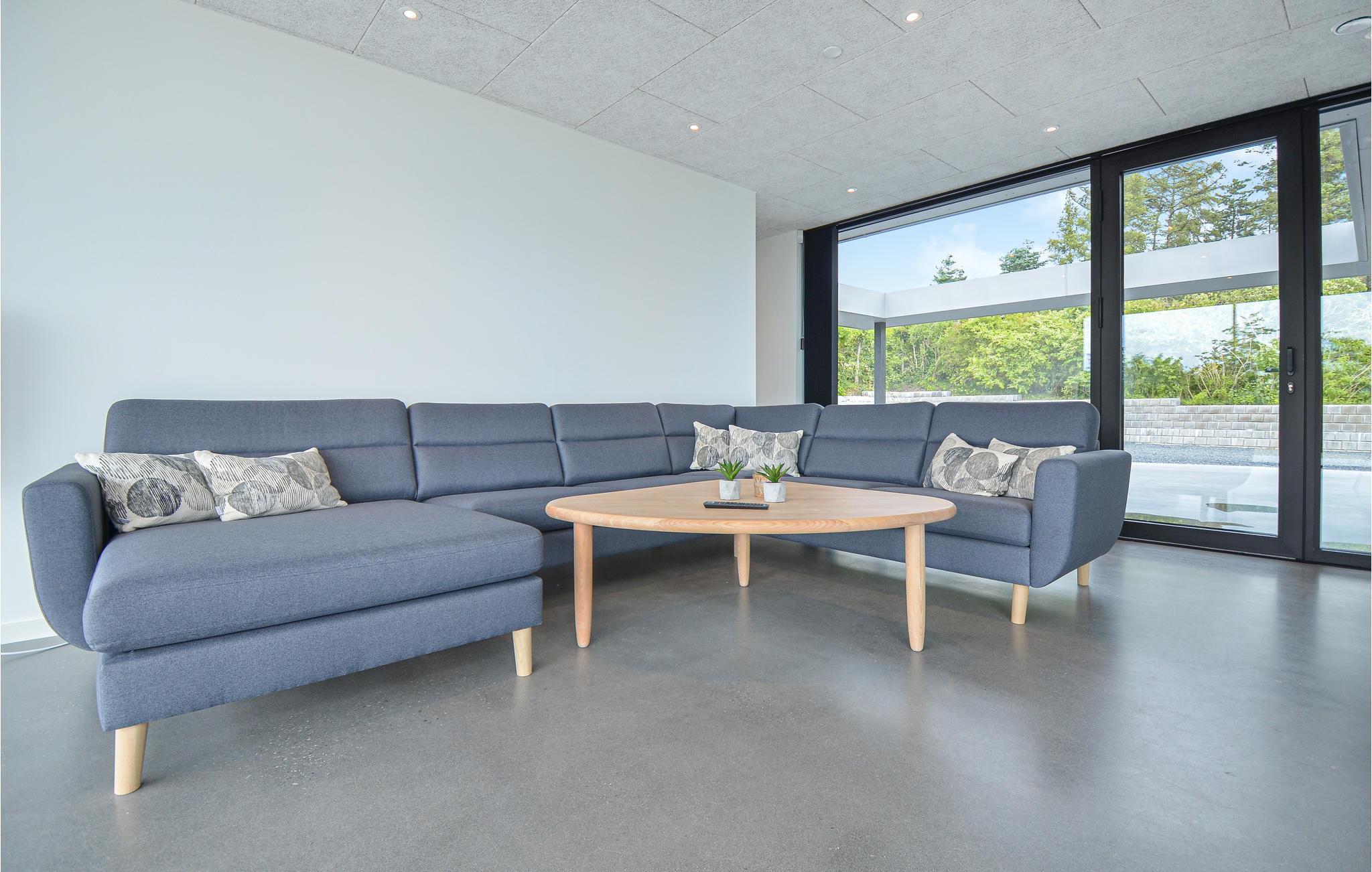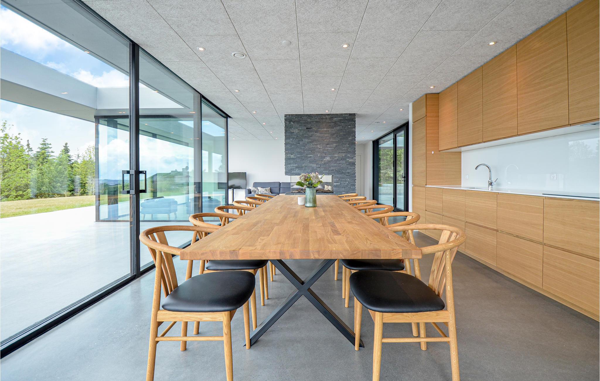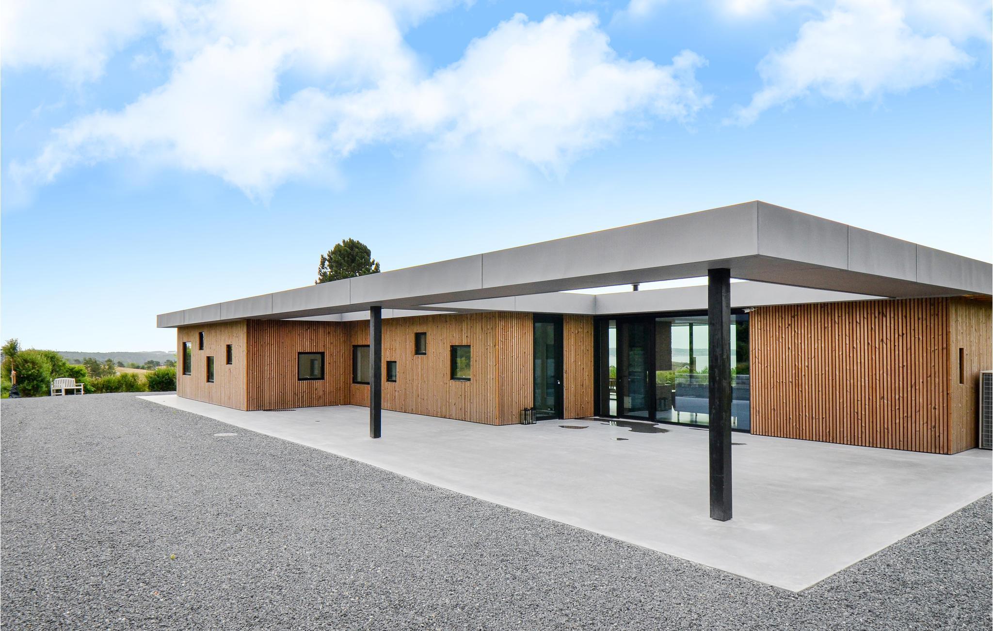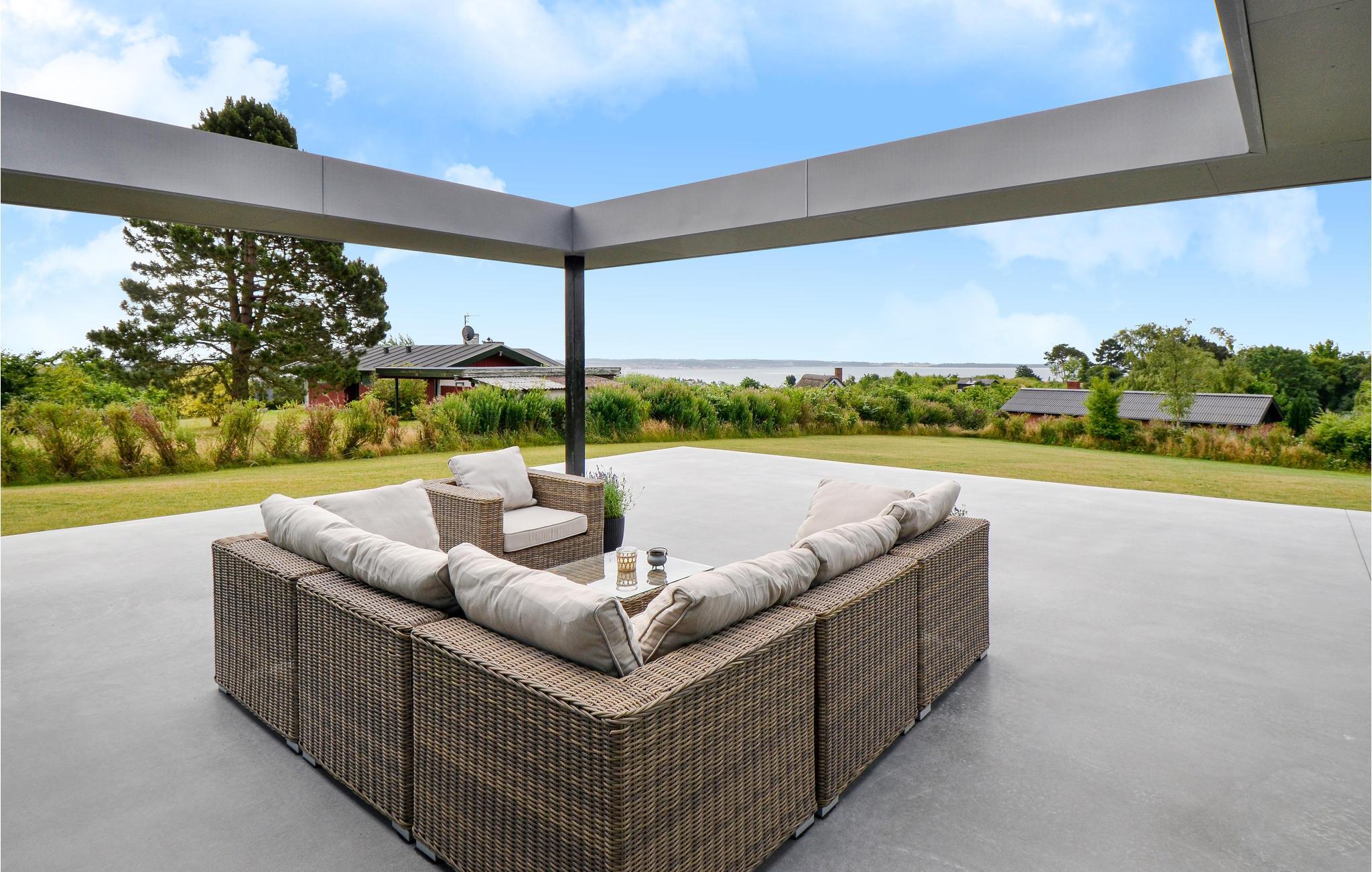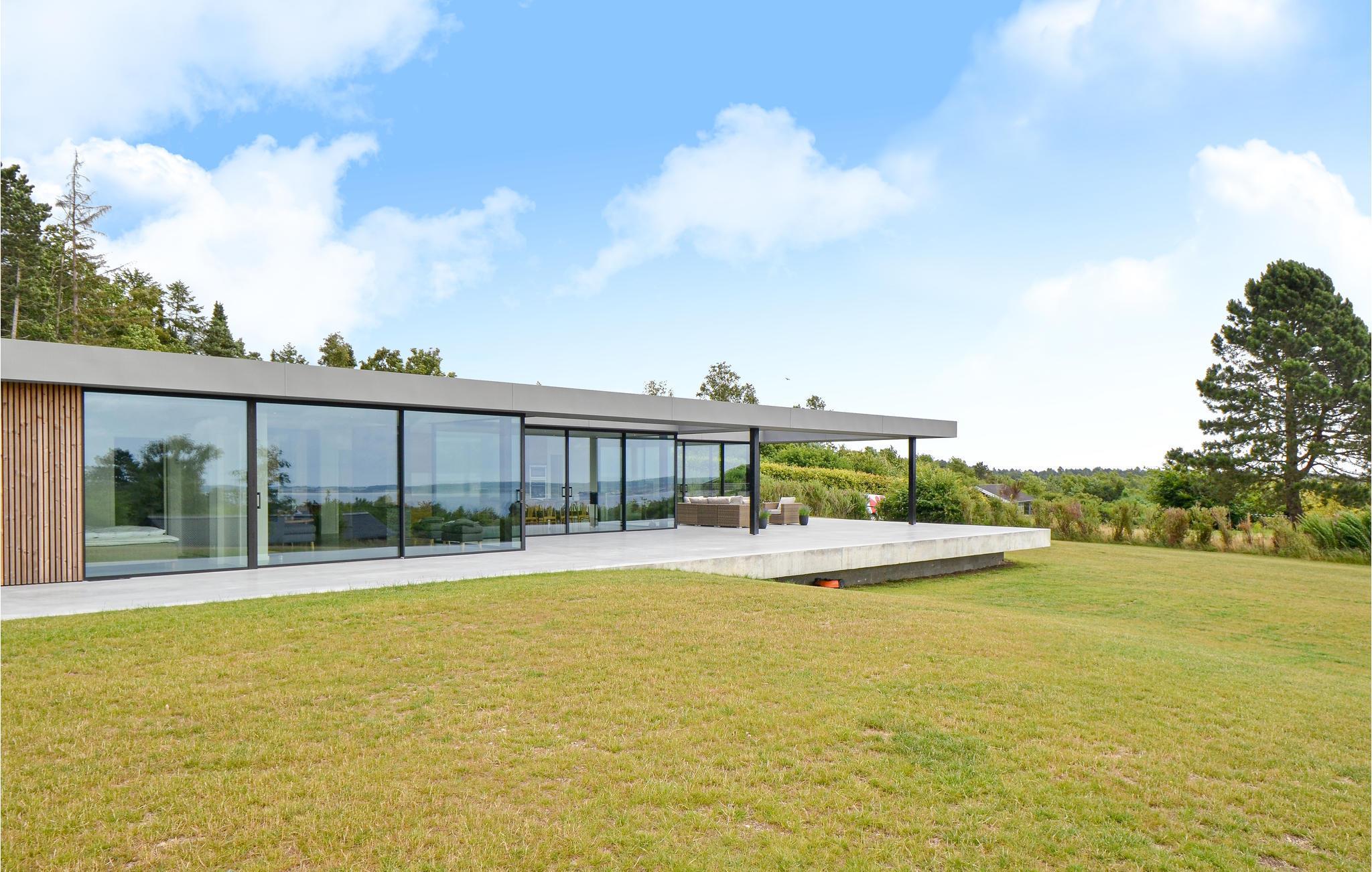 I det attraktive område Handrup Bakker ligger denne arkitektoniske perle af et hus på en kæmpestor flot anlagt grund. Her er der kræset om de små detaljer. Huset er lyst og åbent indrettet og de store vinduesflader i stuen lader lyset flyde smukt gennem rummet.Alle terrassedøre kan åbnes og giver følelsen af at sidde i et med terrassen. Vel udstyret køkken med alt tænkeligt udstyr. Her bl.a induktionskogeplade, kombi og alm ovn. Her er god plads til at alle kan give en hånd med, så madlavningen bliver som en leg. Fra huset og den hyggelige terrasse med lækre loungemøbler er der en smuk og uforglemmelig panoramaudsigt ud over Ebeltoft Vig. Hurtigt bredbåndsinternet og udenlandske tv kanaler. Pejsen i præsentationen af huset er blot til pynt og ikke kan ikke benyttes under ophold i huset.