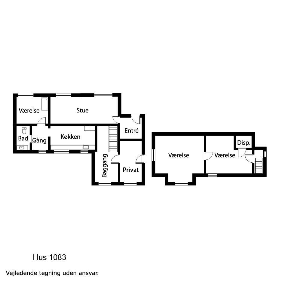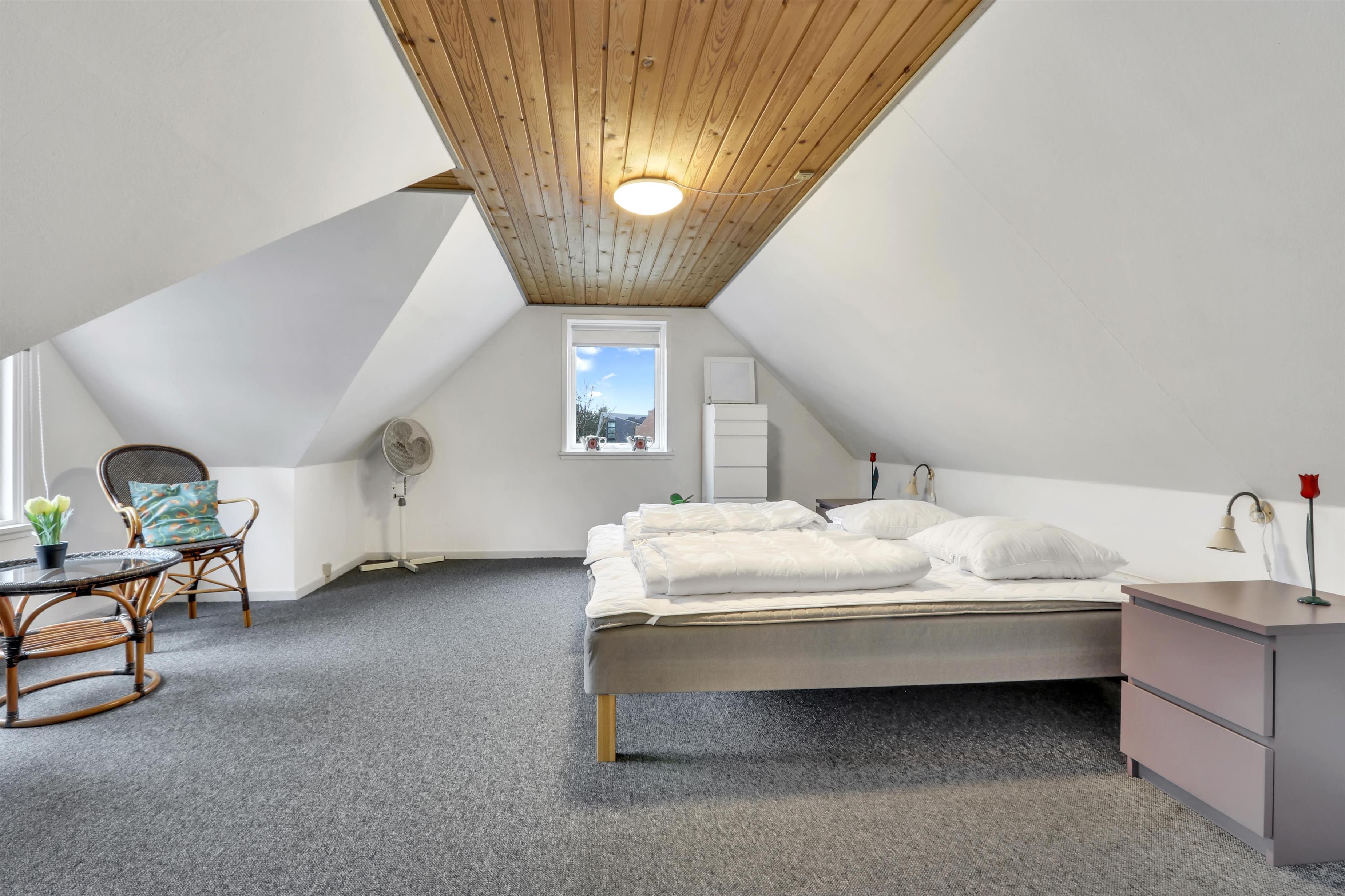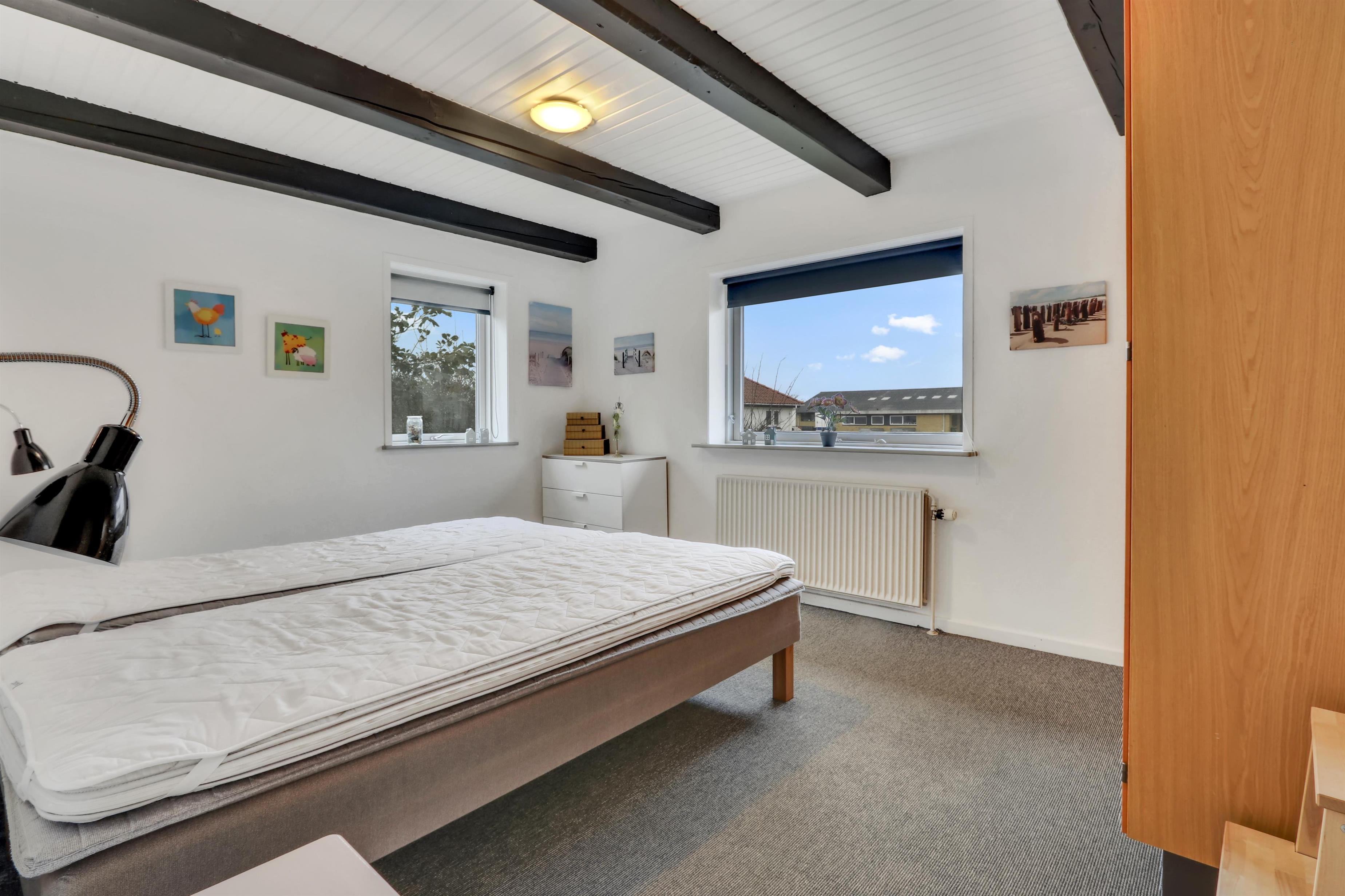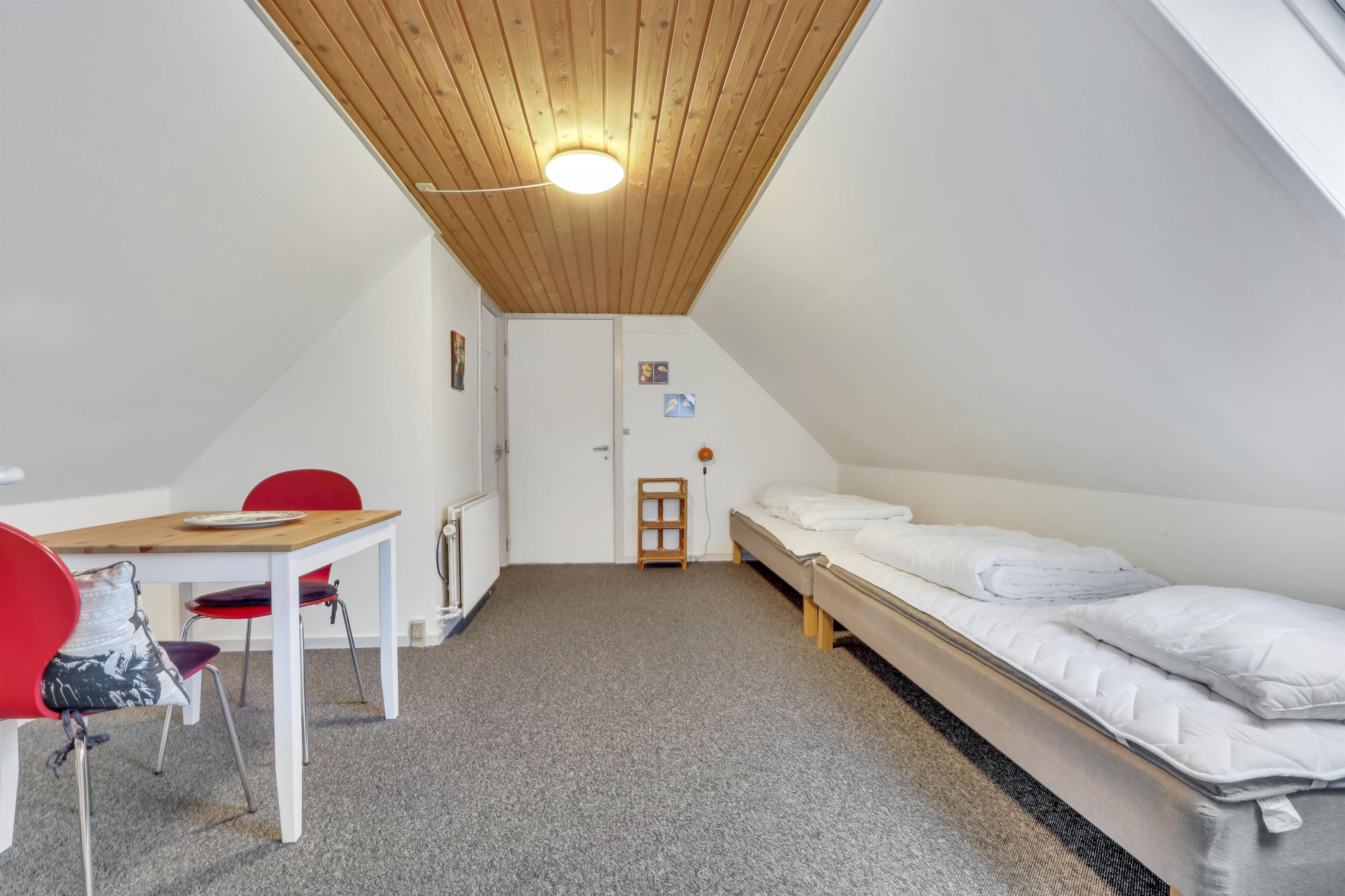 Fra bryggers er der en trappe til 1. sal. Her er der 2 soveværelse (2ES og 1DS). For at komme til det bagerste værelse er det nødvendigt at gå igennem værelse med de 2 enkeltsenge.