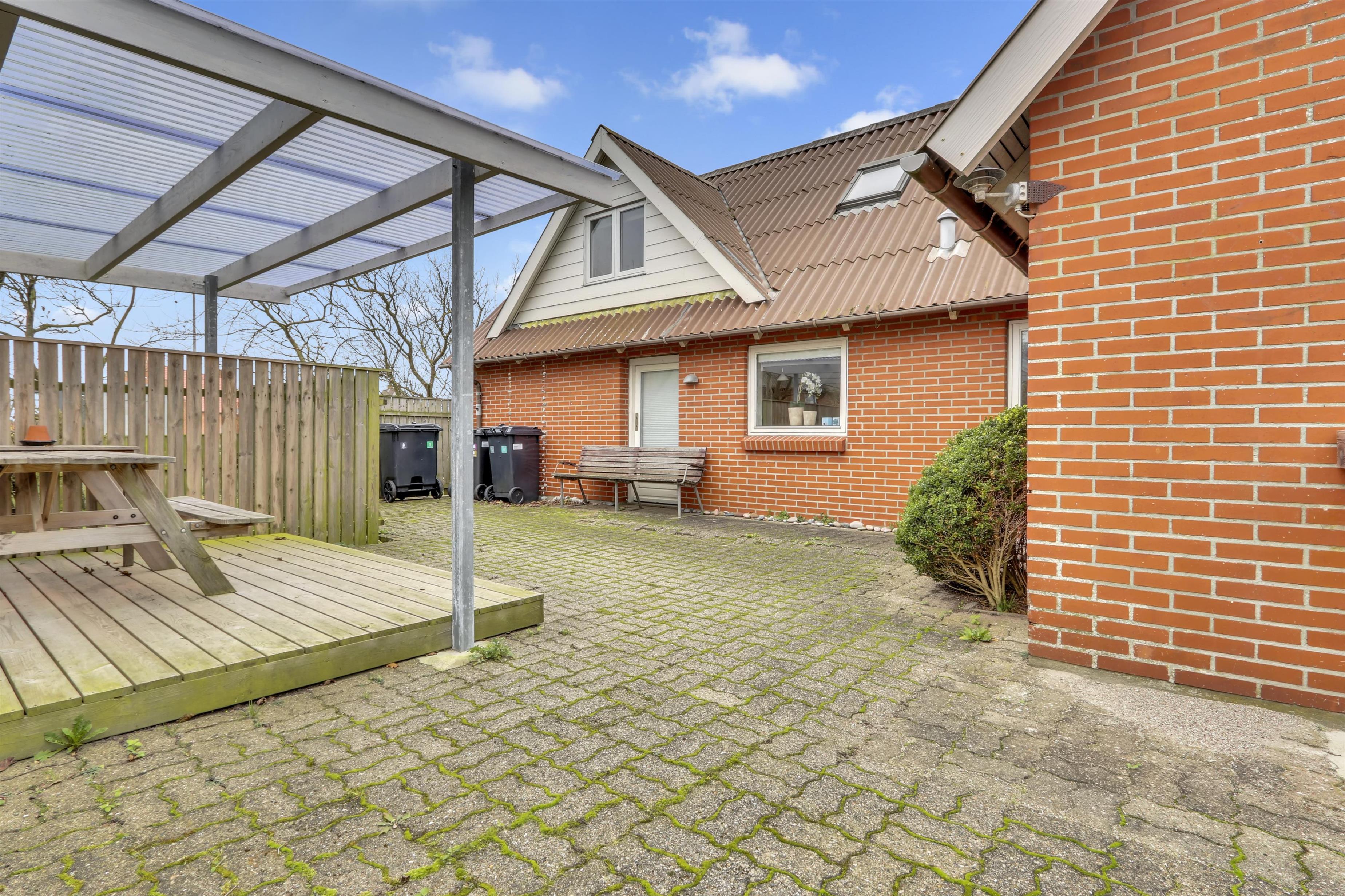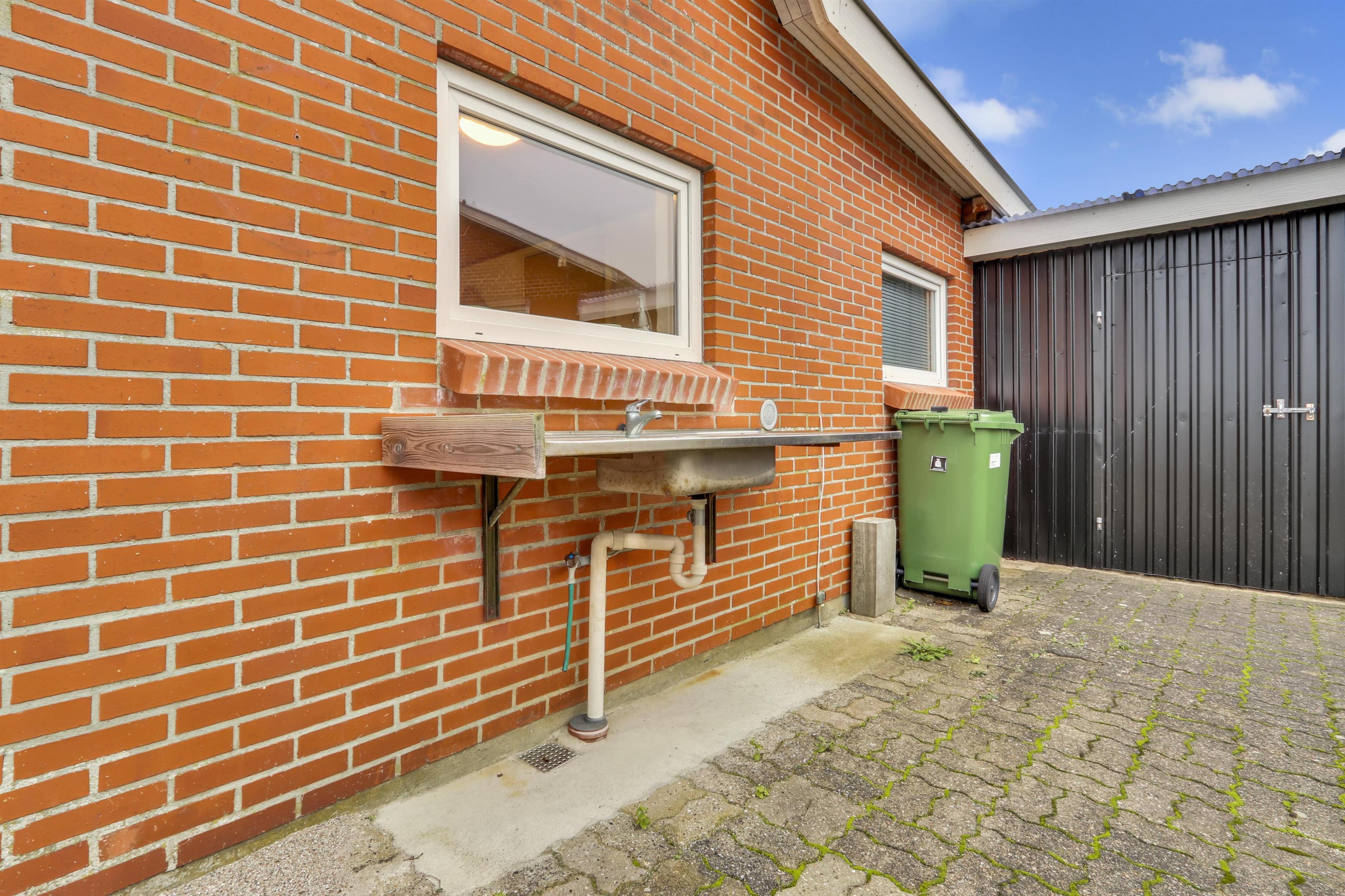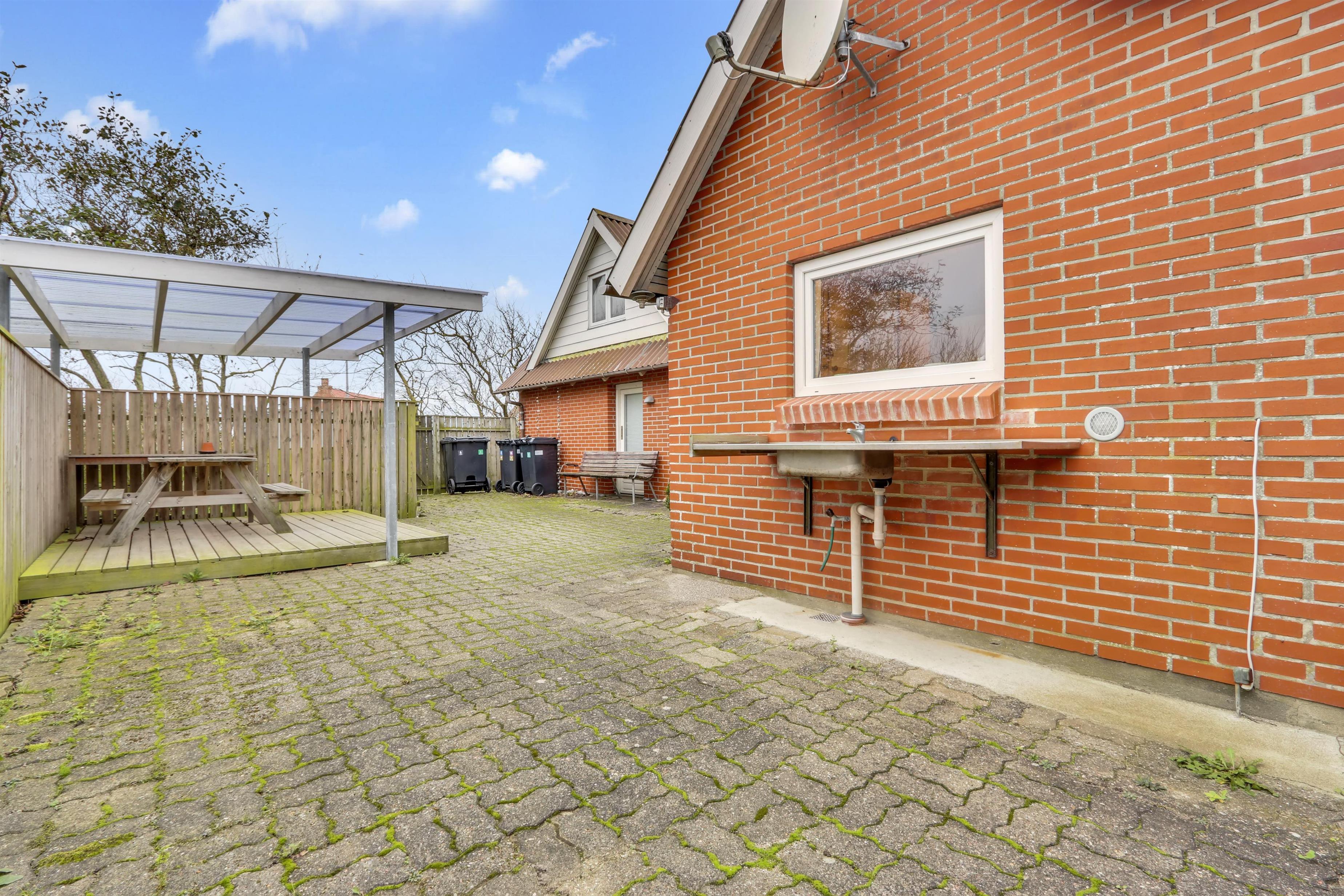 Fra den lille mellemgang ved køkkenet og fra bryggers er der udgang til en indhegnet terrasse med havemøbler, solvogne og grill. På terrassen er der altid læ og god mulighed for en plads i solen ligesom der er et udekøkken med stålbord og rindende vand. Dette gør huset til det perfekte valg, hvis man godt kan lide at fiske og har behov for renseplads og ekstra fryseplads til feriens fangst. Huset ligger kun ca. 200 m fra indkøbsmuligheder og her findes der mulighed for at hente morgenbrød og købmandsvarer. Tæt på huset ligger også Harboøre centret hvor der er mulighed for afhentning af mad samt massere af aktivitetsmuligheder. Indenfor 10 - 15 km fra huset kan flere seværdigheder, aktiviteter og shoppingmuligheder nås.