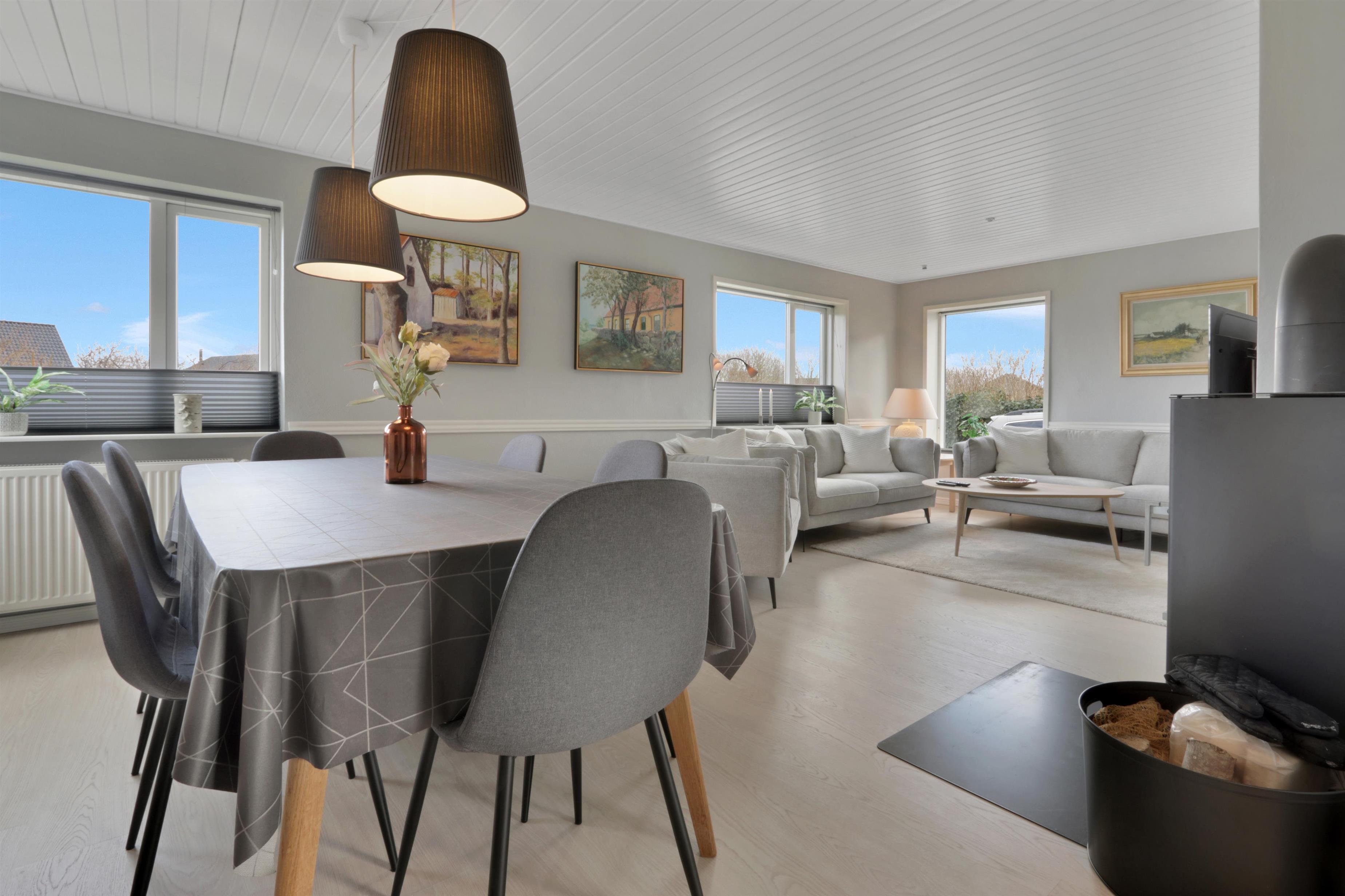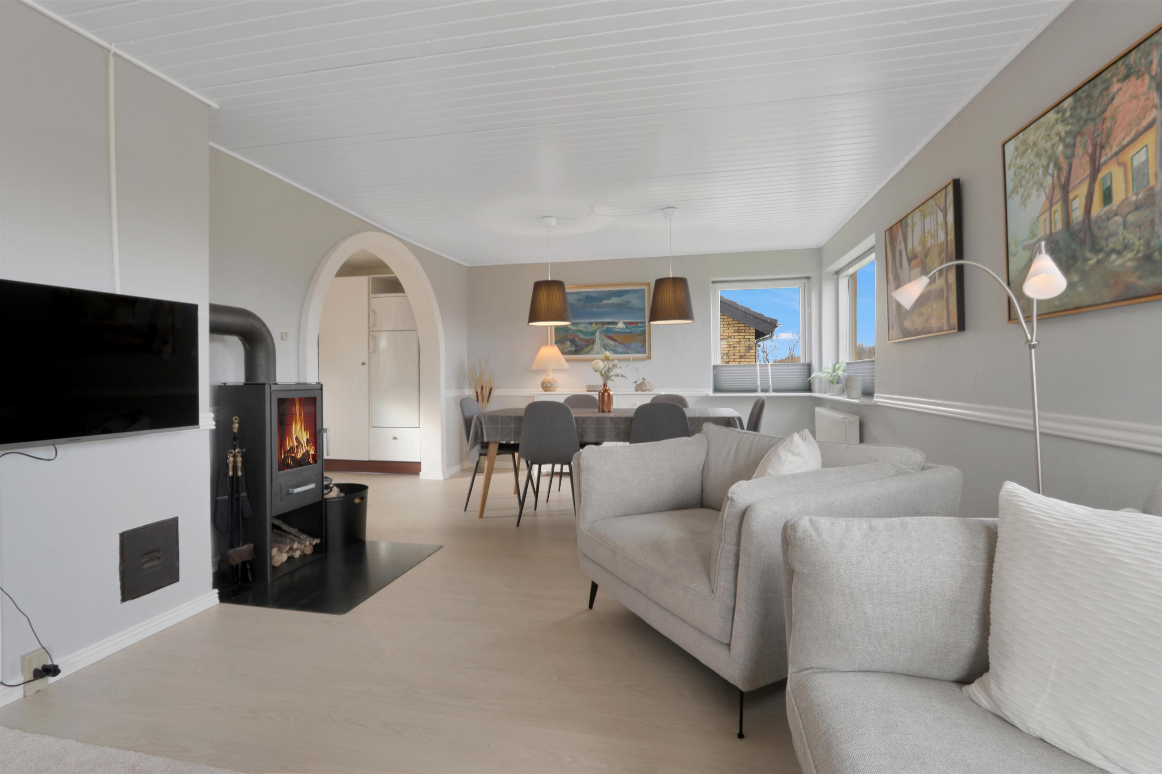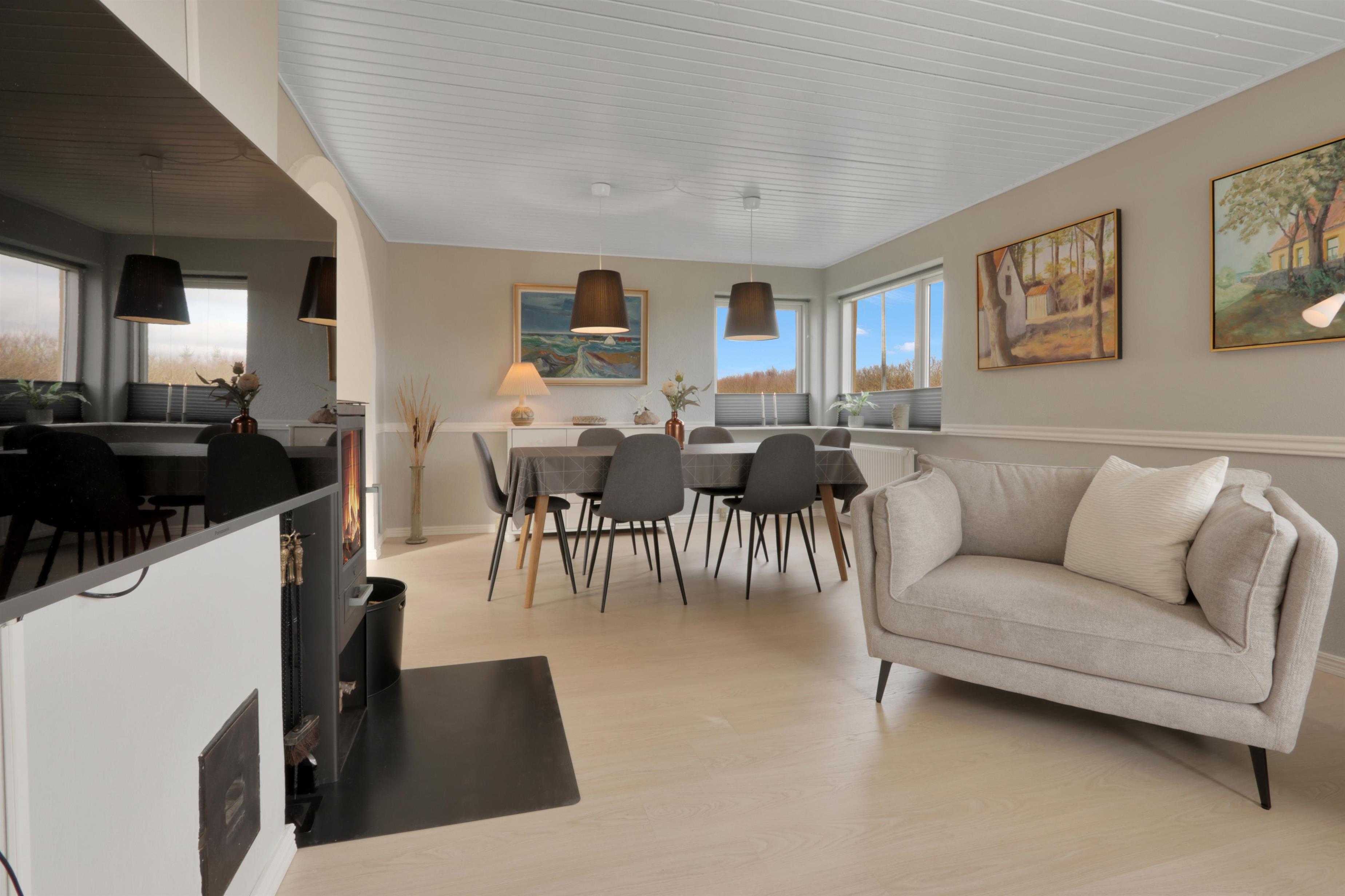 Dette skønne feriehus er renoveret i løbet af 2024, og er dejlig lys og indbydende. Opholdsstuen er hjemmets hjerte, hvor der er god plads til både samvær og hygge. Her finder du et stilfuldt spiseområde, en komfortabel sofagruppe samt en stemningsfuld brændeovn, der gør aftenerne ekstra hyggelige. TV'et har både danske og tyske kanaler, og med Chromecast kan du streame dine egne streamingtjenester.