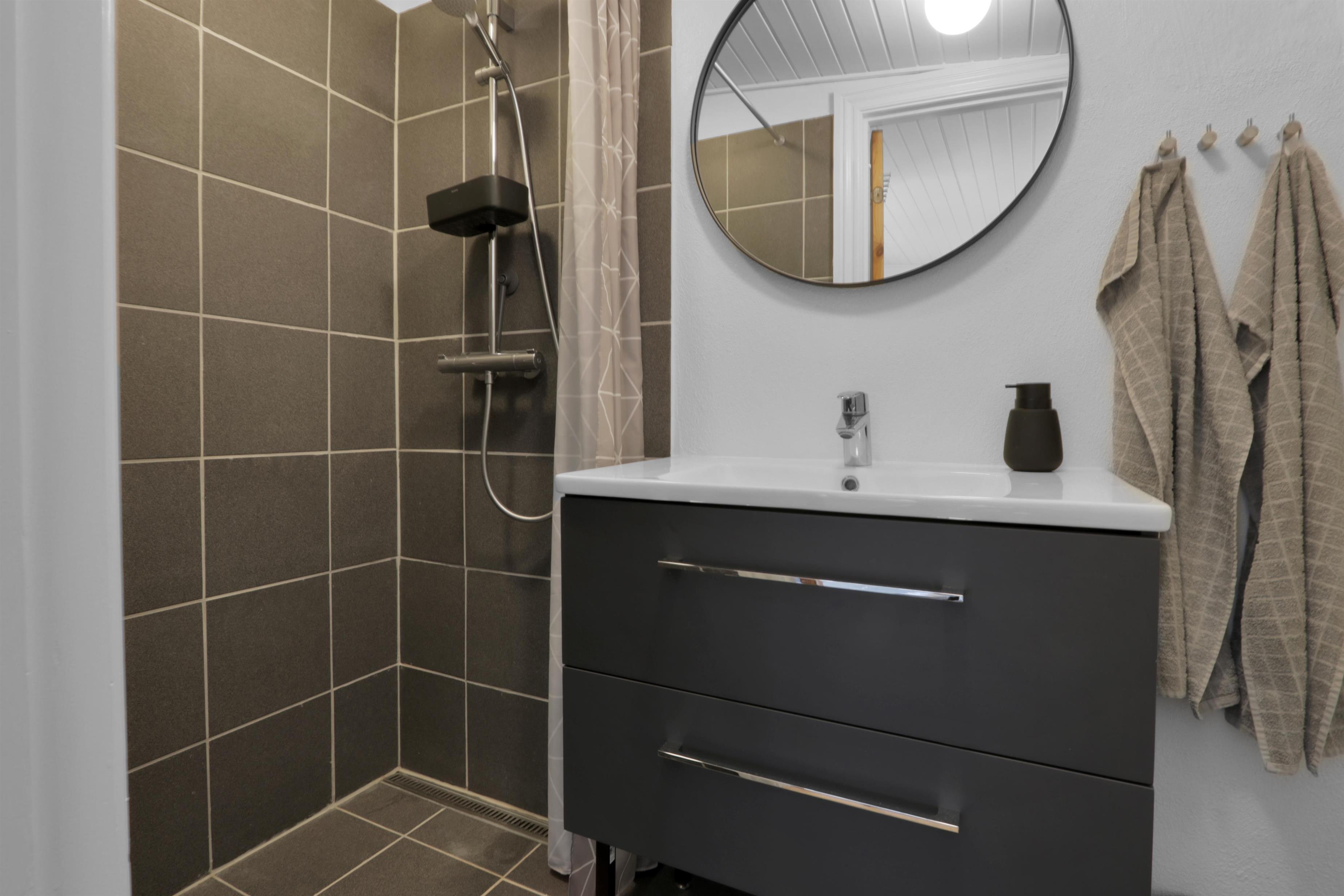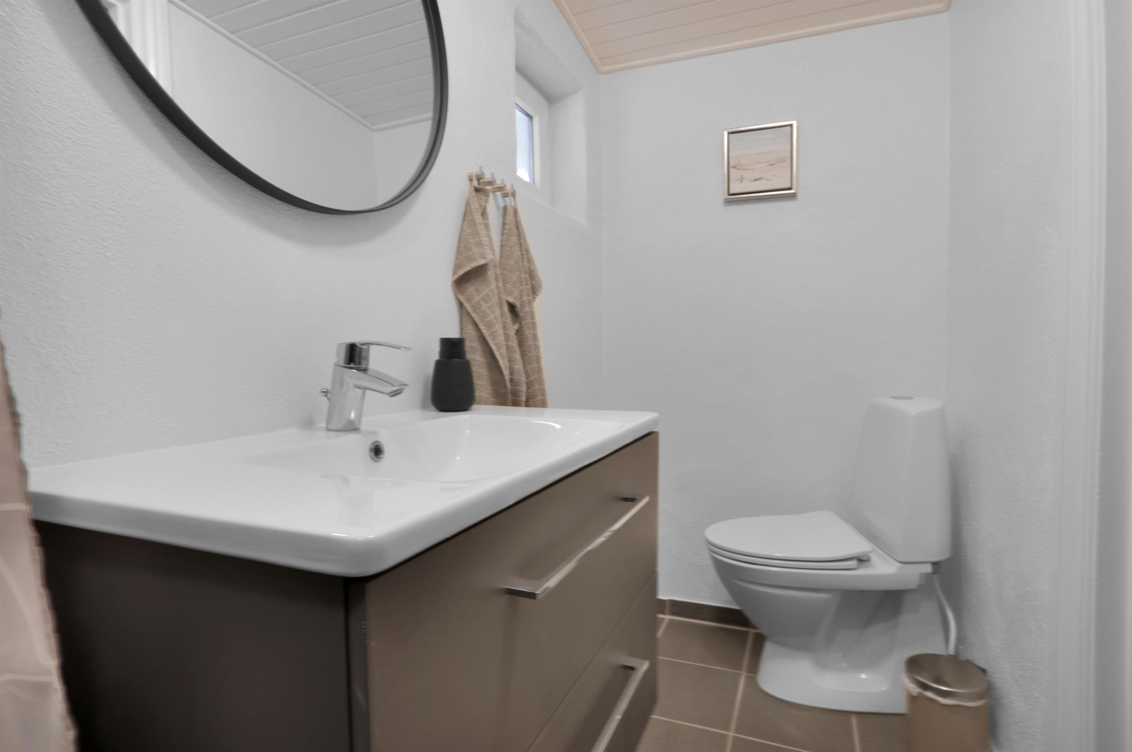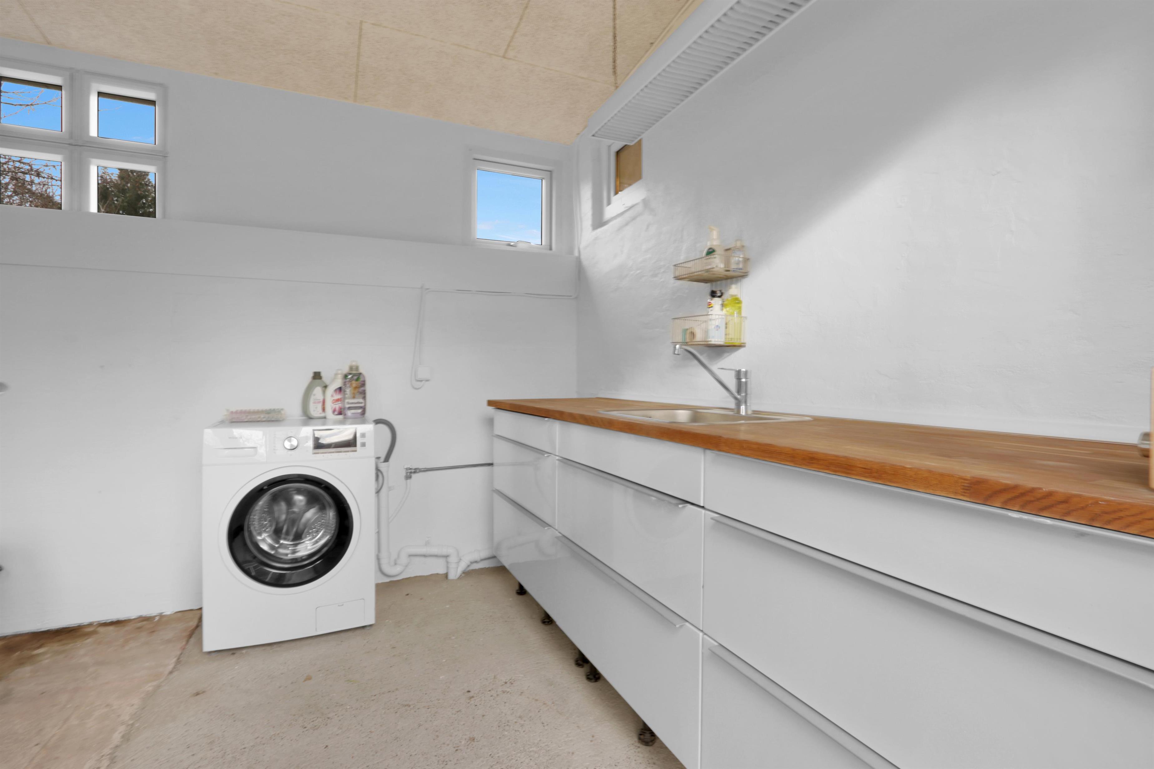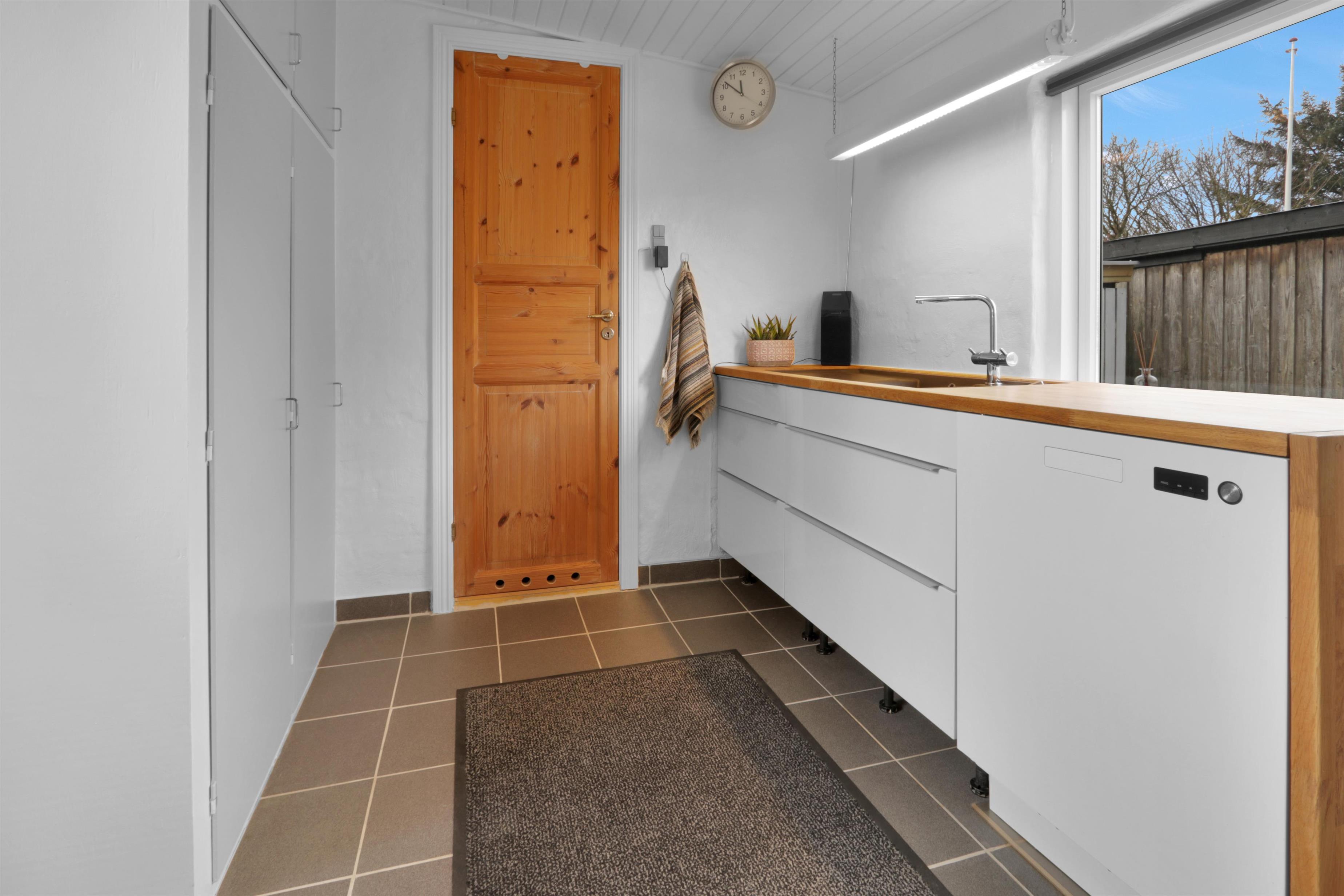 Husets velindrettede bryggers byder på ekstra bordplads, vask samt en praktisk vaskemaskine. Badeværelset er nyrenoveret i en moderne stil og indeholder herunder gulvvarme, toilet, bruser og samt håndvask.