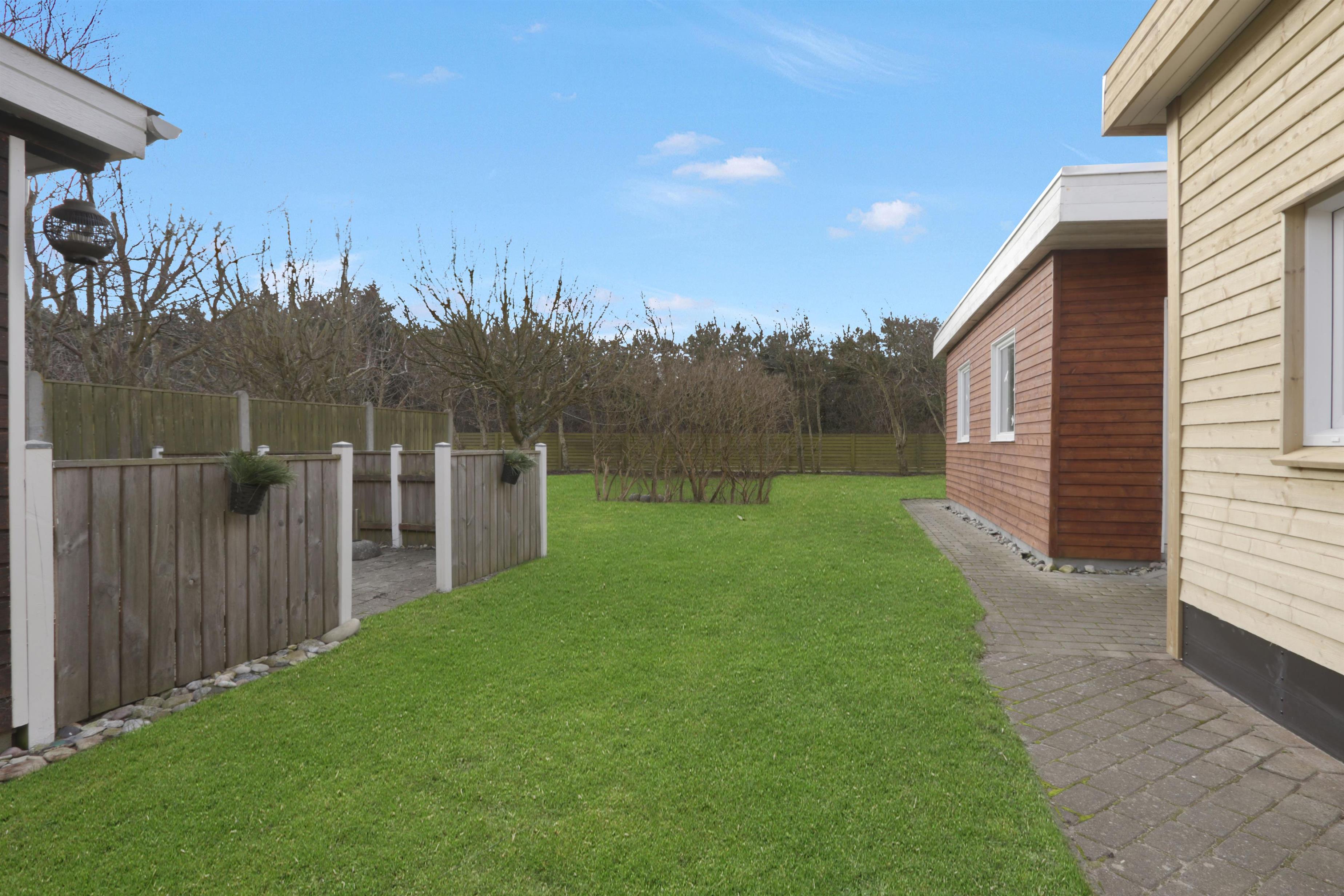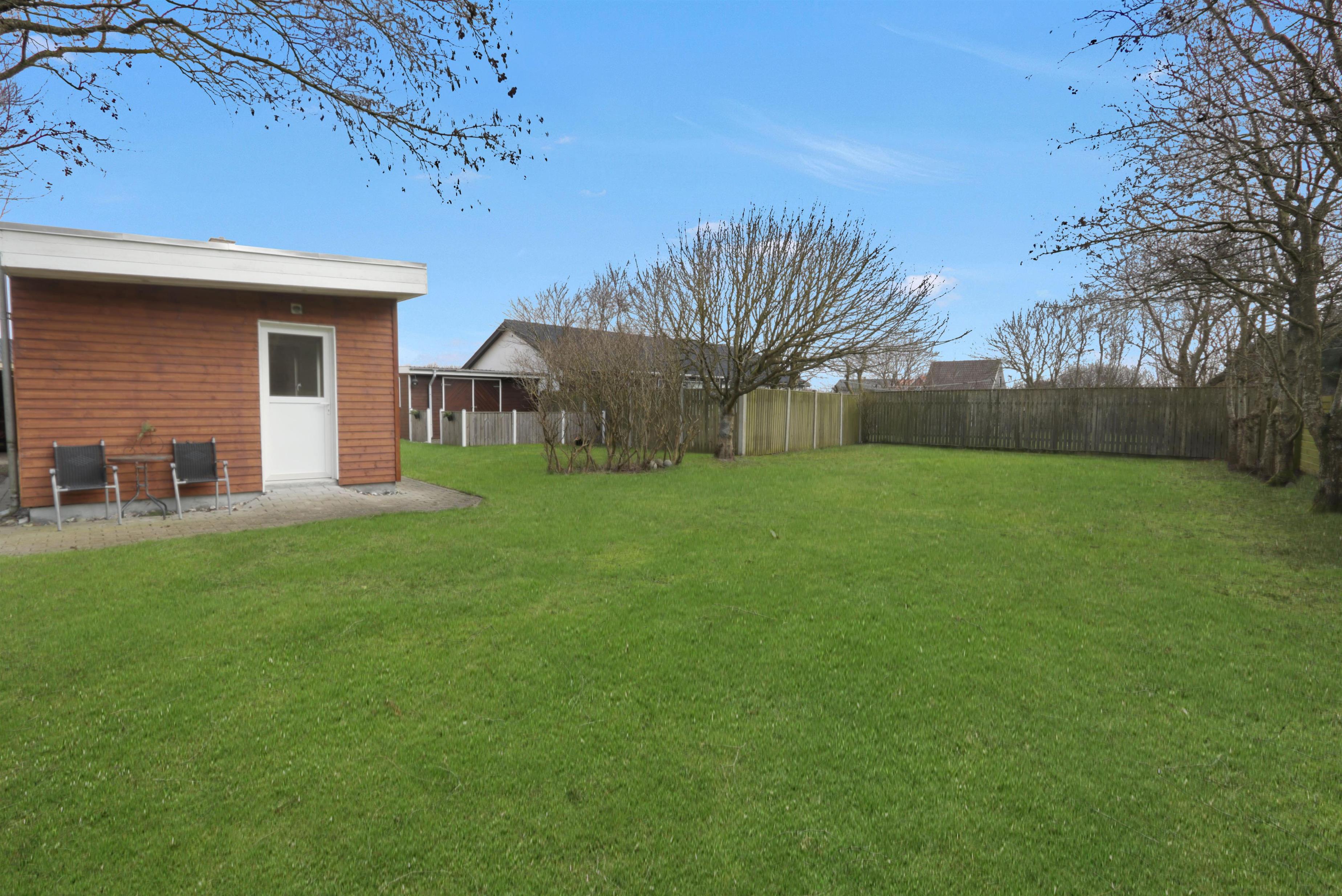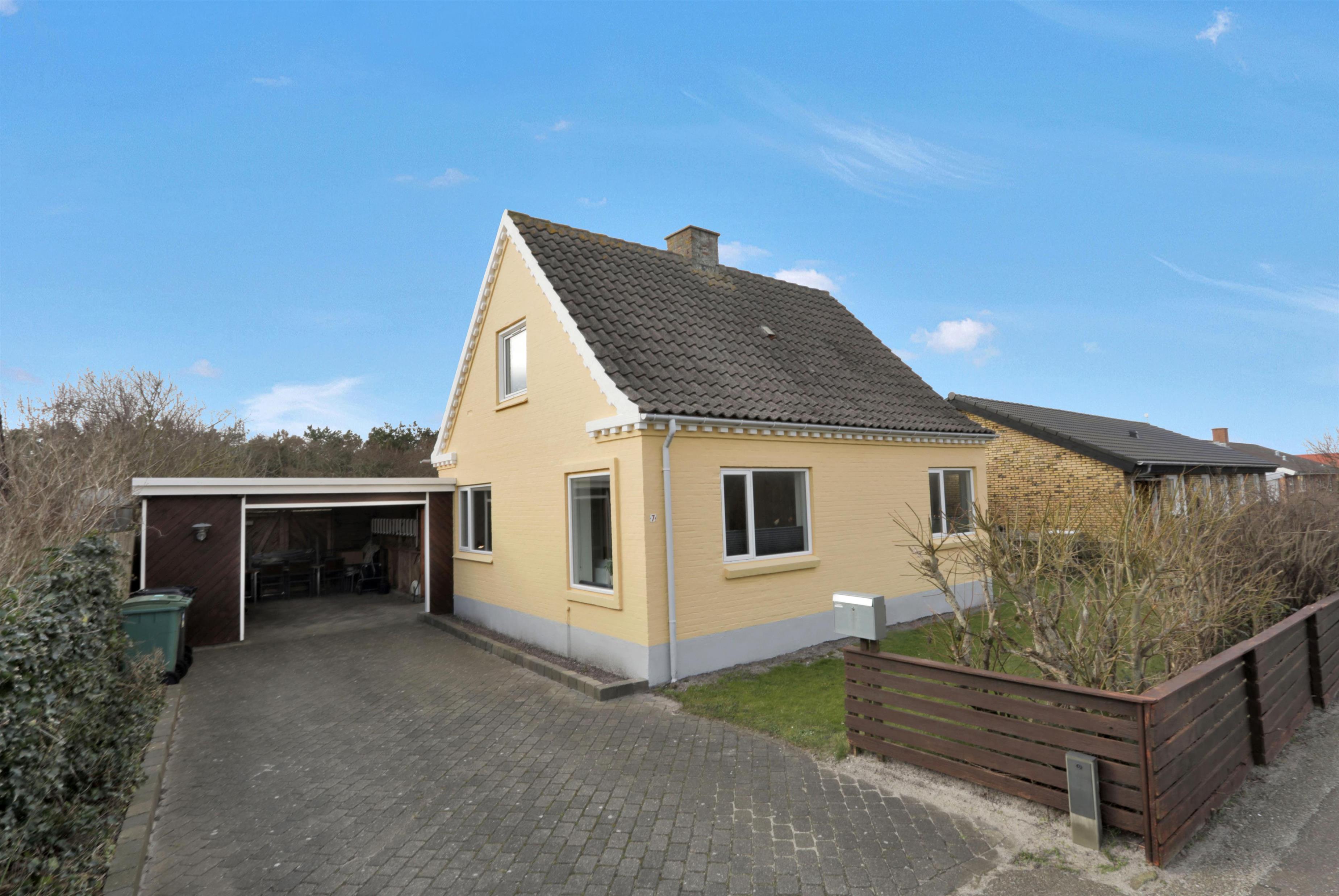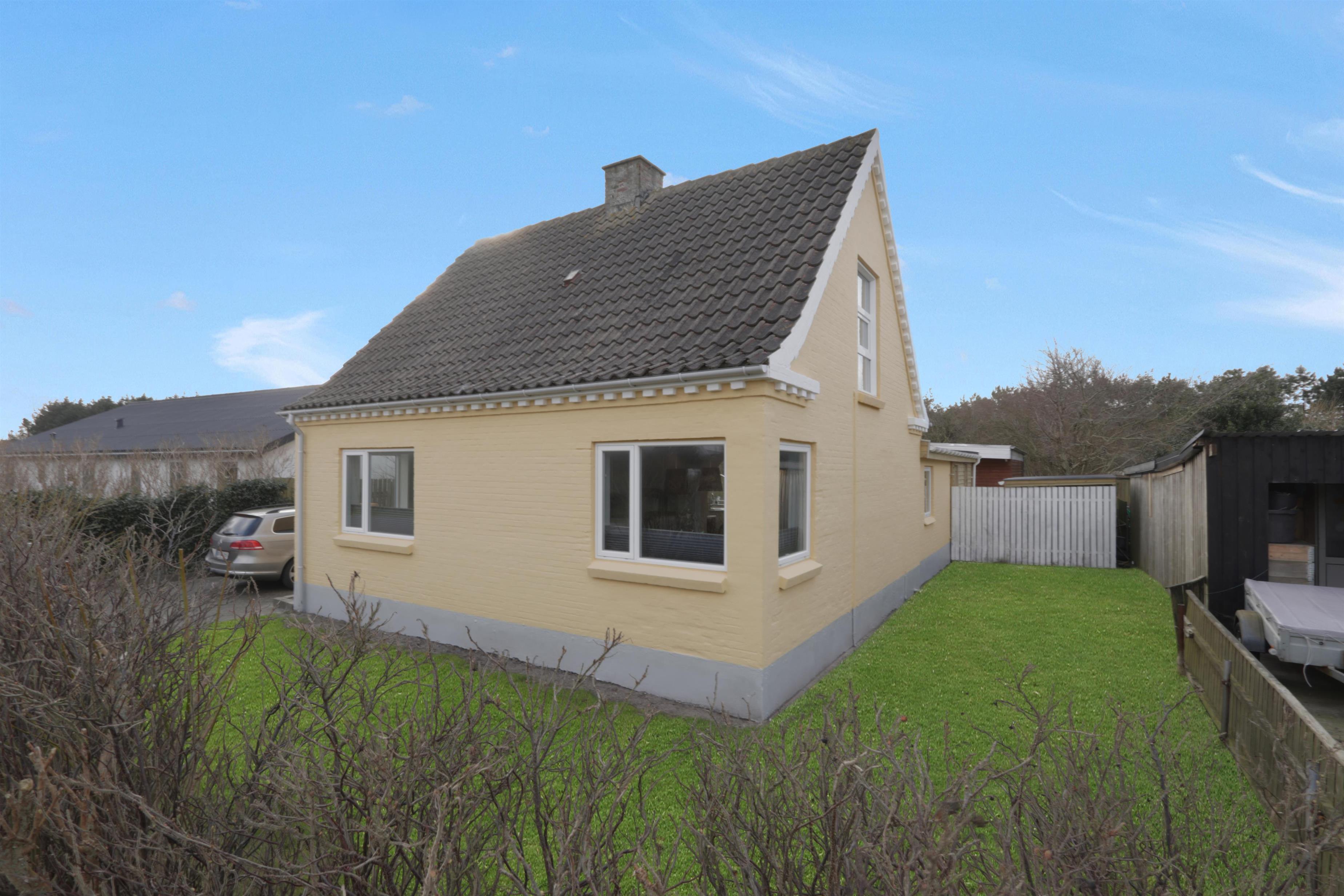 Den 747 m² store grund er indhegnet, hvilket giver masser af tryghed for både børn og hund. Den dejlige, lukkede terrasse er udstyret med komfortable havemøbler, grill og parasol – perfekt til afslappede stunder i solen. Bilen kan parkeres sikkert i carporten, og med kun få minutters gang til Vesterhavet er det nemt at tage på spontane strandture, uanset om det er for en dukkert, en gåtur i sandet eller for at nyde den smukke solnedgang.