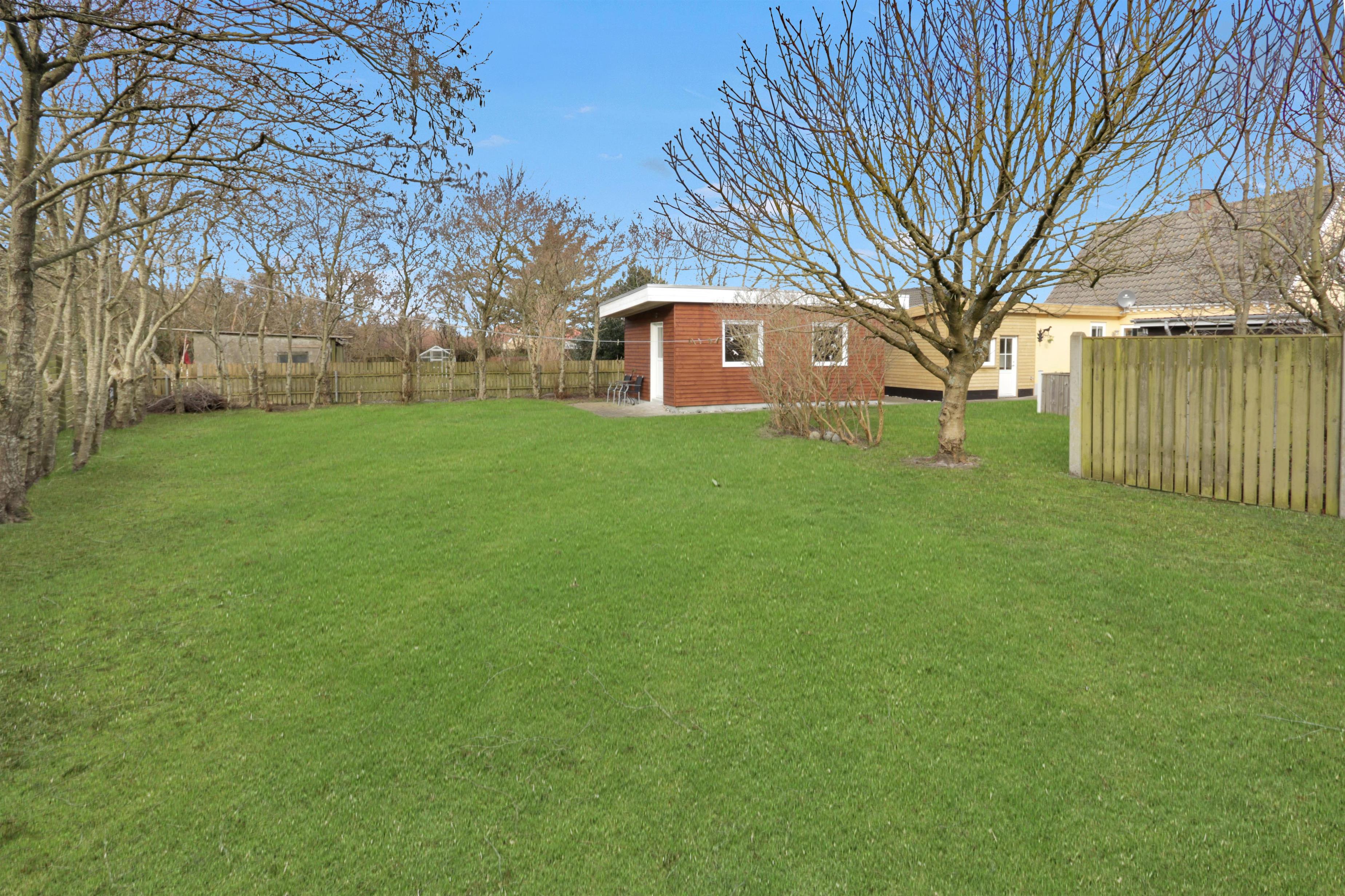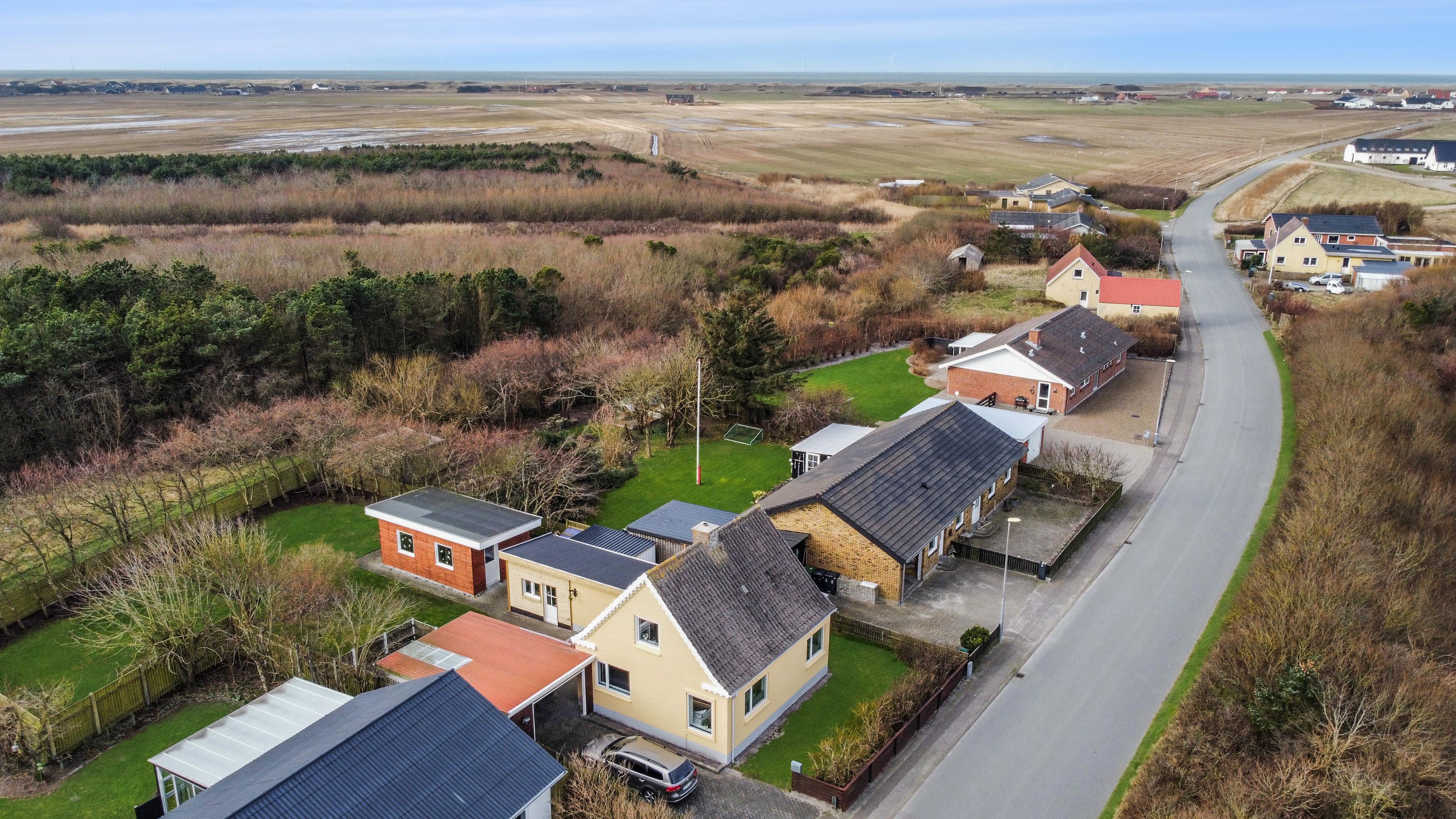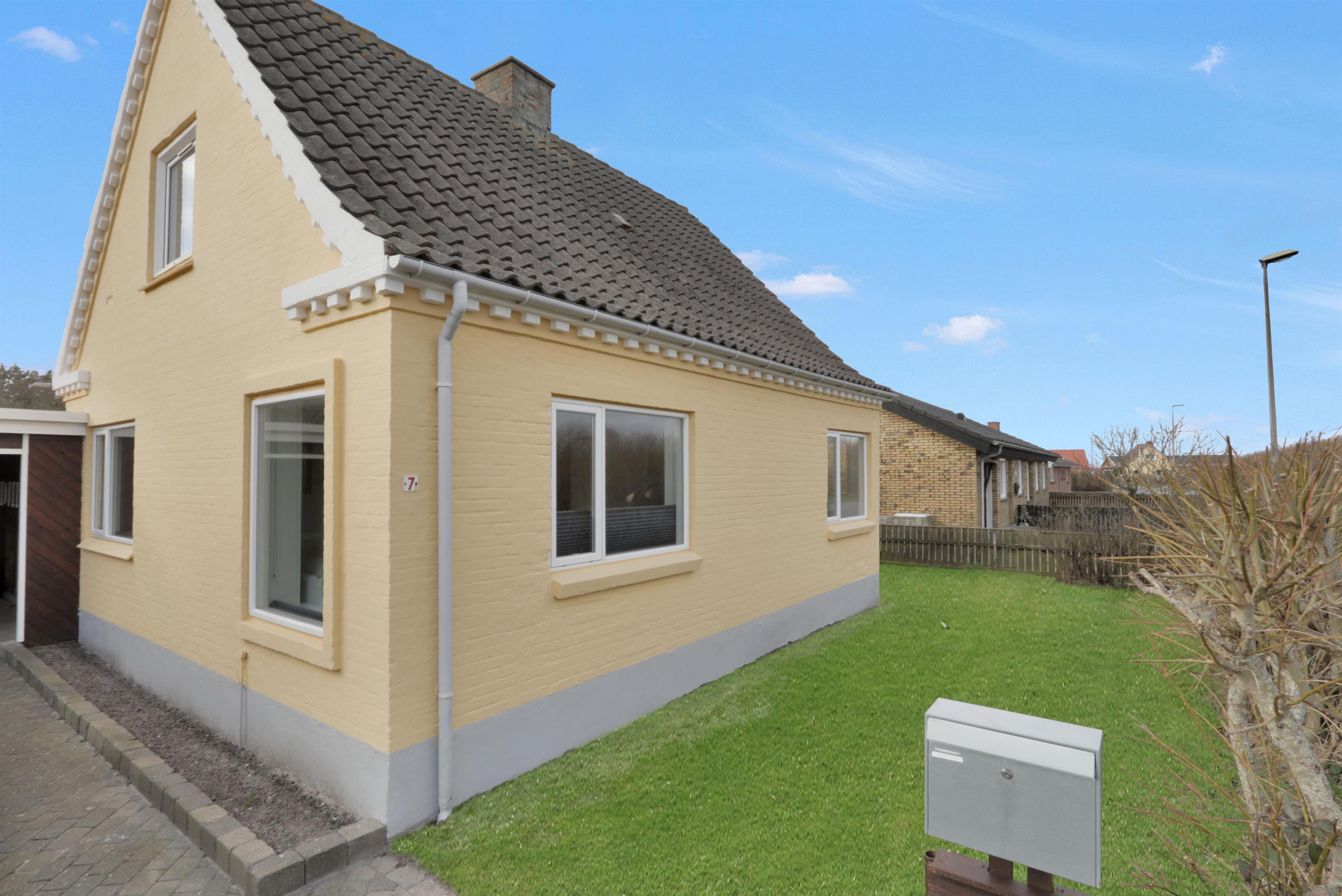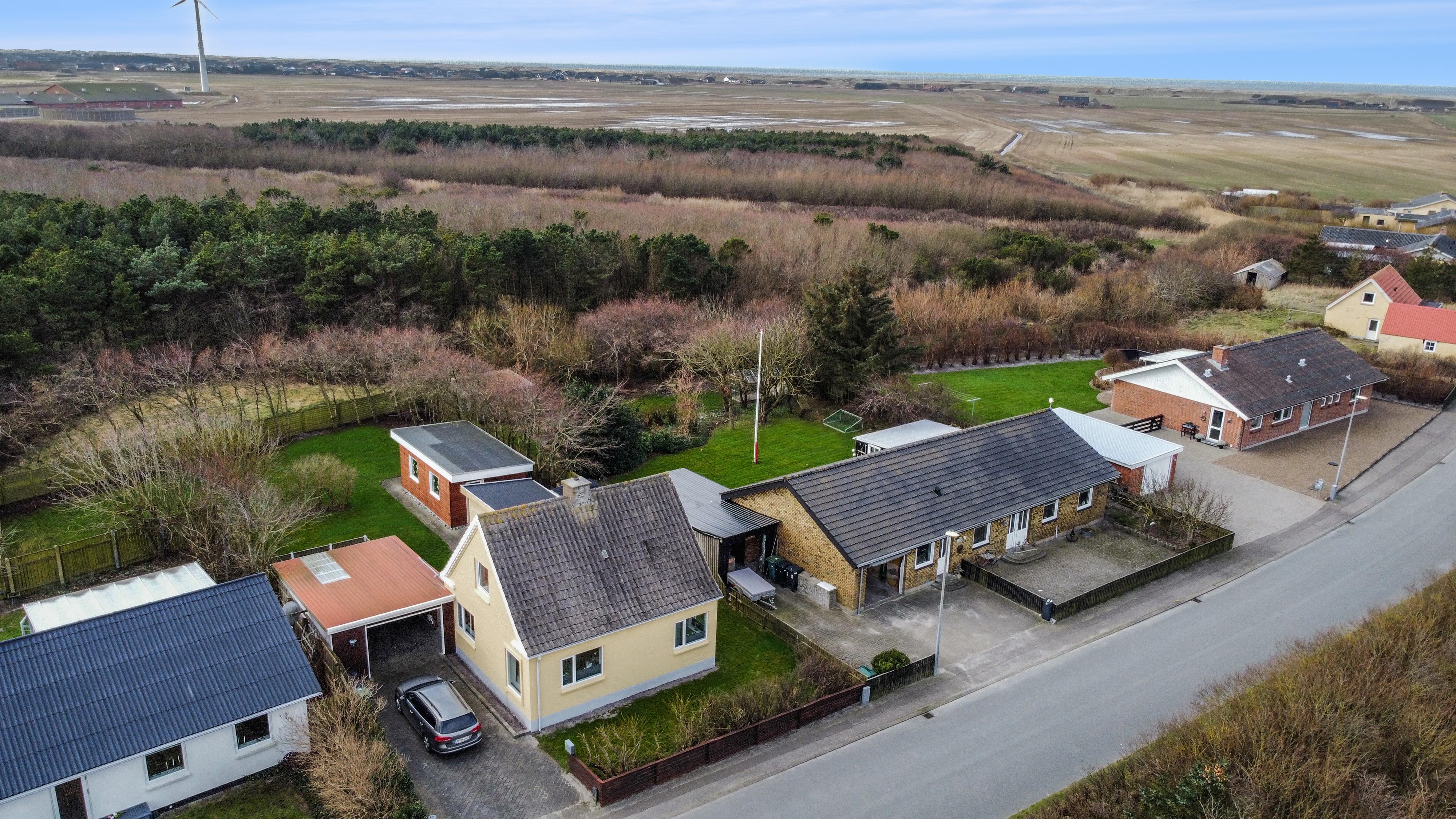 Den 747 m² store grund er indhegnet, hvilket giver masser af tryghed for både børn og hund. Den dejlige, lukkede terrasse er udstyret med komfortable havemøbler, grill og parasol – perfekt til afslappede stunder i solen. Bilen kan parkeres sikkert i carporten, og med kun få minutters gang til Vesterhavet er det nemt at tage på spontane strandture, uanset om det er for en dukkert, en gåtur i sandet eller for at nyde den smukke solnedgang.