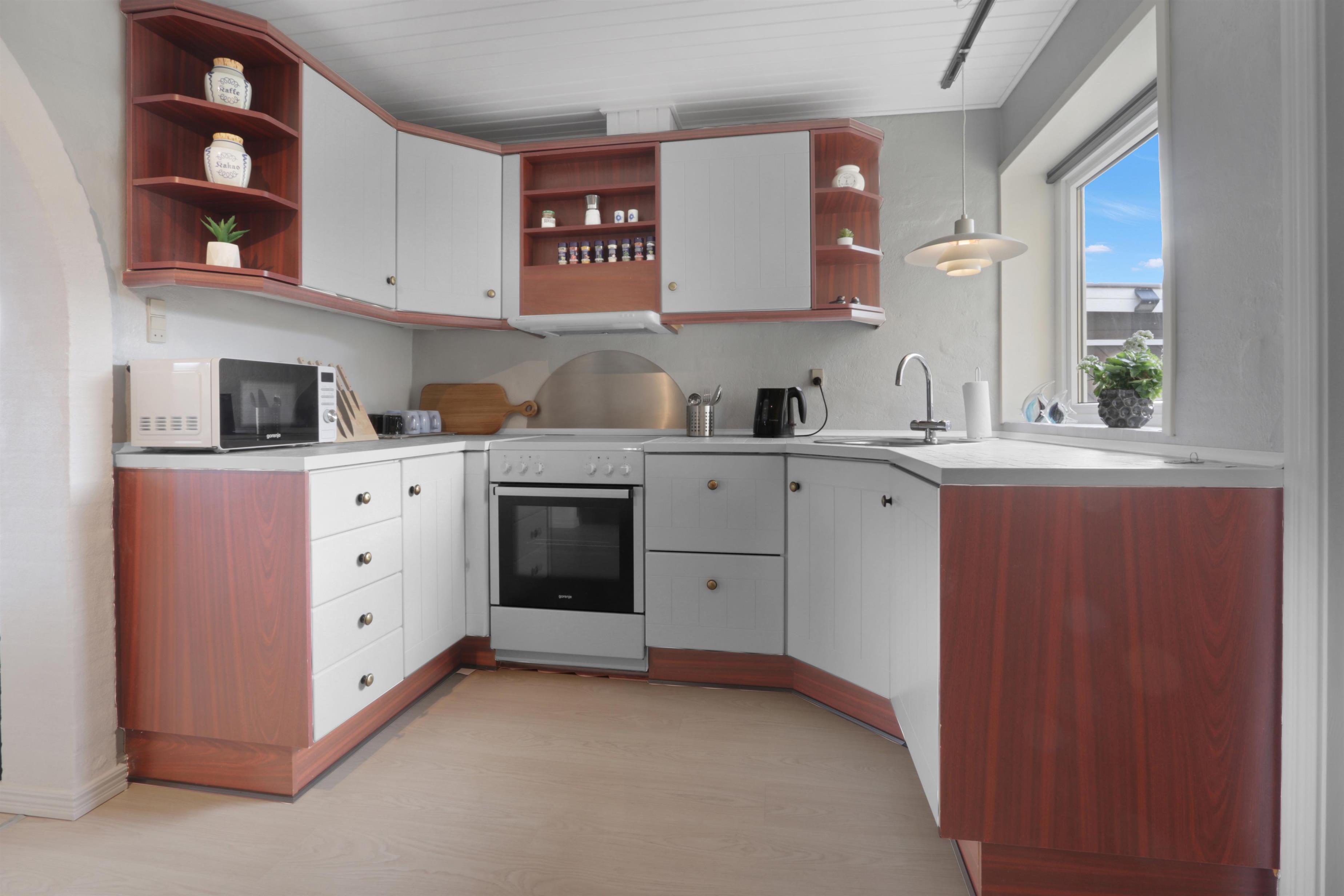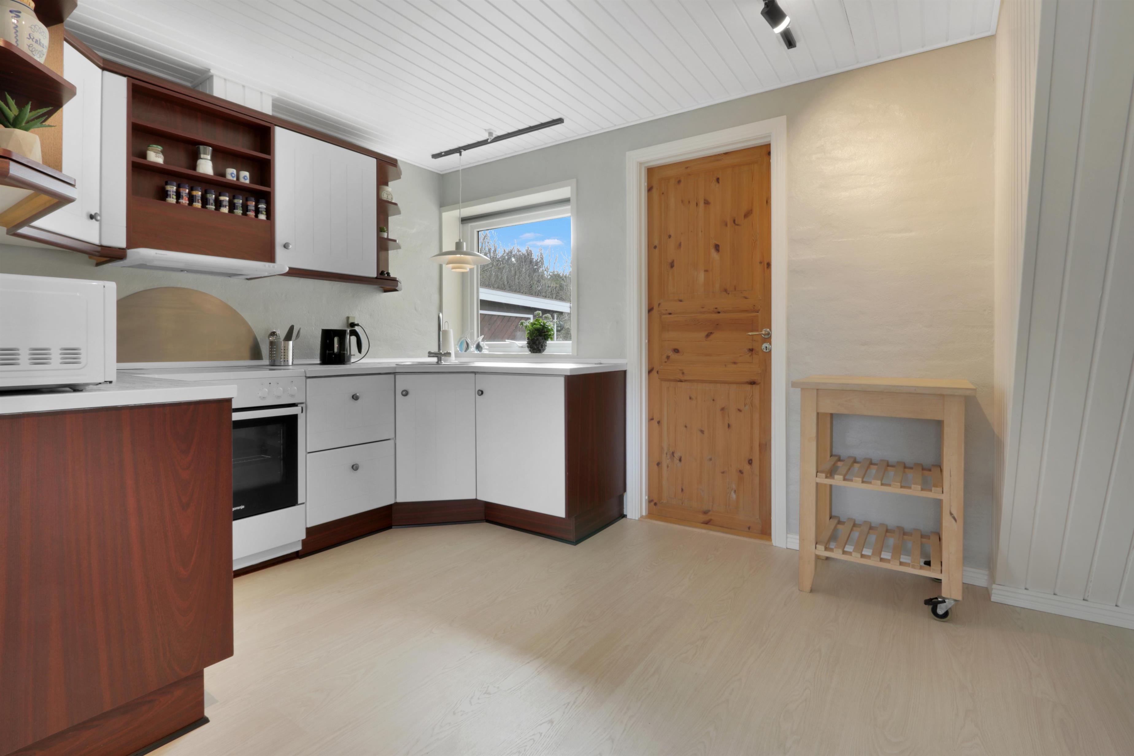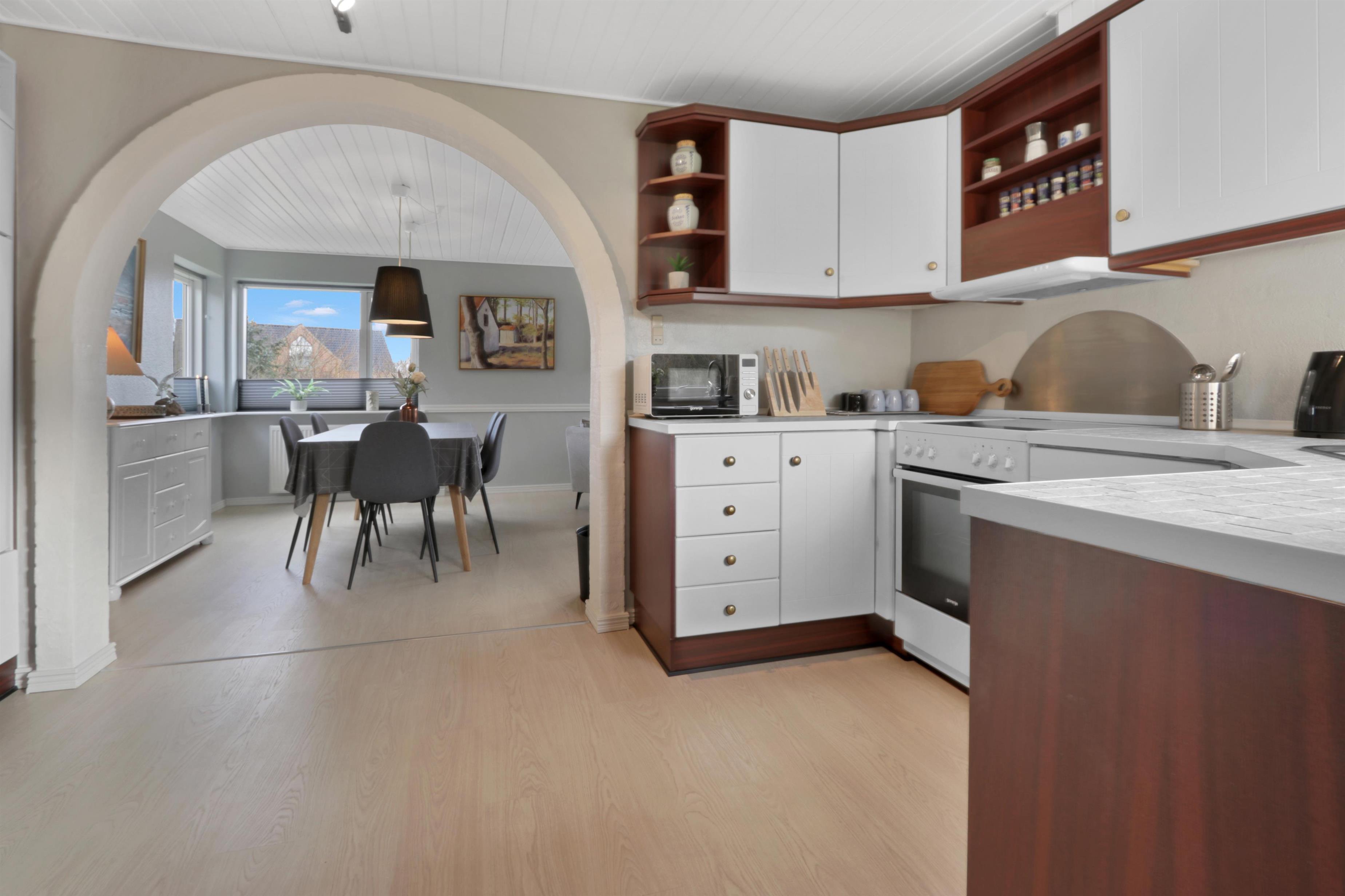 Køkkenet er lige ved siden af spiseområdet. Køkkenet er flot og funktionelt med alt, hvad du behøver: opvaskemaskine, glaskeramisk komfur, emhætte samt et køle-/fryseskab.