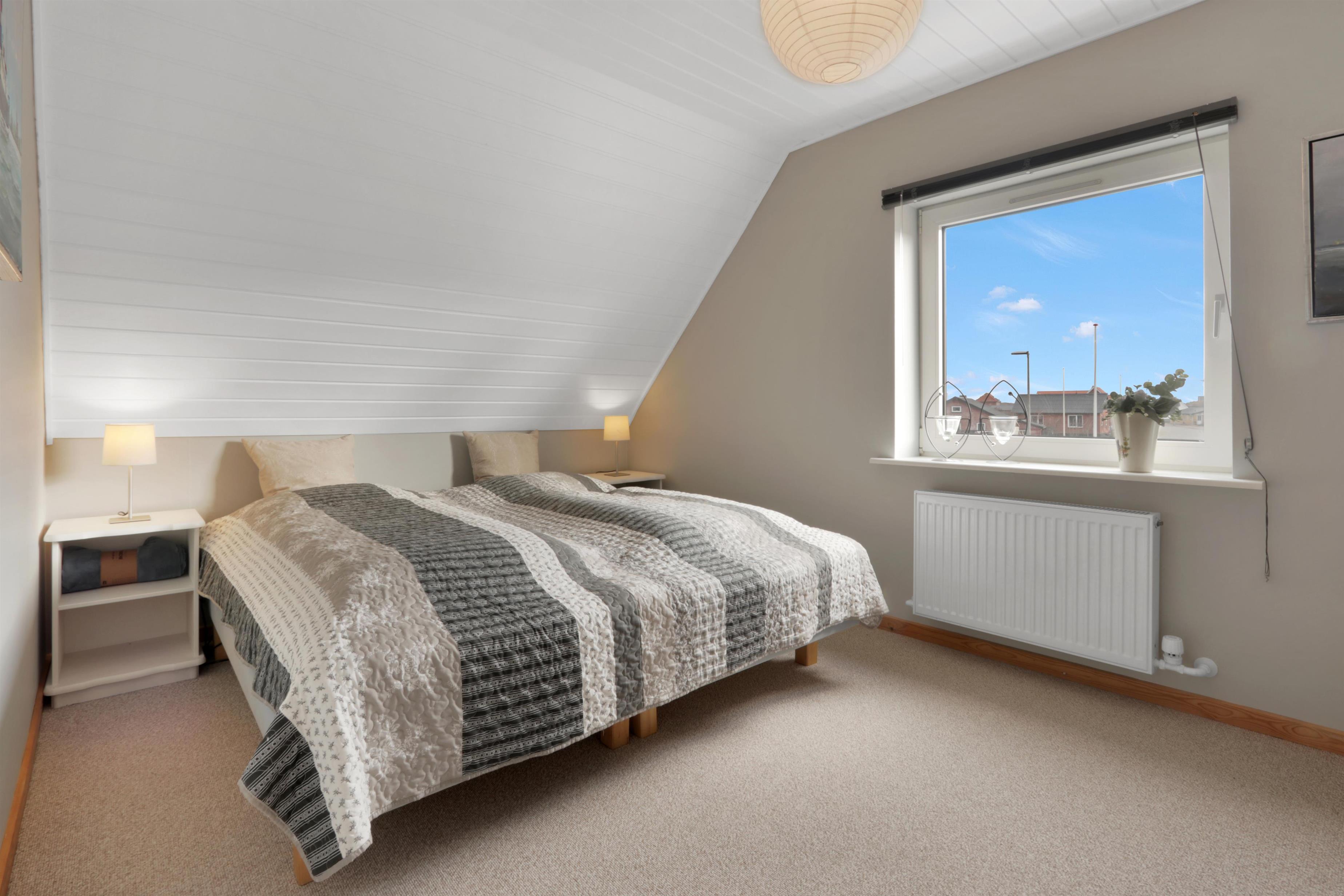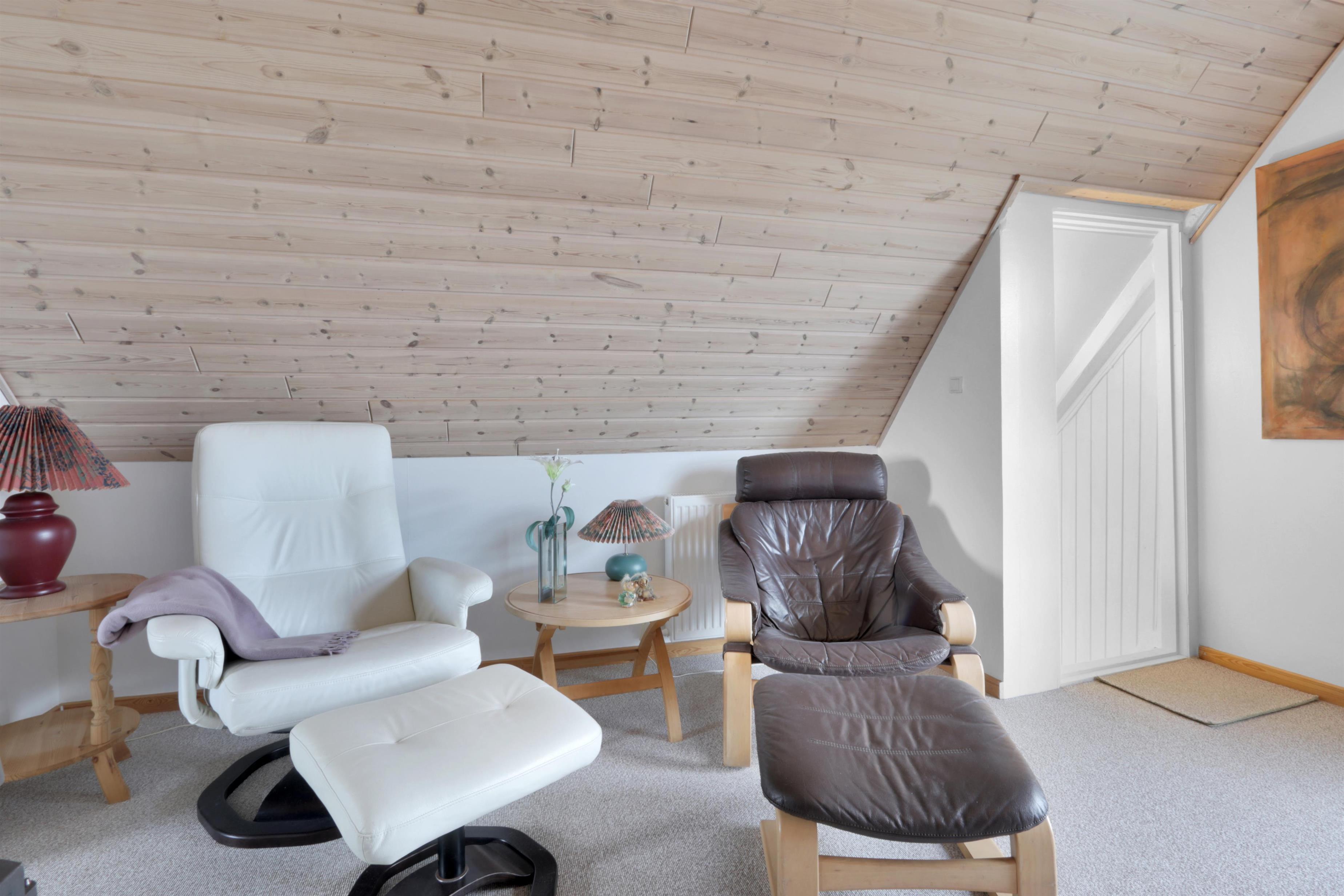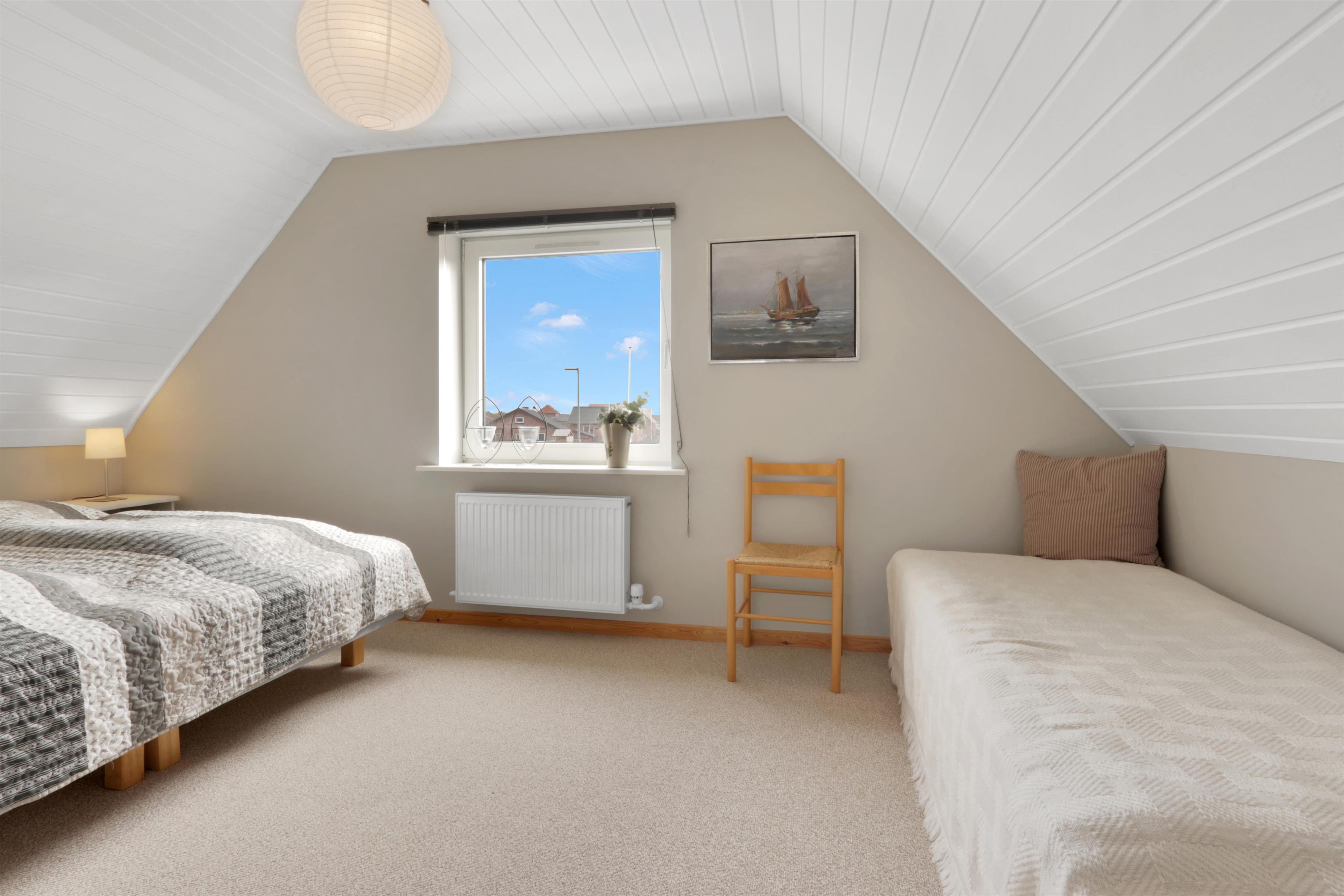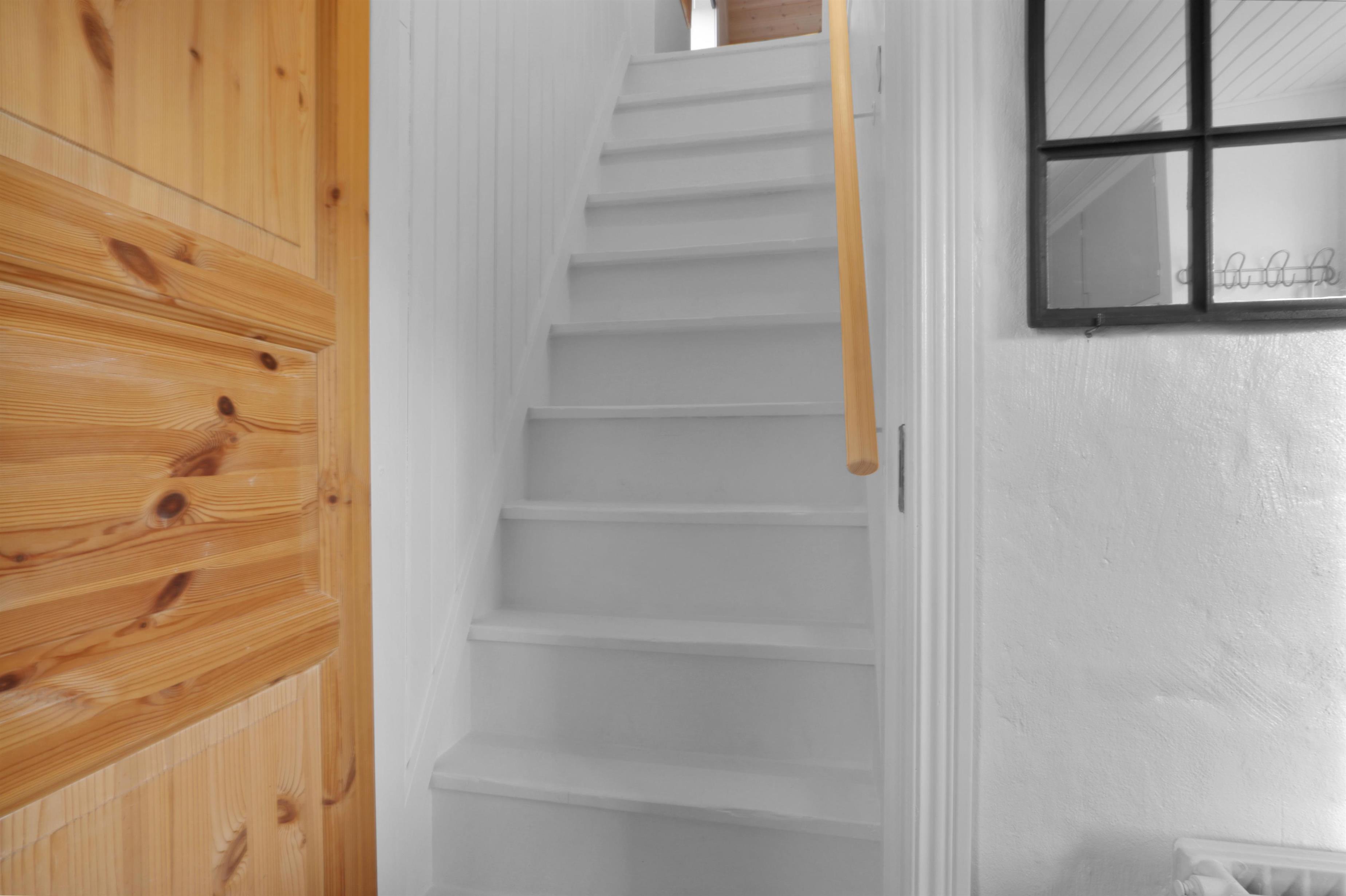 Fra gangen fører en charmerende, men stejl trappe op til 1. sal, hvor en ekstra hyggelig stue venter. Her kan du slappe af i polstrede møbler foran TV'et. På samme etage finder du også et skønt soveværelse med en dobbeltseng. I stueetagen ligger husets andet soveværelse – ligeledes med en dobbeltseng.