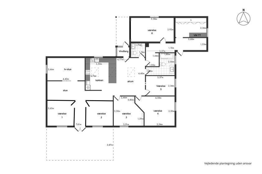 Huset har et fantastisk køkken/alrum med ovenlysvinduer der giver et godt lys i rummet samt hyggelig tv stue/biograf hvor alle kan slappe af med en god film. Huset har også stue med sofagruppe. I huset er der 2 toiletter med bad samt 6 soverum.