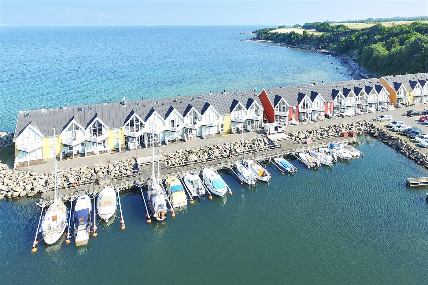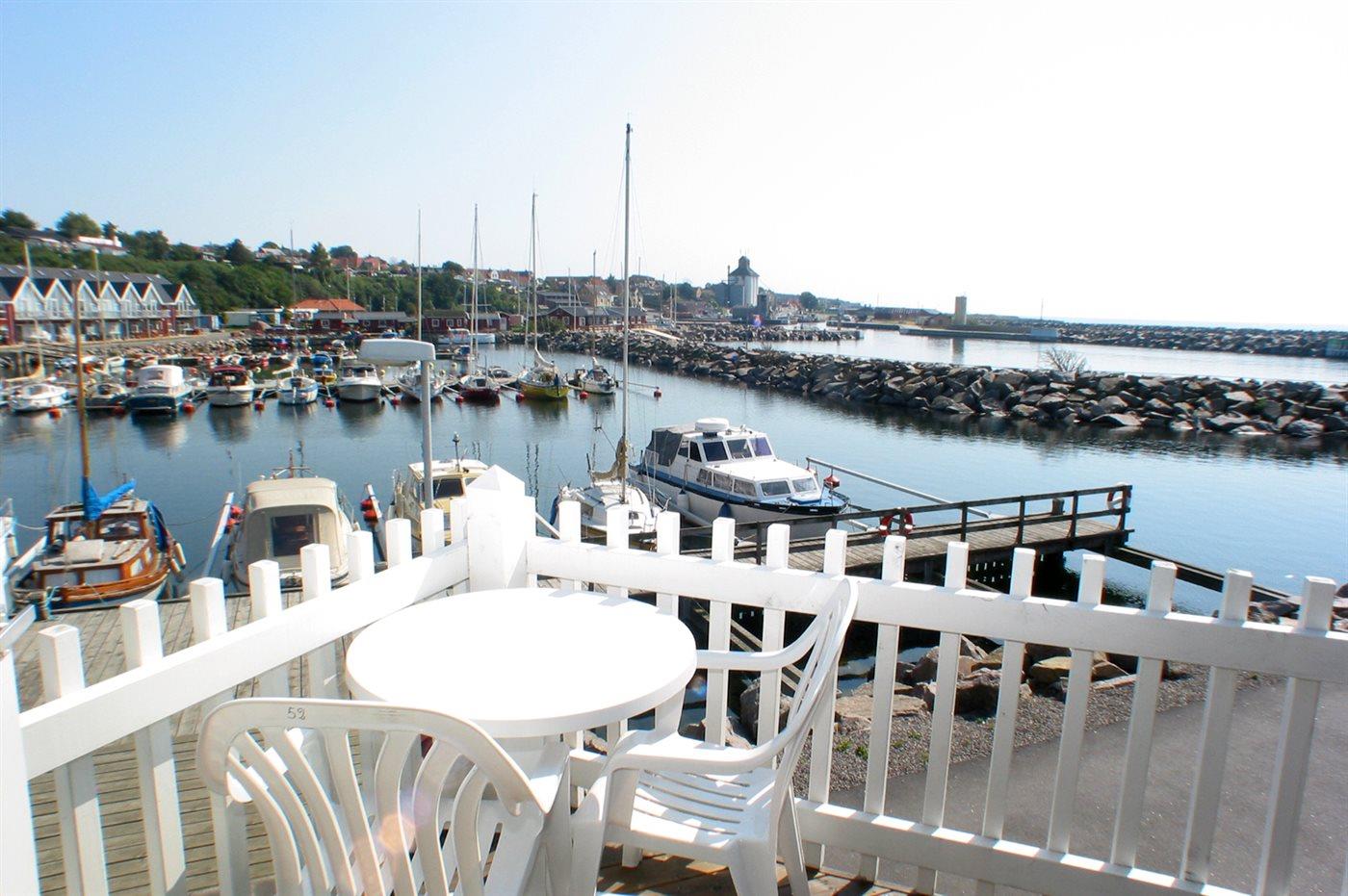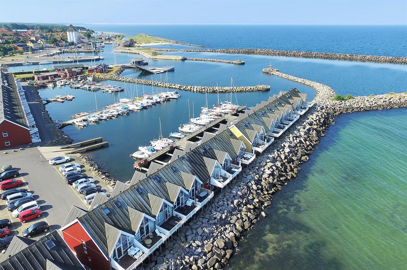 Lækkert, særpræget luksussommerhus i 2 etager med unik beliggenhed og storslået havudsigt. Opført i 2003. Huset ligger på en naturgrund med såvel klipper som kajareal. Balkon med udsigt over lystbådehavnen. Stor hævet træterrasse ud mod havet. Klinkegulv på stueplan, trægulve på 1. sal. I den store udsigts- og opholdsstue er der TV og parabol (digital) med tyske programmer, DVD-afspiller og radio med CD-afspiller. Brændeovn. Køkkenet indeholder komfur med keramiske kogeplader, opvaskemaskine, mikrobølgeovn, varmluftsovn og separat fryser. 2 badeværelser med gulvvarme og brusenicher. I det ene desuden en 2-pers. spa. vaskemaskine og tørretumbler. Af yderligere udstyr kan gratis, trådløs internetforbindelse nævnes (computer skal medbringes). 3 soveværelser med dobbeltsenge. Hems med 2 sovepladser (madrasser). Barnestol og barneseng. Et dejligt rækkesommerhus nær god badestrand og Hasle By, der byder på brostensbelagte gader, røgeri, kunstgalleri og et levende maritimt liv.