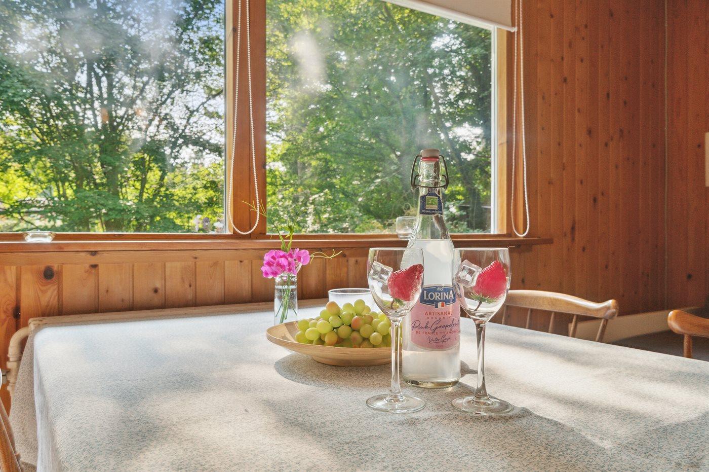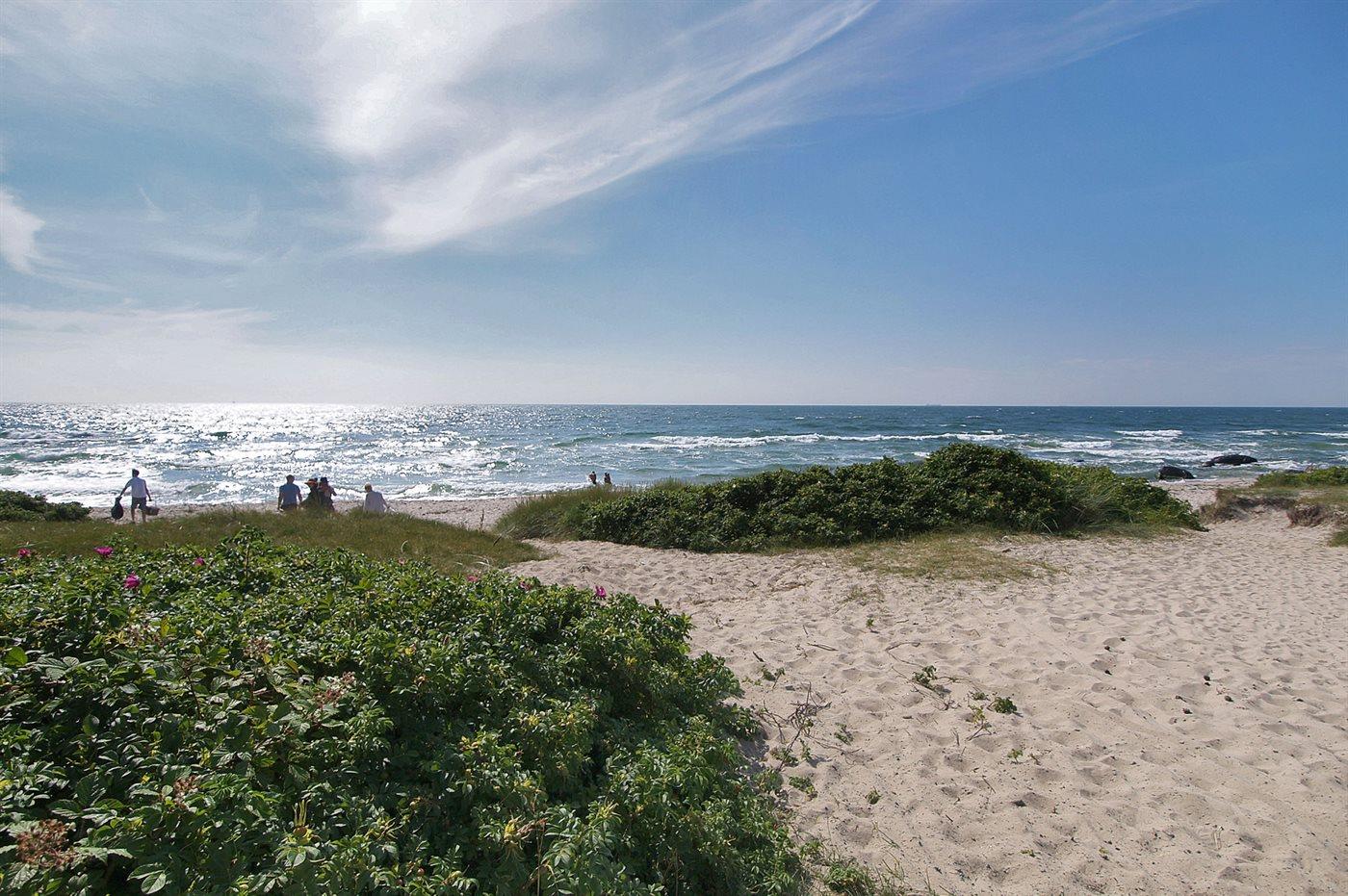 Pænt, lyst og venligt indrettet sommerhus beliggende på en grund med græs og god plads til leg og boldspil, tæt på havet og en herlig sandstrand.