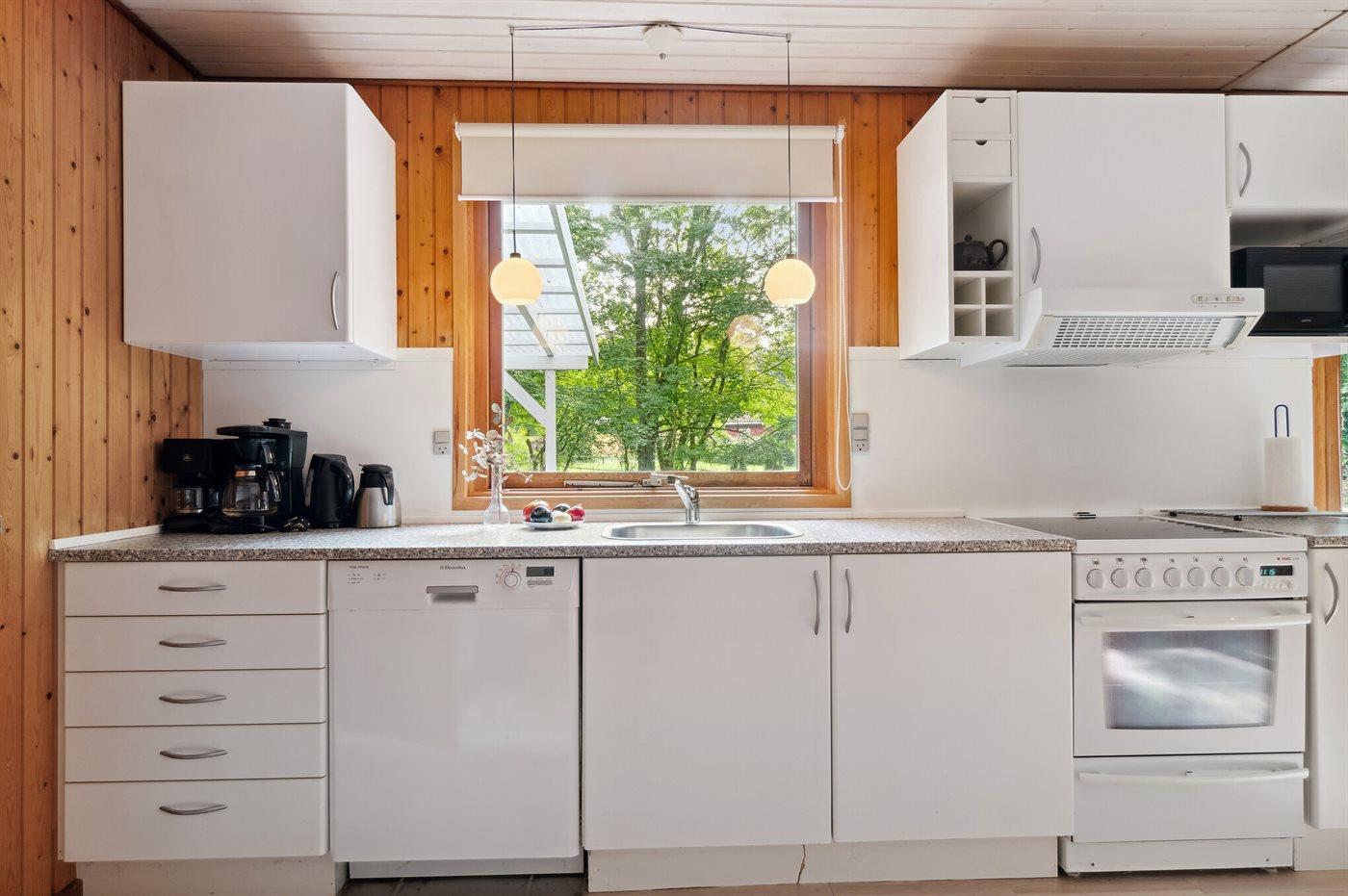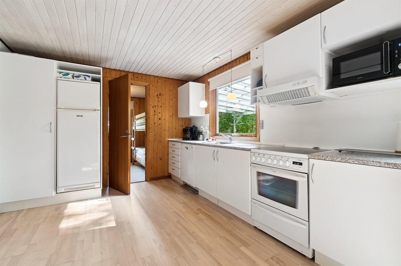 Køkkenet er udstyret med 1 køleskab. Der er 4 keramiske kogeplader, varmluftovn, mikrobølgeovn samt opvaskemaskine.