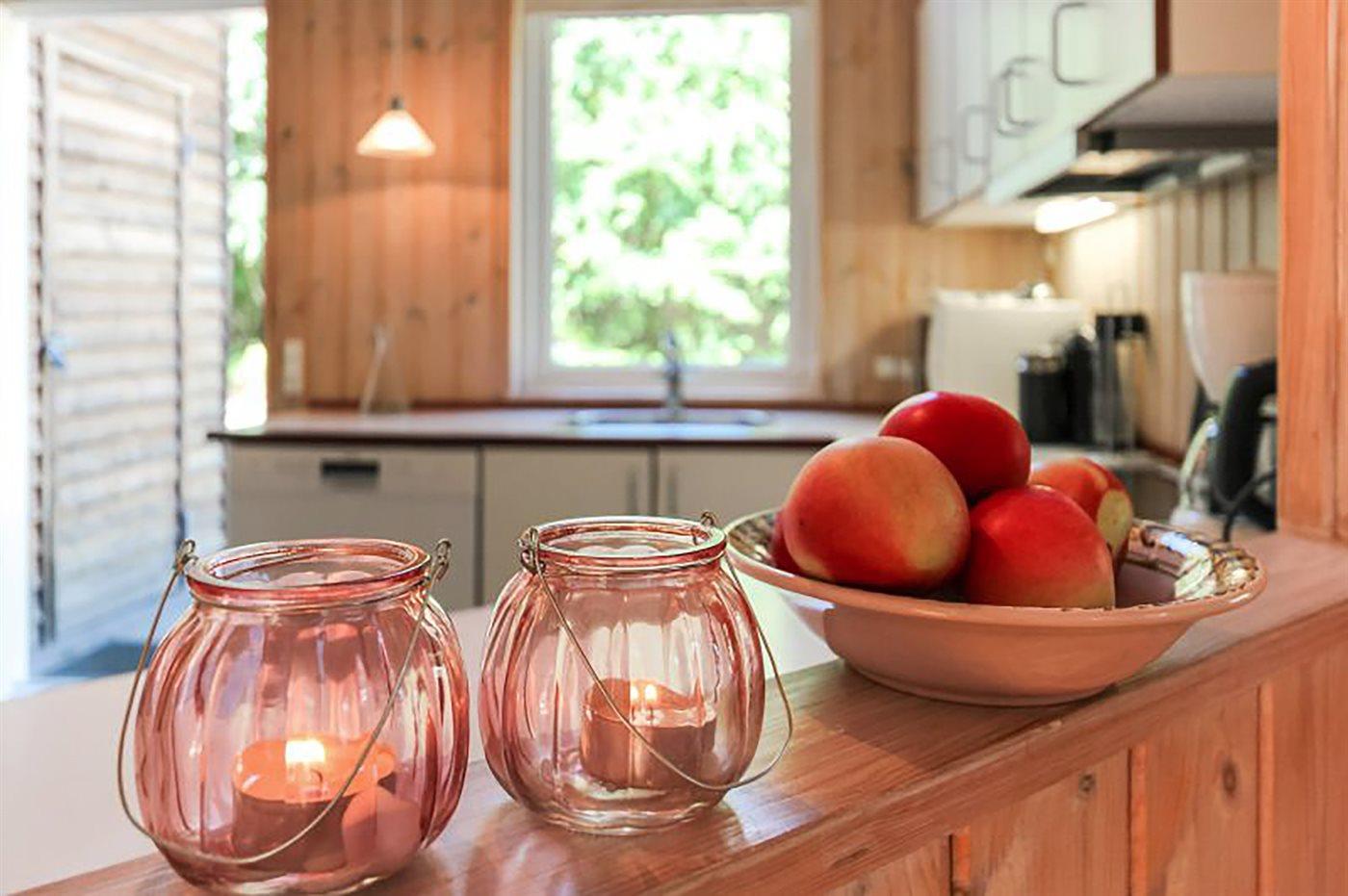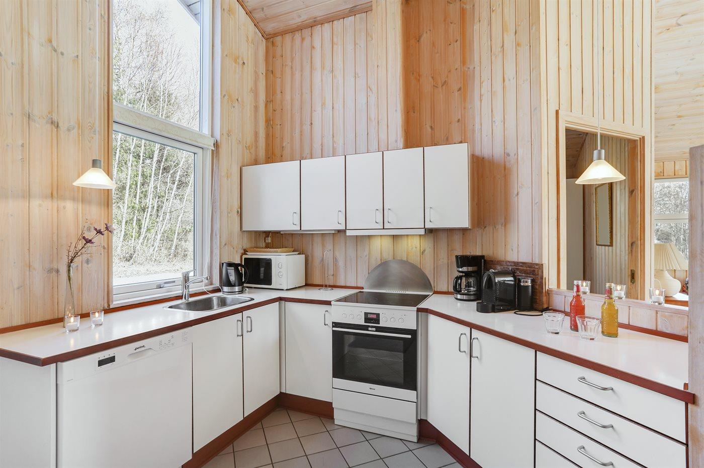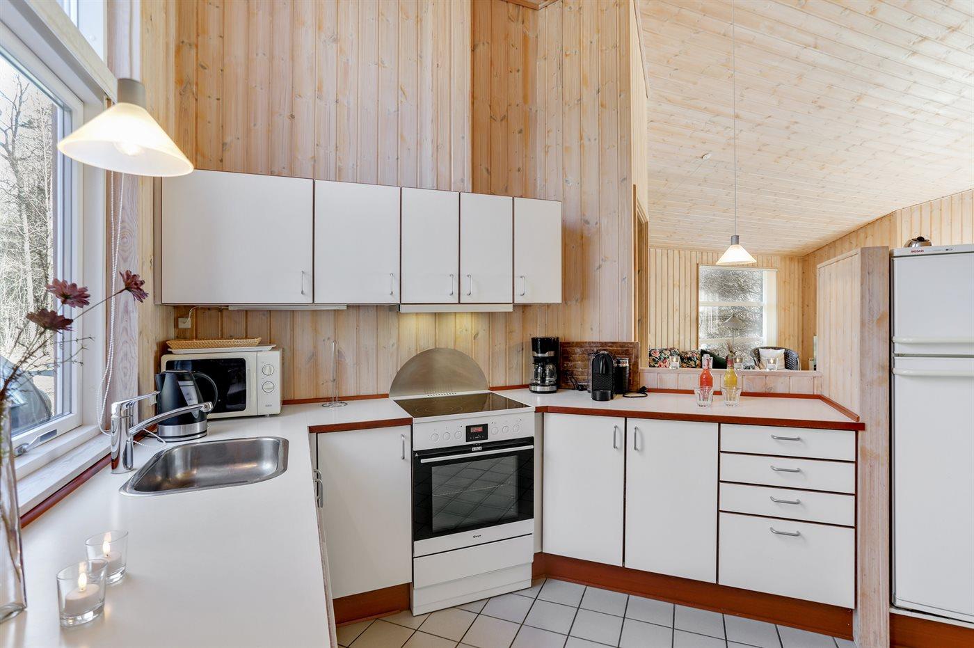 Køkkenet er udstyret med 1 køleskab. Der er 4 keramiske kogeplader, varmluftovn, mikrobølgeovn samt opvaskemaskine.