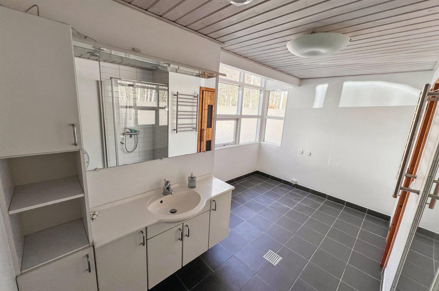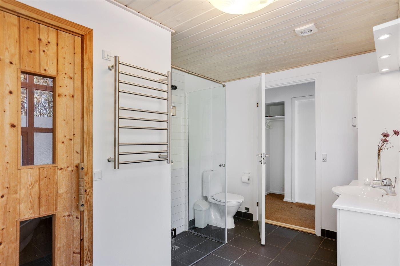 Der er 2 badeværelser med bruseniche og 2 toiletter. Der er gulvvarme på 2 badeværelser. I saunaen er der mulighed for afslapning.