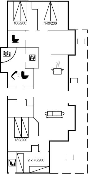 Der er i alt 4 soveværelser. Sovepladserne fordeler sig på: 2 sovepladser i enkeltsenge, hvor den ene er en elevationsseng. 6 sovepladser i dobbeltsenge, hvor den ene rum har elevationssenge. Derudover er der 1 stk. barneseng. Køkkenet er udstyret med 1 køleskab. Der er 4 keramiske kogeplader, varmluftovn, mikrobølgeovn samt opvaskemaskine.