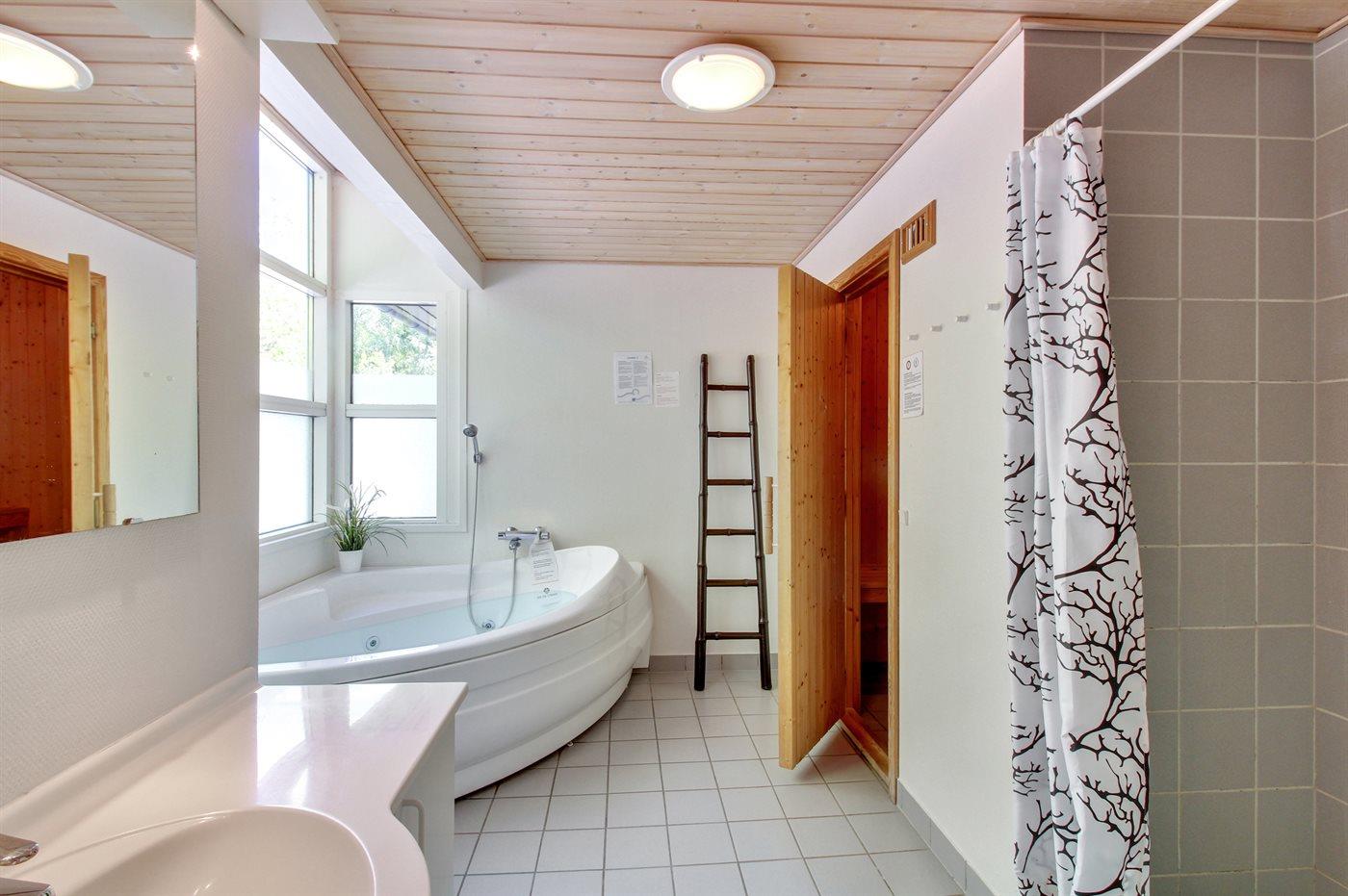 Der er 1 badeværelse med bruseniche og 2 toiletter, heraf 1 gæstetoilet. Der er gulvvarme på 1 badeværelse. I saunaen er der mulighed for afslapning.