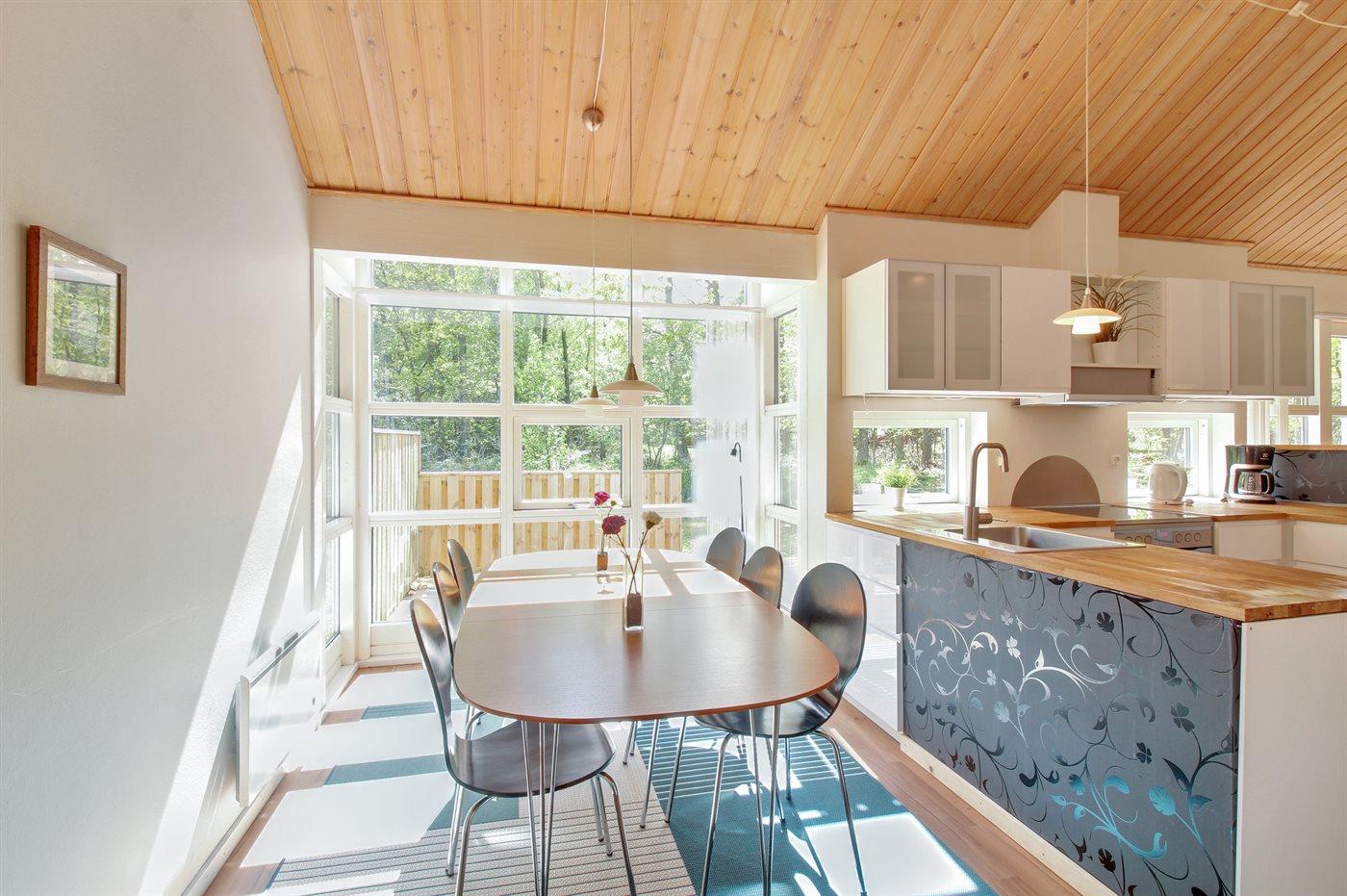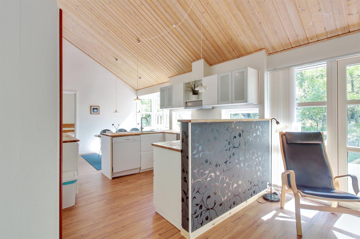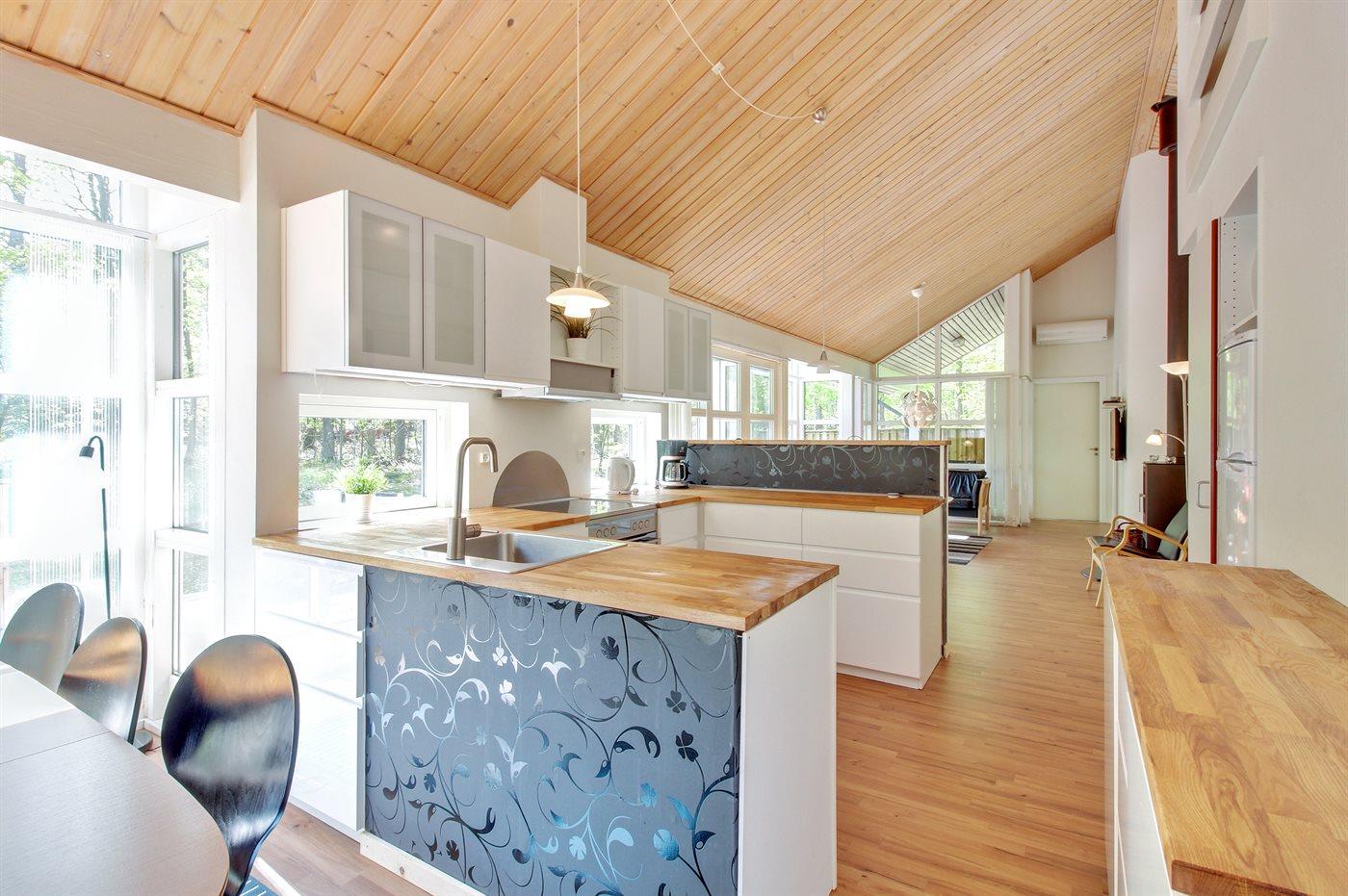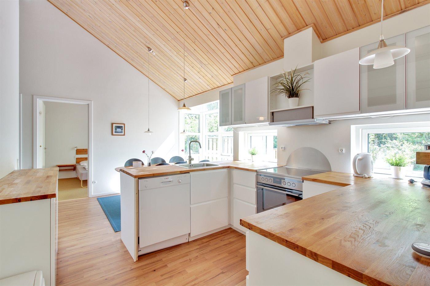 Køkkenet er udstyret med 1 køleskab. Der er 4 keramiske kogeplader, varmluftovn, mikrobølgeovn samt opvaskemaskine.
